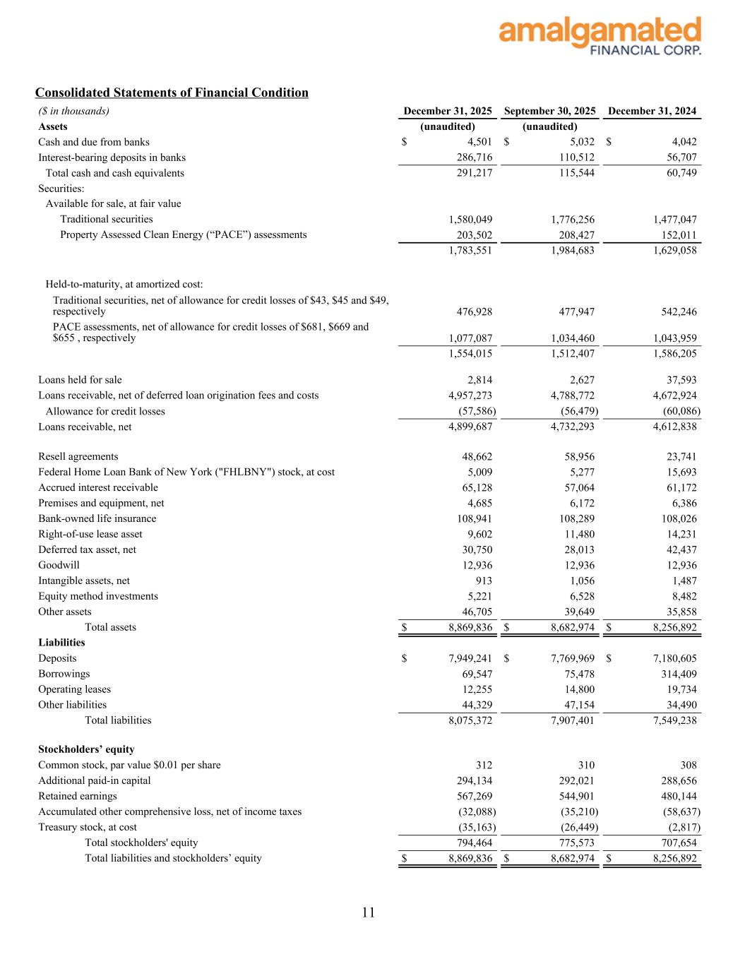 Consolidated Statements of Financial Condition ($ in thousands) December 31, 2025 September 30, 2025 December 31, 2024 Assets (unaudited) (unaudited) Cash and due from banks $ 4,501 $ 5,032 $ 4,042 Interest-bearing deposits in banks 286,716 110,512 56,707 Total cash and cash equivalents 291,217 115,544 60,749 Securities: Available for sale, at fair value Traditional securities 1,580,049 1,776,256 1,477,047 Property Assessed Clean Energy (“PACE”) assessments 203,502 208,427 152,011 1,783,551 1,984,683 1,629,058 Held-to-maturity, at amortized cost: Traditional securities, net of allowance for credit losses of $43, $45 and $49, respectively 476,928 477,947 542,246 PACE assessments, net of allowance for credit losses of $681, $669 and $655 , respectively 1,077,087 1,034,460 1,043,959 1,554,015 1,512,407 1,586,205 Loans held for sale 2,814 2,627 37,593 Loans receivable, net of deferred loan origination fees and costs 4,957,273 4,788,772 4,672,924 Allowance for credit losses (57,586) (56,479) (60,086) Loans receivable, net 4,899,687 4,732,293 4,612,838 Resell agreements 48,662 58,956 23,741 Federal Home Loan Bank of New York ("FHLBNY") stock, at cost 5,009 5,277 15,693 Accrued interest receivable 65,128 57,064 61,172 Premises and equipment, net 4,685 6,172 6,386 Bank-owned life insurance 108,941 108,289 108,026 Right-of-use lease asset 9,602 11,480 14,231 Deferred tax asset, net 30,750 28,013 42,437 Goodwill 12,936 12,936 12,936 Intangible assets, net 913 1,056 1,487 Equity method investments 5,221 6,528 8,482 Other assets 46,705 39,649 35,858 Total assets $ 8,869,836 $ 8,682,974 $ 8,256,892 Liabilities Deposits $ 7,949,241 $ 7,769,969 $ 7,180,605 Borrowings 69,547 75,478 314,409 Operating leases 12,255 14,800 19,734 Other liabilities 44,329 47,154 34,490 Total liabilities 8,075,372 7,907,401 7,549,238 Stockholders’ equity Common stock, par value $0.01 per share 312 310 308 Additional paid-in capital 294,134 292,021 288,656 Retained earnings 567,269 544,901 480,144 Accumulated other comprehensive loss, net of income taxes (32,088) (35,210) (58,637) Treasury stock, at cost (35,163) (26,449) (2,817) Total stockholders' equity 794,464 775,573 707,654 Total liabilities and stockholders’ equity $ 8,869,836 $ 8,682,974 $ 8,256,892 11