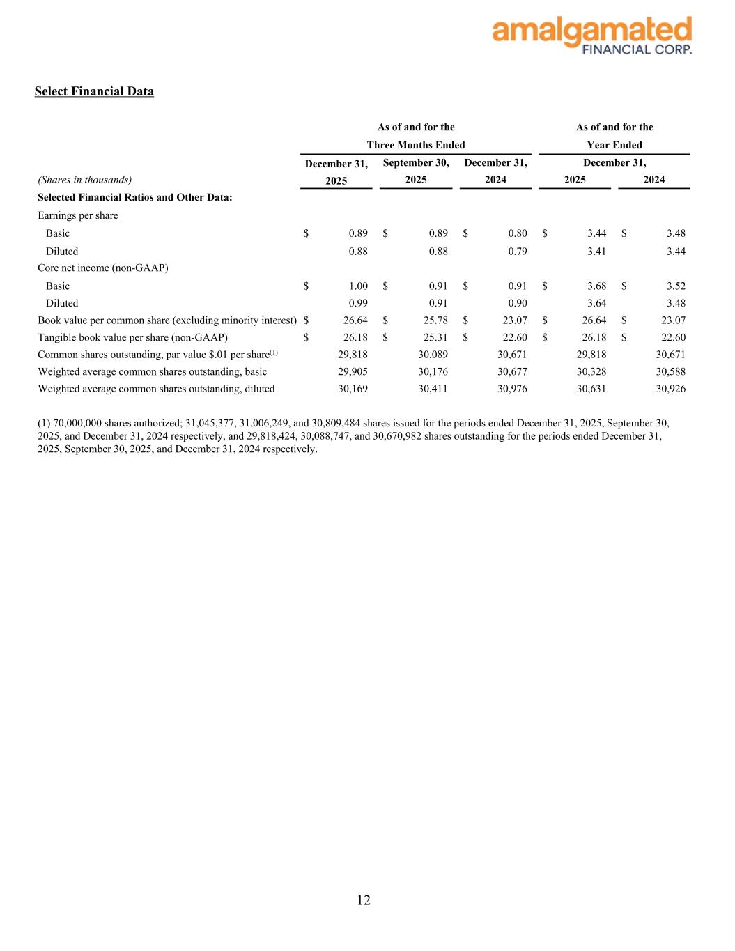 Select Financial Data As of and for the As of and for the Three Months Ended Year Ended December 31, September 30, December 31, December 31, (Shares in thousands) 2025 2025 2024 2025 2024 Selected Financial Ratios and Other Data: Earnings per share Basic $ 0.89 $ 0.89 $ 0.80 $ 3.44 $ 3.48 Diluted 0.88 0.88 0.79 3.41 3.44 Core net income (non-GAAP) Basic $ 1.00 $ 0.91 $ 0.91 $ 3.68 $ 3.52 Diluted 0.99 0.91 0.90 3.64 3.48 Book value per common share (excluding minority interest) $ 26.64 $ 25.78 $ 23.07 $ 26.64 $ 23.07 Tangible book value per share (non-GAAP) $ 26.18 $ 25.31 $ 22.60 $ 26.18 $ 22.60 Common shares outstanding, par value $.01 per share(1) 29,818 30,089 30,671 29,818 30,671 Weighted average common shares outstanding, basic 29,905 30,176 30,677 30,328 30,588 Weighted average common shares outstanding, diluted 30,169 30,411 30,976 30,631 30,926 (1) 70,000,000 shares authorized; 31,045,377, 31,006,249, and 30,809,484 shares issued for the periods ended December 31, 2025, September 30, 2025, and December 31, 2024 respectively, and 29,818,424, 30,088,747, and 30,670,982 shares outstanding for the periods ended December 31, 2025, September 30, 2025, and December 31, 2024 respectively. 12