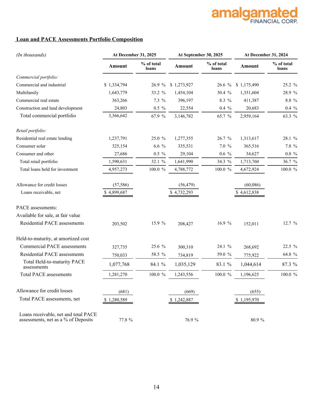 Loan and PACE Assessments Portfolio Composition (In thousands) At December 31, 2025 At September 30, 2025 At December 31, 2024 Amount % of total loans Amount % of total loans Amount % of total loans Commercial portfolio: Commercial and industrial $ 1,334,794 26.9 % $ 1,273,927 26.6 % $ 1,175,490 25.2 % Multifamily 1,643,779 33.2 % 1,454,104 30.4 % 1,351,604 28.9 % Commercial real estate 363,266 7.3 % 396,197 8.3 % 411,387 8.8 % Construction and land development 24,803 0.5 % 22,554 0.4 % 20,683 0.4 % Total commercial portfolio 3,366,642 67.9 % 3,146,782 65.7 % 2,959,164 63.3 % Retail portfolio: Residential real estate lending 1,237,791 25.0 % 1,277,355 26.7 % 1,313,617 28.1 % Consumer solar 325,154 6.6 % 335,531 7.0 % 365,516 7.8 % Consumer and other 27,686 0.5 % 29,104 0.6 % 34,627 0.8 % Total retail portfolio 1,590,631 32.1 % 1,641,990 34.3 % 1,713,760 36.7 % Total loans held for investment 4,957,273 100.0 % 4,788,772 100.0 % 4,672,924 100.0 % Allowance for credit losses (57,586) (56,479) (60,086) Loans receivable, net $ 4,899,687 $ 4,732,293 $ 4,612,838 PACE assessments: Available for sale, at fair value Residential PACE assessments 203,502 15.9 % 208,427 16.9 % 152,011 12.7 % Held-to-maturity, at amortized cost Commercial PACE assessments 327,735 25.6 % 300,310 24.1 % 268,692 22.5 % Residential PACE assessments 750,033 58.5 % 734,819 59.0 % 775,922 64.8 % Total Held-to-maturity PACE assessments 1,077,768 84.1 % 1,035,129 83.1 % 1,044,614 87.3 % Total PACE assessments 1,281,270 100.0 % 1,243,556 100.0 % 1,196,625 100.0 % Allowance for credit losses (681) (669) (655) Total PACE assessments, net $ 1,280,589 $ 1,242,887 $ 1,195,970 Loans receivable, net and total PACE assessments, net as a % of Deposits 77.8 % 76.9 % 80.9 % 14