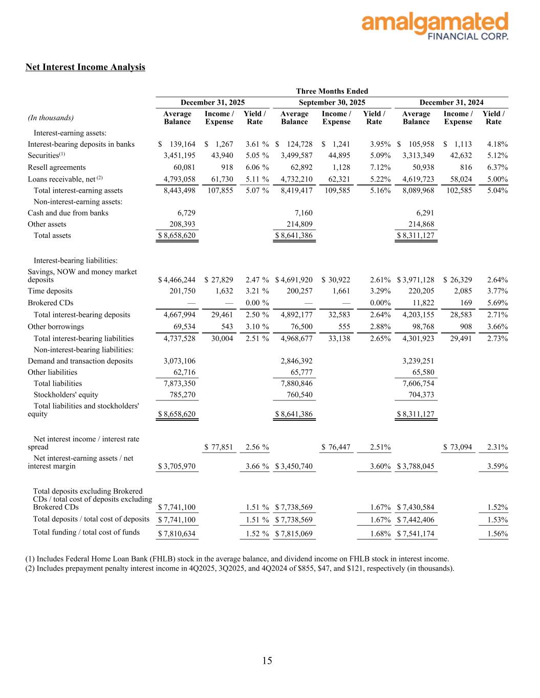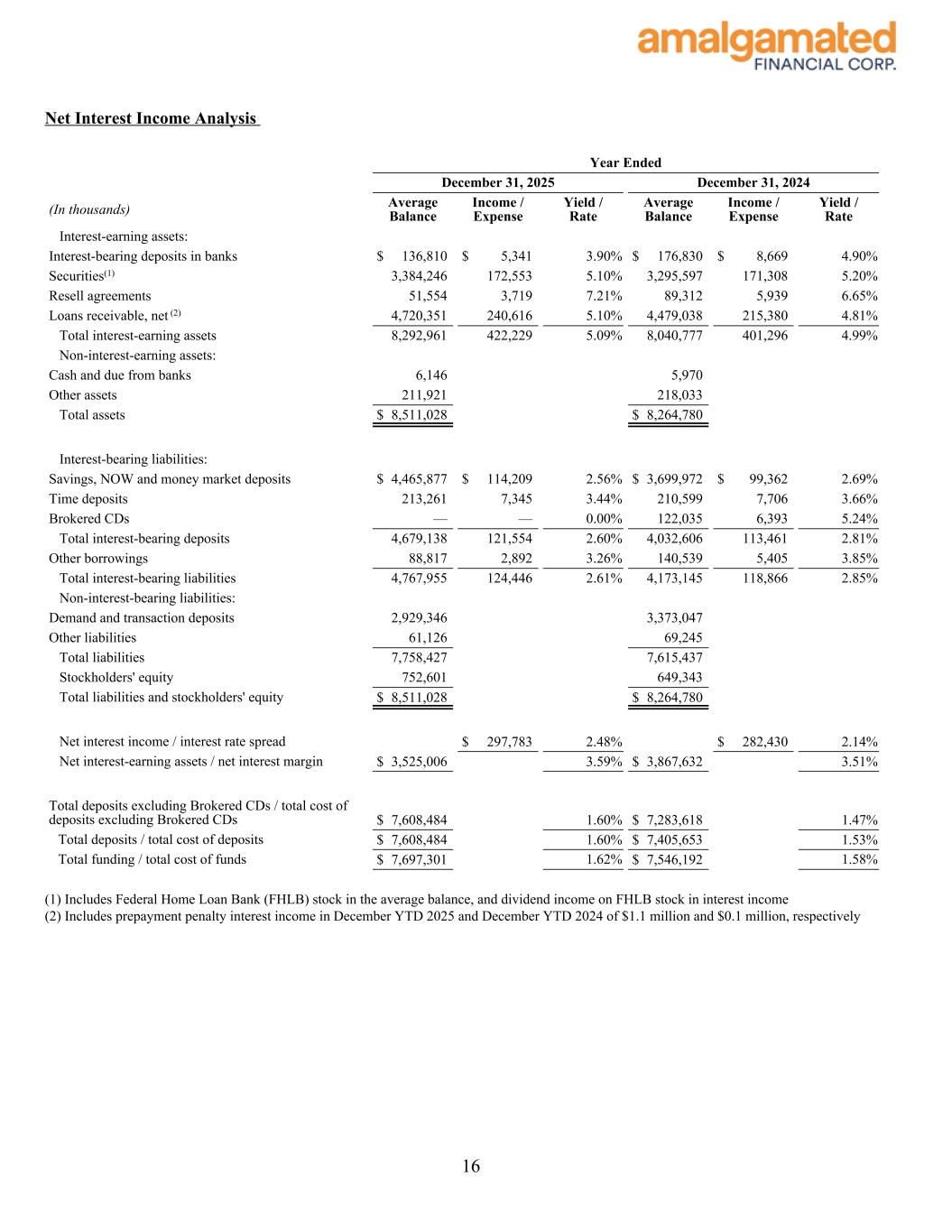 Net Interest Income Analysis Three Months Ended December 31, 2025 September 30, 2025 December 31, 2024 (In thousands) Average Balance Income / Expense Yield / Rate Average Balance Income / Expense Yield / Rate Average Balance Income / Expense Yield / Rate Interest-earning assets: Interest-bearing deposits in banks $ 139,164 $ 1,267 3.61 % $ 124,728 $ 1,241 3.95 % $ 105,958 $ 1,113 4.18 % Securities(1) 3,451,195 43,940 5.05 % 3,499,587 44,895 5.09 % 3,313,349 42,632 5.12 % Resell agreements 60,081 918 6.06 % 62,892 1,128 7.12 % 50,938 816 6.37 % Loans receivable, net (2) 4,793,058 61,730 5.11 % 4,732,210 62,321 5.22 % 4,619,723 58,024 5.00 % Total interest-earning assets 8,443,498 107,855 5.07 % 8,419,417 109,585 5.16 % 8,089,968 102,585 5.04 % Non-interest-earning assets: Cash and due from banks 6,729 7,160 6,291 Other assets 208,393 214,809 214,868 Total assets $ 8,658,620 $ 8,641,386 $ 8,311,127 Interest-bearing liabilities: Savings, NOW and money market deposits $ 4,466,244 $ 27,829 2.47 % $ 4,691,920 $ 30,922 2.61 % $ 3,971,128 $ 26,329 2.64 % Time deposits 201,750 1,632 3.21 % 200,257 1,661 3.29 % 220,205 2,085 3.77 % Brokered CDs — — 0.00 % — — 0.00 % 11,822 169 5.69 % Total interest-bearing deposits 4,667,994 29,461 2.50 % 4,892,177 32,583 2.64 % 4,203,155 28,583 2.71 % Other borrowings 69,534 543 3.10 % 76,500 555 2.88 % 98,768 908 3.66 % Total interest-bearing liabilities 4,737,528 30,004 2.51 % 4,968,677 33,138 2.65 % 4,301,923 29,491 2.73 % Non-interest-bearing liabilities: Demand and transaction deposits 3,073,106 2,846,392 3,239,251 Other liabilities 62,716 65,777 65,580 Total liabilities 7,873,350 7,880,846 7,606,754 Stockholders' equity 785,270 760,540 704,373 Total liabilities and stockholders' equity $ 8,658,620 $ 8,641,386 $ 8,311,127 Net interest income / interest rate spread $ 77,851 2.56 % $ 76,447 2.51 % $ 73,094 2.31 % Net interest-earning assets / net interest margin $ 3,705,970 3.66 % $ 3,450,740 3.60 % $ 3,788,045 3.59 % Total deposits excluding Brokered CDs / total cost of deposits excluding Brokered CDs $ 7,741,100 1.51 % $ 7,738,569 1.67 % $ 7,430,584 1.52 % Total deposits / total cost of deposits $ 7,741,100 1.51 % $ 7,738,569 1.67 % $ 7,442,406 1.53 % Total funding / total cost of funds $ 7,810,634 1.52 % $ 7,815,069 1.68 % $ 7,541,174 1.56 % (1) Includes Federal Home Loan Bank (FHLB) stock in the average balance, and dividend income on FHLB stock in interest income. (2) Includes prepayment penalty interest income in 4Q2025, 3Q2025, and 4Q2024 of $855, $47, and $121, respectively (in thousands). 15