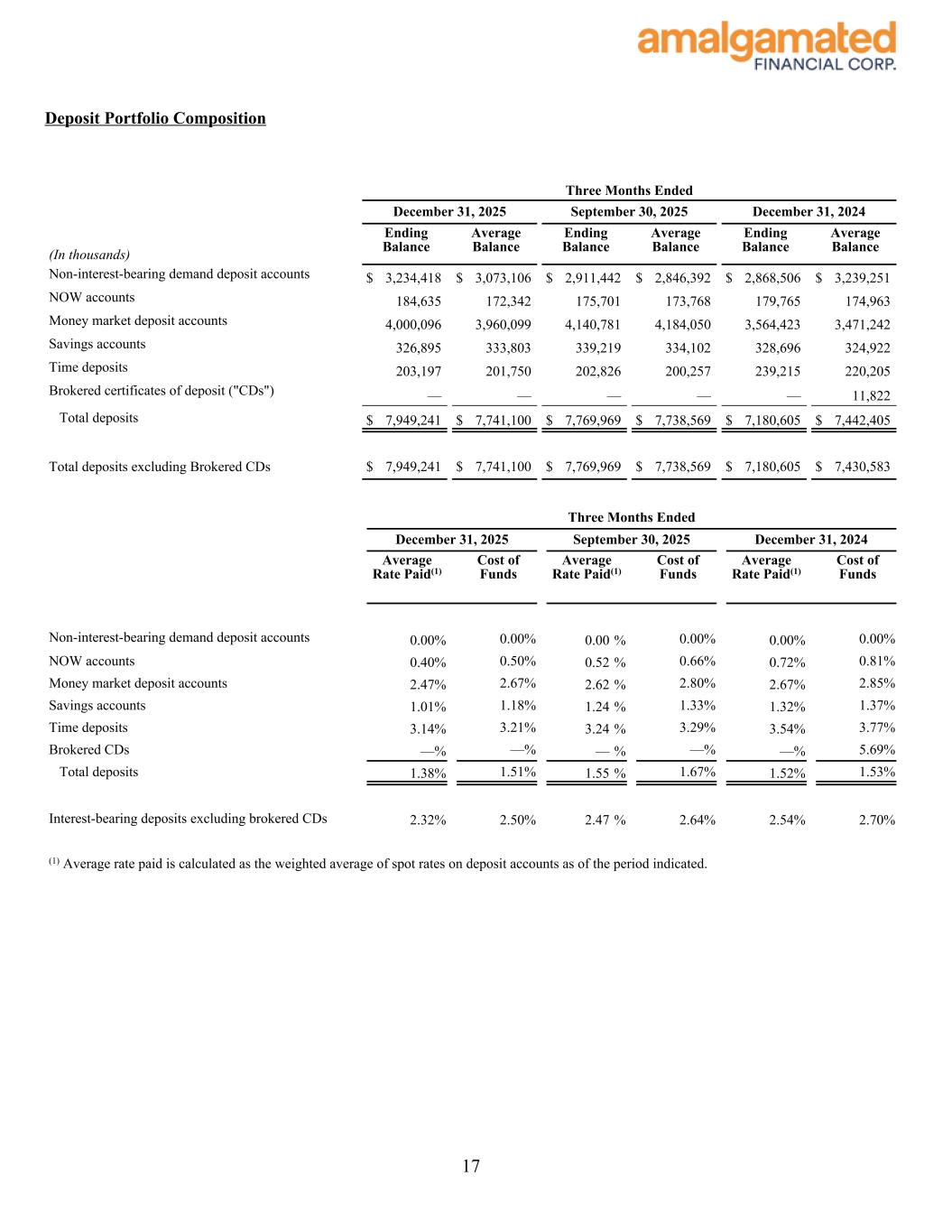 Deposit Portfolio Composition Three Months Ended December 31, 2025 September 30, 2025 December 31, 2024 (In thousands) Ending Balance Average Balance Ending Balance Average Balance Ending Balance Average Balance Non-interest-bearing demand deposit accounts $ 3,234,418 $ 3,073,106 $ 2,911,442 $ 2,846,392 $ 2,868,506 $ 3,239,251 NOW accounts 184,635 172,342 175,701 173,768 179,765 174,963 Money market deposit accounts 4,000,096 3,960,099 4,140,781 4,184,050 3,564,423 3,471,242 Savings accounts 326,895 333,803 339,219 334,102 328,696 324,922 Time deposits 203,197 201,750 202,826 200,257 239,215 220,205 Brokered certificates of deposit ("CDs") — — — — — 11,822 Total deposits $ 7,949,241 $ 7,741,100 $ 7,769,969 $ 7,738,569 $ 7,180,605 $ 7,442,405 Total deposits excluding Brokered CDs $ 7,949,241 $ 7,741,100 $ 7,769,969 $ 7,738,569 $ 7,180,605 $ 7,430,583 Three Months Ended December 31, 2025 September 30, 2025 December 31, 2024 Average Rate Paid(1) Cost of Funds Average Rate Paid(1) Cost of Funds Average Rate Paid(1) Cost of Funds Non-interest-bearing demand deposit accounts 0.00 % 0.00 % 0.00 % 0.00 % 0.00 % 0.00 % NOW accounts 0.40 % 0.50 % 0.52 % 0.66 % 0.72 % 0.81 % Money market deposit accounts 2.47 % 2.67 % 2.62 % 2.80 % 2.67 % 2.85 % Savings accounts 1.01 % 1.18 % 1.24 % 1.33 % 1.32 % 1.37 % Time deposits 3.14 % 3.21 % 3.24 % 3.29 % 3.54 % 3.77 % Brokered CDs — % — % — % — % — % 5.69 % Total deposits 1.38 % 1.51 % 1.55 % 1.67 % 1.52 % 1.53 % Interest-bearing deposits excluding brokered CDs 2.32 % 2.50 % 2.47 % 2.64 % 2.54 % 2.70 % (1) Average rate paid is calculated as the weighted average of spot rates on deposit accounts as of the period indicated. 17