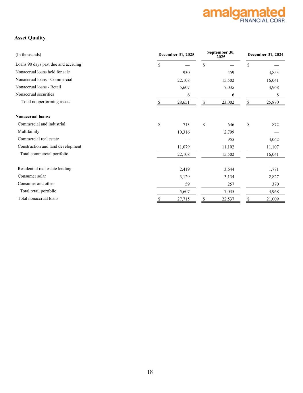 Asset Quality (In thousands) December 31, 2025 September 30, 2025 December 31, 2024 Loans 90 days past due and accruing $ — $ — $ — Nonaccrual loans held for sale 930 459 4,853 Nonaccrual loans - Commercial 22,108 15,502 16,041 Nonaccrual loans - Retail 5,607 7,035 4,968 Nonaccrual securities 6 6 8 Total nonperforming assets $ 28,651 $ 23,002 $ 25,870 Nonaccrual loans: Commercial and industrial $ 713 $ 646 $ 872 Multifamily 10,316 2,799 — Commercial real estate — 955 4,062 Construction and land development 11,079 11,102 11,107 Total commercial portfolio 22,108 15,502 16,041 Residential real estate lending 2,419 3,644 1,771 Consumer solar 3,129 3,134 2,827 Consumer and other 59 257 370 Total retail portfolio 5,607 7,035 4,968 Total nonaccrual loans $ 27,715 $ 22,537 $ 21,009 18