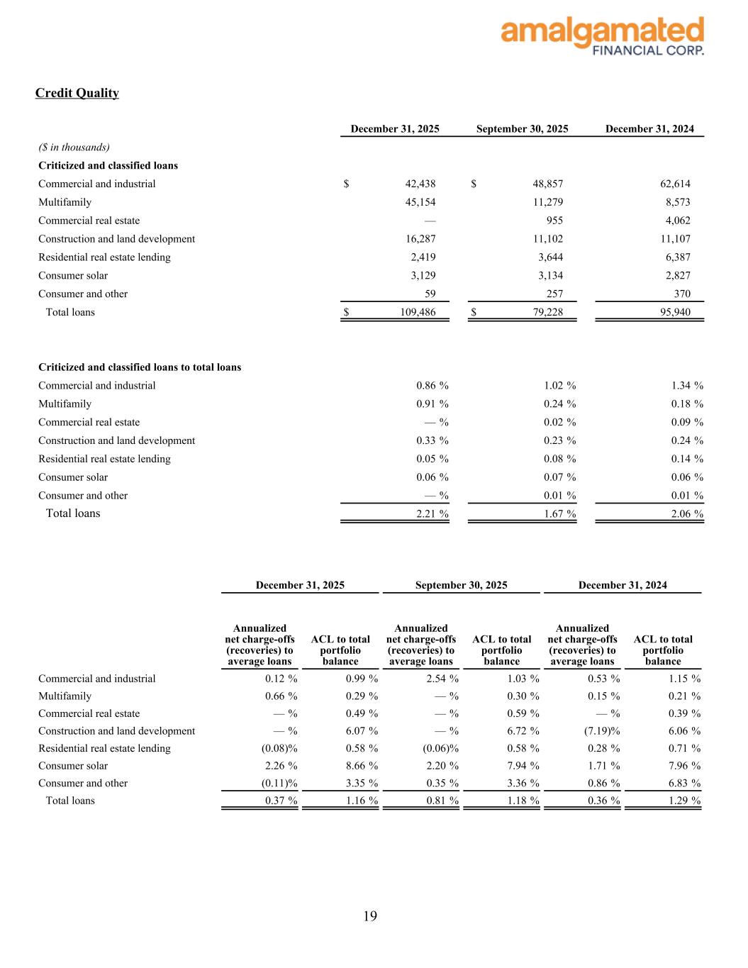 Credit Quality December 31, 2025 September 30, 2025 December 31, 2024 ($ in thousands) Criticized and classified loans Commercial and industrial $ 42,438 $ 48,857 62,614 Multifamily 45,154 11,279 8,573 Commercial real estate — 955 4,062 Construction and land development 16,287 11,102 11,107 Residential real estate lending 2,419 3,644 6,387 Consumer solar 3,129 3,134 2,827 Consumer and other 59 257 370 Total loans $ 109,486 $ 79,228 95,940 Criticized and classified loans to total loans Commercial and industrial 0.86 % 1.02 % 1.34 % Multifamily 0.91 % 0.24 % 0.18 % Commercial real estate — % 0.02 % 0.09 % Construction and land development 0.33 % 0.23 % 0.24 % Residential real estate lending 0.05 % 0.08 % 0.14 % Consumer solar 0.06 % 0.07 % 0.06 % Consumer and other — % 0.01 % 0.01 % Total loans 2.21 % 1.67 % 2.06 % December 31, 2025 September 30, 2025 December 31, 2024 Annualized net charge-offs (recoveries) to average loans ACL to total portfolio balance Annualized net charge-offs (recoveries) to average loans ACL to total portfolio balance Annualized net charge-offs (recoveries) to average loans ACL to total portfolio balance Commercial and industrial 0.12 % 0.99 % 2.54 % 1.03 % 0.53 % 1.15 % Multifamily 0.66 % 0.29 % — % 0.30 % 0.15 % 0.21 % Commercial real estate — % 0.49 % — % 0.59 % — % 0.39 % Construction and land development — % 6.07 % — % 6.72 % (7.19) % 6.06 % Residential real estate lending (0.08) % 0.58 % (0.06) % 0.58 % 0.28 % 0.71 % Consumer solar 2.26 % 8.66 % 2.20 % 7.94 % 1.71 % 7.96 % Consumer and other (0.11) % 3.35 % 0.35 % 3.36 % 0.86 % 6.83 % Total loans 0.37 % 1.16 % 0.81 % 1.18 % 0.36 % 1.29 % 19