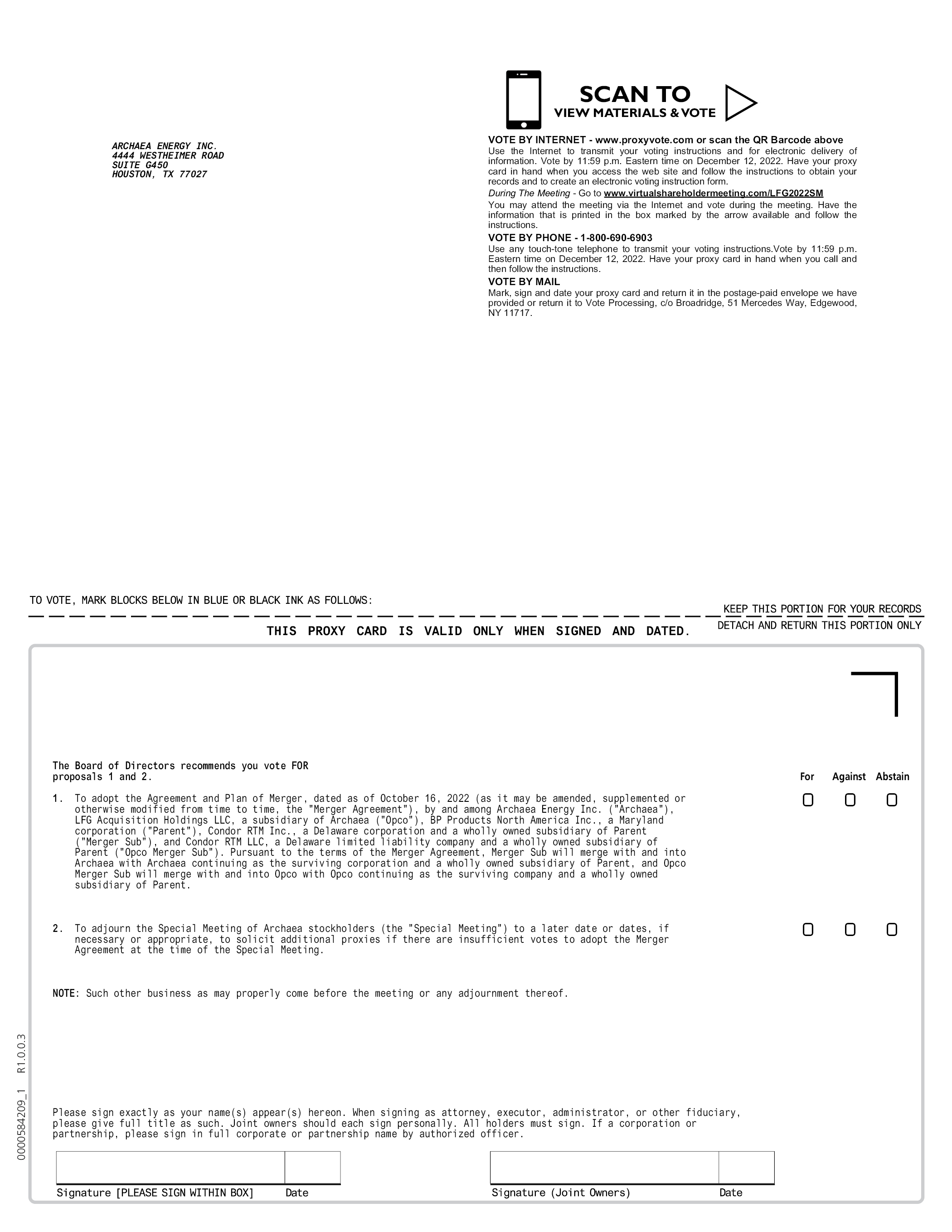 ARCHAEA ENERGY INC. 4444 WESTHEIMER ROAD SUITE G450 HOUSTON, TX 77027 SCAN TO VIEW MATERIALS & VOTE VOTE BY INTERNET - www.proxyvote.com or scan the QR Barcode above Use the Internet to transmit your voting instructions and for electronic delivery of information. Vote by 11:59 p.m. Eastern time on December 12, 2022. Have your proxy card in hand when you access the web site and follow the instructions to obtain your records and to create an electronic voting instruction form. During The Meeting - Go to www.virtualshareholdermeeting.com/LFG2022SM You may attend the meeting via the Internet and vote during the meeting. Have the information that is printed in the box marked by the arrow available and follow the instructions. VOTE BY PHONE - 1-800-690-6903 Use any touch-tone telephone to transmit your voting instructions.Vote by 11:59 p.m. Eastern time on December 12, 2022. Have your proxy card in hand when you call and then follow the instructions. VOTE BY MAIL Mark, sign and date your proxy card and return it in the postage-paid envelope we have provided or return it to Vote Processing, c/o Broadridge, 51 Mercedes Way, Edgewood, NY 11717. TO VOTE, MARK BLOCKS BELOW IN BLUE OR BLACK INK AS FOLLOWS: THIS PROXY CARD IS VALID ONLY WHEN SIGNED AND DATED. KEEP THIS PORTION FOR YOUR RECORDS DETACH AND RETURN THIS PORTION ONLY The Board of Directors recommends you vote FOR proposals 1 and 2. For Against Abstain 1. To adopt the Agreement and Plan of Merger, dated as of October 16, 2022 (as it may be amended, supplemented or otherwise modified from time to time, the “Merger Agreement”), by and among Archaea Energy Inc. (“Archaea”), LFG Acquisition Holdings LLC, a subsidiary of Archaea (“Opco”), BP Products North America Inc., a Maryland corporation (“Parent”), Condor RTM Inc., a Delaware corporation and a wholly owned subsidiary of Parent (“Merger Sub”), and Condor RTM LLC, a Delaware limited liability company and a wholly owned subsidiary of Parent (“Opco Merger Sub”). Pursuant to the terms of the Merger Agreement, Merger Sub will merge with and into Archaea with Archaea continuing as the surviving corporation and a wholly owned subsidiary of Parent, and Opco Merger Sub will merge with and into Opco with Opco continuing as the surviving company and a wholly owned subsidiary of Parent. 2. To adjourn the Special Meeting of Archaea stockholders (the “Special Meeting”) to a later date or dates, if necessary or appropriate, to solicit additional proxies if there are insufficient votes to adopt the Merger Agreement at the time of the Special Meeting. NOTE: Such other business as may properly come before the meeting or any adjournment thereof. Please sign exactly as your name(s) appear(s) hereon. When signing as attorney, executor, administrator, or other fiduciary, please give full title as such. Joint owners should each sign personally. All holders must sign. If a corporation or partnership, please sign in full corporate or partnership name by authorized officer. 0 0 0 0 0 0 Signature [PLEASE SIGN WITHIN BOX] Date Signature (Joint Owners) Date Important Notice Regarding the Availability of Proxy Materials for the Special Meeting: The Proxy Statement is available at www.proxyvote.com