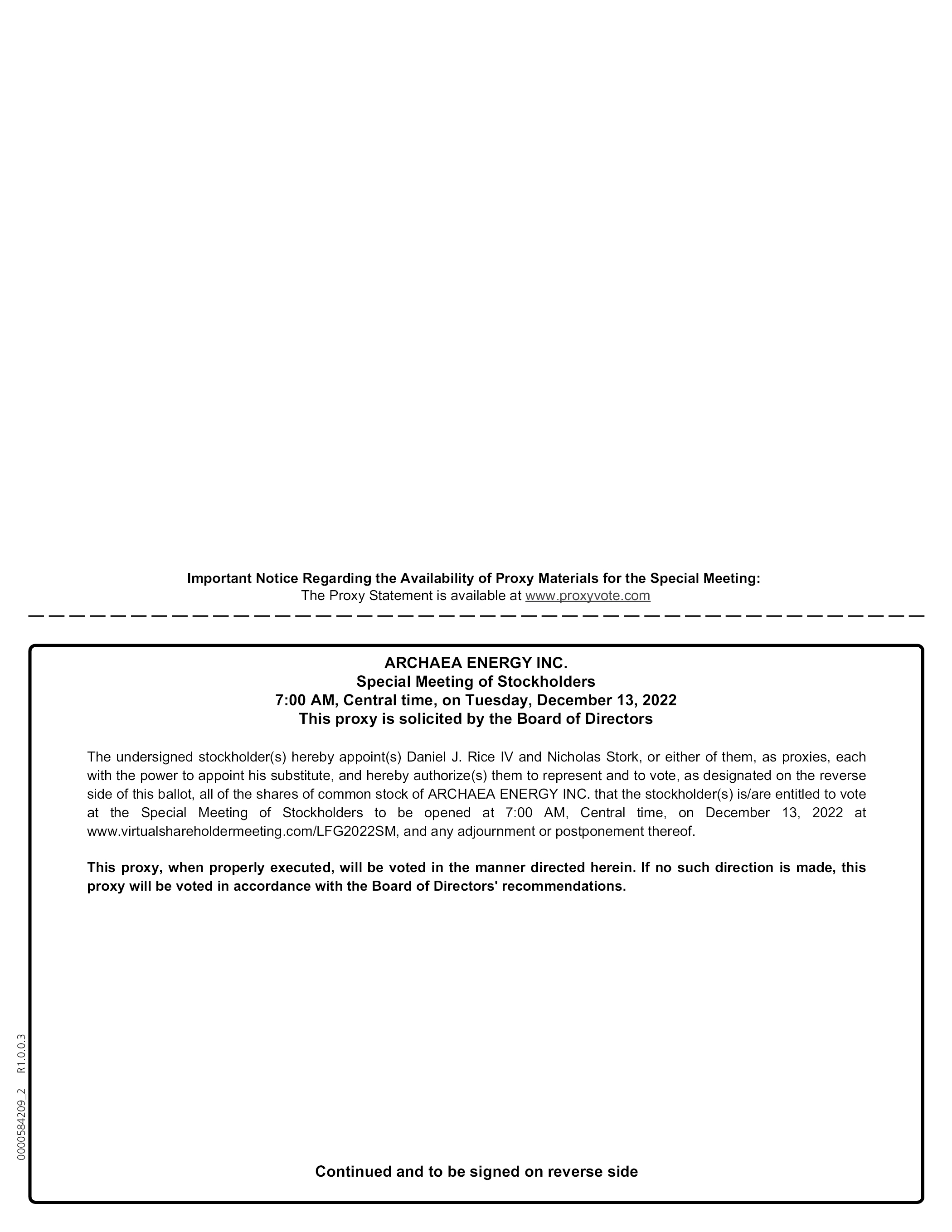 Important Notice Regarding the Availability of Proxy Materials for the Special Meeting: The Proxy Statement is available at www.proxyvote.com ARCHAEA ENERGY INC. Special Meeting of Stockholders 7:00 AM, Central time, on Tuesday, December 13, 2022 This proxy is solicited by the Board of Directors The undersigned stockholder(s) hereby appoint(s) Daniel J. Rice IV and Nicholas Stork, or either of them, as proxies, each with the power to appoint his substitute, and hereby authorize(s) them to represent and to vote, as designated on the reverse side of this ballot, all of the shares of common stock of ARCHAEA ENERGY INC. that the stockholder(s) is/are entitled to vote at the Special Meeting of Stockholders to be opened at 7:00 AM, Central time, on December 13, 2022 at www.virtualshareholdermeeting.com/LFG2022SM, and any adjournment or postponement thereof. This proxy, when properly executed, will be voted in the manner directed herein. If no such direction is made, this proxy will be voted in accordance with the Board of Directors’ recommendations. Continued and to be signed on reverse side