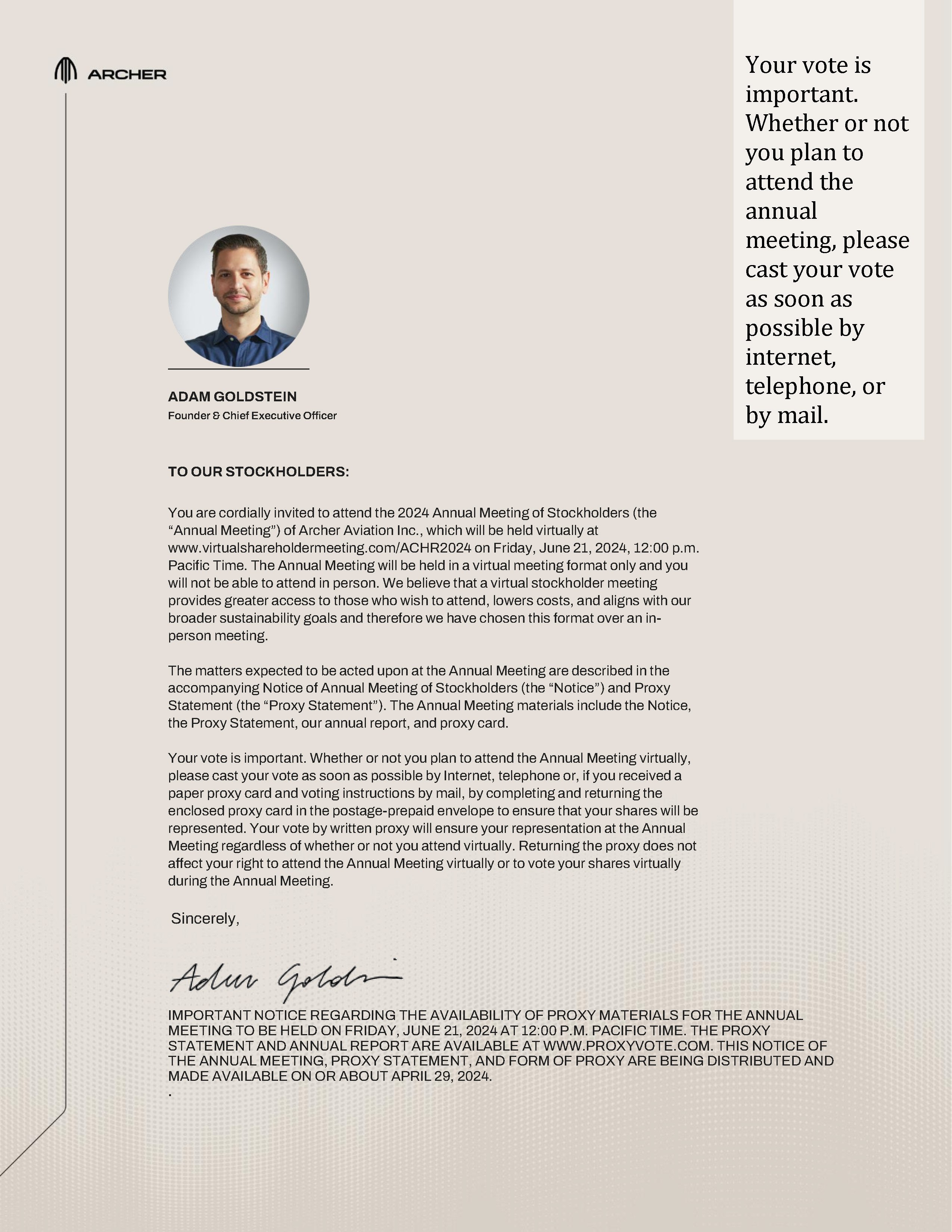| PLACE | You are cordially invited to attend the 2024 Annual Meeting of Stockholders of Archer Aviation Inc., which will be held virtually at www.virtualshareholdermeeting.com/ACHR2024. We believe that a virtual stockholder meeting provides greater access to those who wish to attend, and therefore we have chosen this format over an in-person meeting. This approach also lowers costs and aligns with our broader sustainability goals. You will not be able to attend the Annual Meeting in person. |