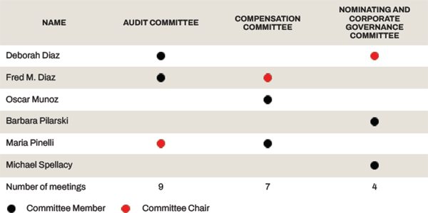| – | Five of our seven directors are ethnically diverse and/or women and 50% of our board of directors and committee leadership positions are held by women. |