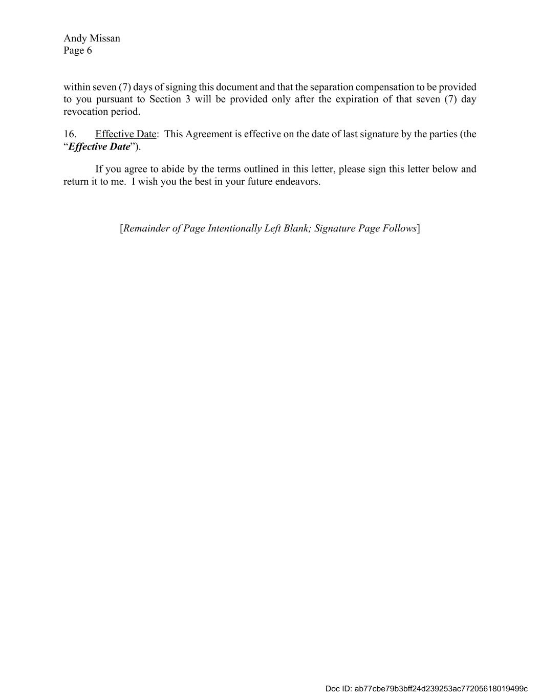 Andy Missan Page 6 within seven (7) days of signing this document and that the separation compensation to be provided to you pursuant to Section 3 will be provided only after the expiration of that seven (7) day revocation period. 16. Effective Date: This Agreement is effective on the date of last signature by the parties (the “Effective Date”). If you agree to abide by the terms outlined in this letter, please sign this letter below and return it to me. I wish you the best in your future endeavors. [Remainder of Page Intentionally Left Blank; Signature Page Follows] Doc ID: ab77cbe79b3bff24d239253ac77205618019499c