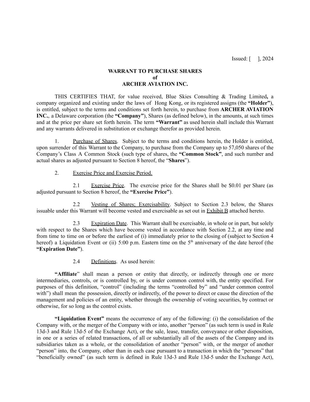 Issued: [ ], 2024 WARRANT TO PURCHASE SHARES of ARCHER AVIATION INC. THIS CERTIFIES THAT, for value received, Blue Skies Consulting & Trading Limited, a company organized and existing under the laws of Hong Kong, or its registered assigns (the “Holder”), is entitled, subject to the terms and conditions set forth herein, to purchase from ARCHER AVIATION INC., a Delaware corporation (the “Company”), Shares (as defined below), in the amounts, at such times and at the price per share set forth herein. The term “Warrant” as used herein shall include this Warrant and any warrants delivered in substitution or exchange therefor as provided herein. 1. Purchase of Shares. Subject to the terms and conditions herein, the Holder is entitled, upon surrender of this Warrant to the Company, to purchase from the Company up to 57,050 shares of the Company’s Class A Common Stock (such type of shares, the “Common Stock”, and such number and actual shares as adjusted pursuant to Section 8 hereof, the “Shares”). 2. Exercise Price and Exercise Period. 2.1 Exercise Price. The exercise price for the Shares shall be $0.01 per Share (as adjusted pursuant to Section 8 hereof, the “Exercise Price”). 2.2 Vesting of Shares; Exercisability. Subject to Section 2.3 below, the Shares issuable under this Warrant will become vested and exercisable as set out in Exhibit B attached hereto. 2.3 Expiration Date. This Warrant shall be exercisable, in whole or in part, but solely with respect to the Shares which have become vested in accordance with Section 2.2, at any time and from time to time on or before the earliest of (i) immediately prior to the closing of (subject to Section 4 hereof) a Liquidation Event or (ii) 5:00 p.m. Eastern time on the 5th anniversary of the date hereof (the “Expiration Date”). 2.4 Definitions. As used herein: “Affiliate” shall mean a person or entity that directly, or indirectly through one or more intermediaries, controls, or is controlled by, or is under common control with, the entity specified. For purposes of this definition, “control” (including the terms “controlled by” and “under common control with”) shall mean the possession, directly or indirectly, of the power to direct or cause the direction of the management and policies of an entity, whether through the ownership of voting securities, by contract or otherwise, for so long as the control exists. “Liquidation Event” means the occurrence of any of the following: (i) the consolidation of the Company with, or the merger of the Company with or into, another “person” (as such term is used in Rule 13d-3 and Rule 13d-5 of the Exchange Act), or the sale, lease, transfer, conveyance or other disposition, in one or a series of related transactions, of all or substantially all of the assets of the Company and its subsidiaries taken as a whole, or the consolidation of another “person” with, or the merger of another “person” into, the Company, other than in each case pursuant to a transaction in which the “persons” that “beneficially owned” (as such term is defined in Rule 13d-3 and Rule 13d-5 under the Exchange Act),