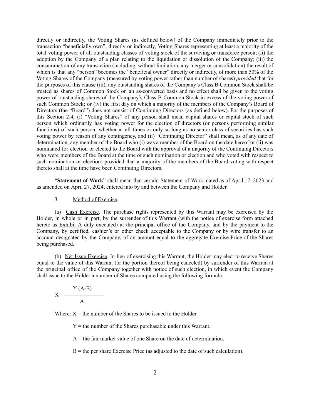 directly or indirectly, the Voting Shares (as defined below) of the Company immediately prior to the transaction “beneficially own”, directly or indirectly, Voting Shares representing at least a majority of the total voting power of all outstanding classes of voting stock of the surviving or transferee person; (ii) the adoption by the Company of a plan relating to the liquidation or dissolution of the Company; (iii) the consummation of any transaction (including, without limitation, any merger or consolidation) the result of which is that any “person” becomes the “beneficial owner” directly or indirectly, of more than 50% of the Voting Shares of the Company (measured by voting power rather than number of shares) provided that for the purposes of this clause (iii), any outstanding shares of the Company’s Class B Common Stock shall be treated as shares of Common Stock on an as-converted basis and no effect shall be given to the voting power of outstanding shares of the Company’s Class B Common Stock in excess of the voting power of such Common Stock; or (iv) the first day on which a majority of the members of the Company’s Board of Directors (the “Board”) does not consist of Continuing Directors (as defined below). For the purposes of this Section 2.4, (i) “Voting Shares” of any person shall mean capital shares or capital stock of such person which ordinarily has voting power for the election of directors (or persons performing similar functions) of such person, whether at all times or only so long as no senior class of securities has such voting power by reason of any contingency, and (ii) “Continuing Director” shall mean, as of any date of determination, any member of the Board who (i) was a member of the Board on the date hereof or (ii) was nominated for election or elected to the Board with the approval of a majority of the Continuing Directors who were members of the Board at the time of such nomination or election and who voted with respect to such nomination or election; provided that a majority of the members of the Board voting with respect thereto shall at the time have been Continuing Directors. “Statement of Work” shall mean that certain Statement of Work, dated as of April 17, 2023 and as amended on April 27, 2024, entered into by and between the Company and Holder. 3. Method of Exercise. (a) Cash Exercise. The purchase rights represented by this Warrant may be exercised by the Holder, in whole or in part, by the surrender of this Warrant (with the notice of exercise form attached hereto as Exhibit A duly executed) at the principal office of the Company, and by the payment to the Company, by certified, cashier’s or other check acceptable to the Company or by wire transfer to an account designated by the Company, of an amount equal to the aggregate Exercise Price of the Shares being purchased. (b) Net Issue Exercise. In lieu of exercising this Warrant, the Holder may elect to receive Shares equal to the value of this Warrant (or the portion thereof being canceled) by surrender of this Warrant at the principal office of the Company together with notice of such election, in which event the Company shall issue to the Holder a number of Shares computed using the following formula: Y (A-B) X = ——————— A Where: X = the number of the Shares to be issued to the Holder. Y = the number of the Shares purchasable under this Warrant. A = the fair market value of one Share on the date of determination. B = the per share Exercise Price (as adjusted to the date of such calculation). 2