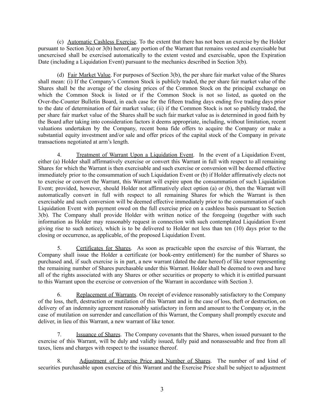 (c) Automatic Cashless Exercise. To the extent that there has not been an exercise by the Holder pursuant to Section 3(a) or 3(b) hereof, any portion of the Warrant that remains vested and exercisable but unexercised shall be exercised automatically to the extent vested and exercisable, upon the Expiration Date (including a Liquidation Event) pursuant to the mechanics described in Section 3(b). (d) Fair Market Value. For purposes of Section 3(b), the per share fair market value of the Shares shall mean: (i) If the Company’s Common Stock is publicly traded, the per share fair market value of the Shares shall be the average of the closing prices of the Common Stock on the principal exchange on which the Common Stock is listed or if the Common Stock is not so listed, as quoted on the Over-the-Counter Bulletin Board, in each case for the fifteen trading days ending five trading days prior to the date of determination of fair market value; (ii) if the Common Stock is not so publicly traded, the per share fair market value of the Shares shall be such fair market value as is determined in good faith by the Board after taking into consideration factors it deems appropriate, including, without limitation, recent valuations undertaken by the Company, recent bona fide offers to acquire the Company or make a substantial equity investment and/or sale and offer prices of the capital stock of the Company in private transactions negotiated at arm’s length. 4. Treatment of Warrant Upon a Liquidation Event. In the event of a Liquidation Event, either (a) Holder shall affirmatively exercise or convert this Warrant in full with respect to all remaining Shares for which the Warrant is then exercisable and such exercise or conversion will be deemed effective immediately prior to the consummation of such Liquidation Event or (b) if Holder affirmatively elects not to exercise or convert the Warrant, this Warrant will expire upon the consummation of such Liquidation Event; provided, however, should Holder not affirmatively elect option (a) or (b), then the Warrant will automatically convert in full with respect to all remaining Shares for which the Warrant is then exercisable and such conversion will be deemed effective immediately prior to the consummation of such Liquidation Event with payment owed on the full exercise price on a cashless basis pursuant to Section 3(b). The Company shall provide Holder with written notice of the foregoing (together with such information as Holder may reasonably request in connection with such contemplated Liquidation Event giving rise to such notice), which is to be delivered to Holder not less than ten (10) days prior to the closing or occurrence, as applicable, of the proposed Liquidation Event. 5. Certificates for Shares. As soon as practicable upon the exercise of this Warrant, the Company shall issue the Holder a certificate (or book-entry entitlement) for the number of Shares so purchased and, if such exercise is in part, a new warrant (dated the date hereof) of like tenor representing the remaining number of Shares purchasable under this Warrant. Holder shall be deemed to own and have all of the rights associated with any Shares or other securities or property to which it is entitled pursuant to this Warrant upon the exercise or conversion of the Warrant in accordance with Section 3. 6. Replacement of Warrants. On receipt of evidence reasonably satisfactory to the Company of the loss, theft, destruction or mutilation of this Warrant and in the case of loss, theft or destruction, on delivery of an indemnity agreement reasonably satisfactory in form and amount to the Company or, in the case of mutilation on surrender and cancellation of this Warrant, the Company shall promptly execute and deliver, in lieu of this Warrant, a new warrant of like tenor. 7. Issuance of Shares. The Company covenants that the Shares, when issued pursuant to the exercise of this Warrant, will be duly and validly issued, fully paid and nonassessable and free from all taxes, liens and charges with respect to the issuance thereof. 8. Adjustment of Exercise Price and Number of Shares. The number of and kind of securities purchasable upon exercise of this Warrant and the Exercise Price shall be subject to adjustment 3