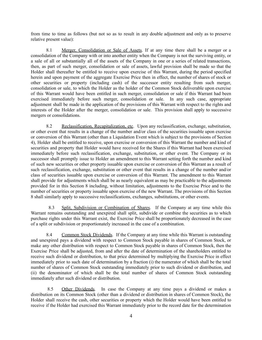 from time to time as follows (but not so as to result in any double adjustment and only as to preserve relative present value): 8.1 Merger, Consolidation or Sale of Assets. If at any time there shall be a merger or a consolidation of the Company with or into another entity when the Company is not the surviving entity, or a sale of all or substantially all of the assets of the Company in one or a series of related transactions, then, as part of such merger, consolidation or sale of assets, lawful provision shall be made so that the Holder shall thereafter be entitled to receive upon exercise of this Warrant, during the period specified herein and upon payment of the aggregate Exercise Price then in effect, the number of shares of stock or other securities or property (including cash) of the successor entity resulting from such merger, consolidation or sale, to which the Holder as the holder of the Common Stock deliverable upon exercise of this Warrant would have been entitled in such merger, consolidation or sale if this Warrant had been exercised immediately before such merger, consolidation or sale. In any such case, appropriate adjustment shall be made in the application of the provisions of this Warrant with respect to the rights and interests of the Holder after the merger, consolidation or sale. This provision shall apply to successive mergers or consolidations. 8.2 Reclassification, Recapitalization, etc. Upon any reclassification, exchange, substitution, or other event that results in a change of the number and/or class of the securities issuable upon exercise or conversion of this Warrant (other than a Liquidation Event which is subject to the provisions of Section 4), Holder shall be entitled to receive, upon exercise or conversion of this Warrant the number and kind of securities and property that Holder would have received for the Shares if this Warrant had been exercised immediately before such reclassification, exchange, substitution, or other event. The Company or its successor shall promptly issue to Holder an amendment to this Warrant setting forth the number and kind of such new securities or other property issuable upon exercise or conversion of this Warrant as a result of such reclassification, exchange, substitution or other event that results in a change of the number and/or class of securities issuable upon exercise or conversion of this Warrant. The amendment to this Warrant shall provide for adjustments which shall be as nearly equivalent as may be practicable to the adjustments provided for in this Section 8 including, without limitation, adjustments to the Exercise Price and to the number of securities or property issuable upon exercise of the new Warrant. The provisions of this Section 8 shall similarly apply to successive reclassifications, exchanges, substitutions, or other events. 8.3 Split, Subdivision or Combination of Shares. If the Company at any time while this Warrant remains outstanding and unexpired shall split, subdivide or combine the securities as to which purchase rights under this Warrant exist, the Exercise Price shall be proportionately decreased in the case of a split or subdivision or proportionately increased in the case of a combination. 8.4 Common Stock Dividends. If the Company at any time while this Warrant is outstanding and unexpired pays a dividend with respect to Common Stock payable in shares of Common Stock, or make any other distribution with respect to Common Stock payable in shares of Common Stock, then the Exercise Price shall be adjusted, from and after the date of determination of the shareholders entitled to receive such dividend or distribution, to that price determined by multiplying the Exercise Price in effect immediately prior to such date of determination by a fraction (i) the numerator of which shall be the total number of shares of Common Stock outstanding immediately prior to such dividend or distribution, and (ii) the denominator of which shall be the total number of shares of Common Stock outstanding immediately after such dividend or distribution. 8.5 Other Dividends. In case the Company at any time pays a dividend or makes a distribution on its Common Stock (other than a dividend or distribution in shares of Common Stock), the Holder shall receive the cash, other securities or property which the Holder would have been entitled to receive if the Holder had exercised this Warrant immediately prior to the record date for the determination 4