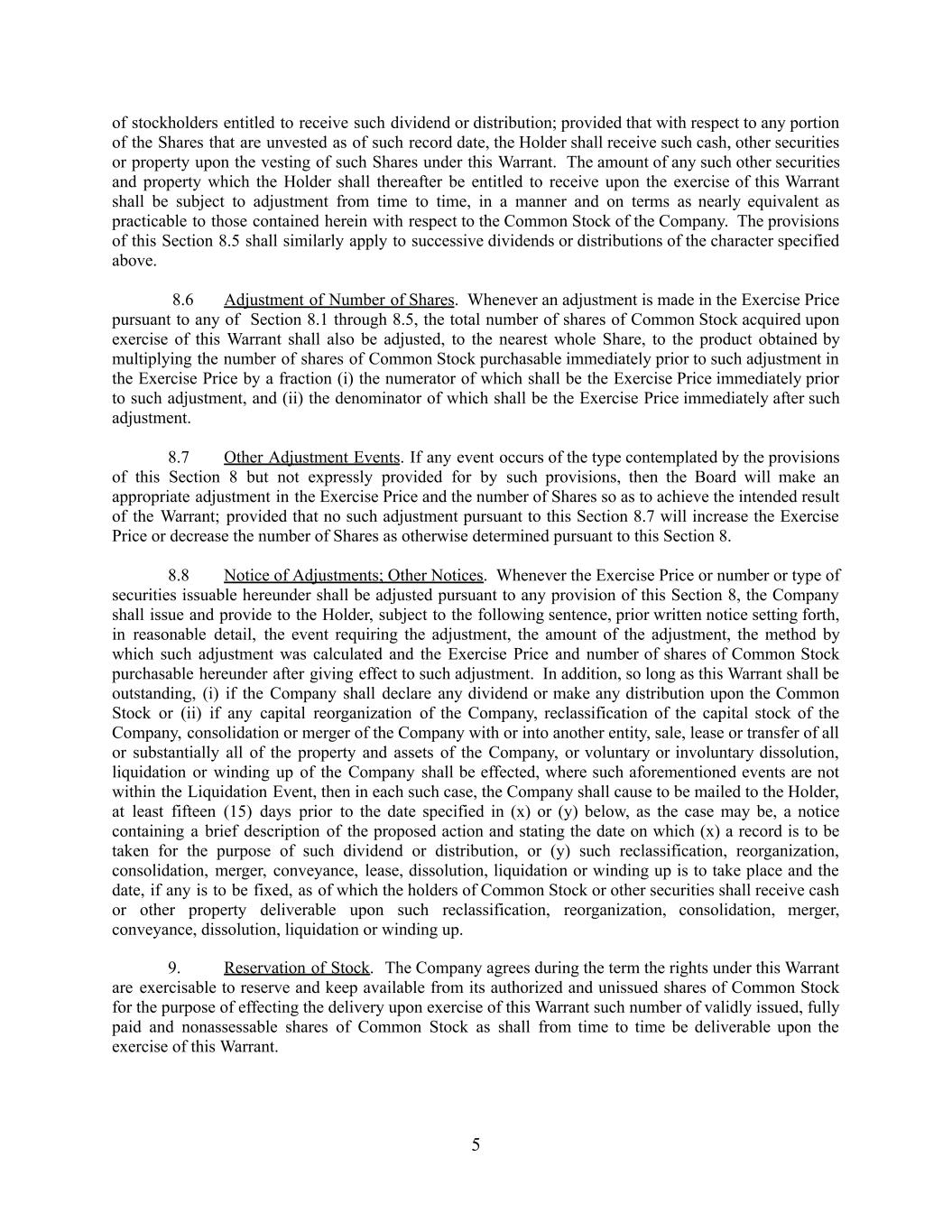 of stockholders entitled to receive such dividend or distribution; provided that with respect to any portion of the Shares that are unvested as of such record date, the Holder shall receive such cash, other securities or property upon the vesting of such Shares under this Warrant. The amount of any such other securities and property which the Holder shall thereafter be entitled to receive upon the exercise of this Warrant shall be subject to adjustment from time to time, in a manner and on terms as nearly equivalent as practicable to those contained herein with respect to the Common Stock of the Company. The provisions of this Section 8.5 shall similarly apply to successive dividends or distributions of the character specified above. 8.6 Adjustment of Number of Shares. Whenever an adjustment is made in the Exercise Price pursuant to any of Section 8.1 through 8.5, the total number of shares of Common Stock acquired upon exercise of this Warrant shall also be adjusted, to the nearest whole Share, to the product obtained by multiplying the number of shares of Common Stock purchasable immediately prior to such adjustment in the Exercise Price by a fraction (i) the numerator of which shall be the Exercise Price immediately prior to such adjustment, and (ii) the denominator of which shall be the Exercise Price immediately after such adjustment. 8.7 Other Adjustment Events. If any event occurs of the type contemplated by the provisions of this Section 8 but not expressly provided for by such provisions, then the Board will make an appropriate adjustment in the Exercise Price and the number of Shares so as to achieve the intended result of the Warrant; provided that no such adjustment pursuant to this Section 8.7 will increase the Exercise Price or decrease the number of Shares as otherwise determined pursuant to this Section 8. 8.8 Notice of Adjustments; Other Notices. Whenever the Exercise Price or number or type of securities issuable hereunder shall be adjusted pursuant to any provision of this Section 8, the Company shall issue and provide to the Holder, subject to the following sentence, prior written notice setting forth, in reasonable detail, the event requiring the adjustment, the amount of the adjustment, the method by which such adjustment was calculated and the Exercise Price and number of shares of Common Stock purchasable hereunder after giving effect to such adjustment. In addition, so long as this Warrant shall be outstanding, (i) if the Company shall declare any dividend or make any distribution upon the Common Stock or (ii) if any capital reorganization of the Company, reclassification of the capital stock of the Company, consolidation or merger of the Company with or into another entity, sale, lease or transfer of all or substantially all of the property and assets of the Company, or voluntary or involuntary dissolution, liquidation or winding up of the Company shall be effected, where such aforementioned events are not within the Liquidation Event, then in each such case, the Company shall cause to be mailed to the Holder, at least fifteen (15) days prior to the date specified in (x) or (y) below, as the case may be, a notice containing a brief description of the proposed action and stating the date on which (x) a record is to be taken for the purpose of such dividend or distribution, or (y) such reclassification, reorganization, consolidation, merger, conveyance, lease, dissolution, liquidation or winding up is to take place and the date, if any is to be fixed, as of which the holders of Common Stock or other securities shall receive cash or other property deliverable upon such reclassification, reorganization, consolidation, merger, conveyance, dissolution, liquidation or winding up. 9. Reservation of Stock. The Company agrees during the term the rights under this Warrant are exercisable to reserve and keep available from its authorized and unissued shares of Common Stock for the purpose of effecting the delivery upon exercise of this Warrant such number of validly issued, fully paid and nonassessable shares of Common Stock as shall from time to time be deliverable upon the exercise of this Warrant. 5