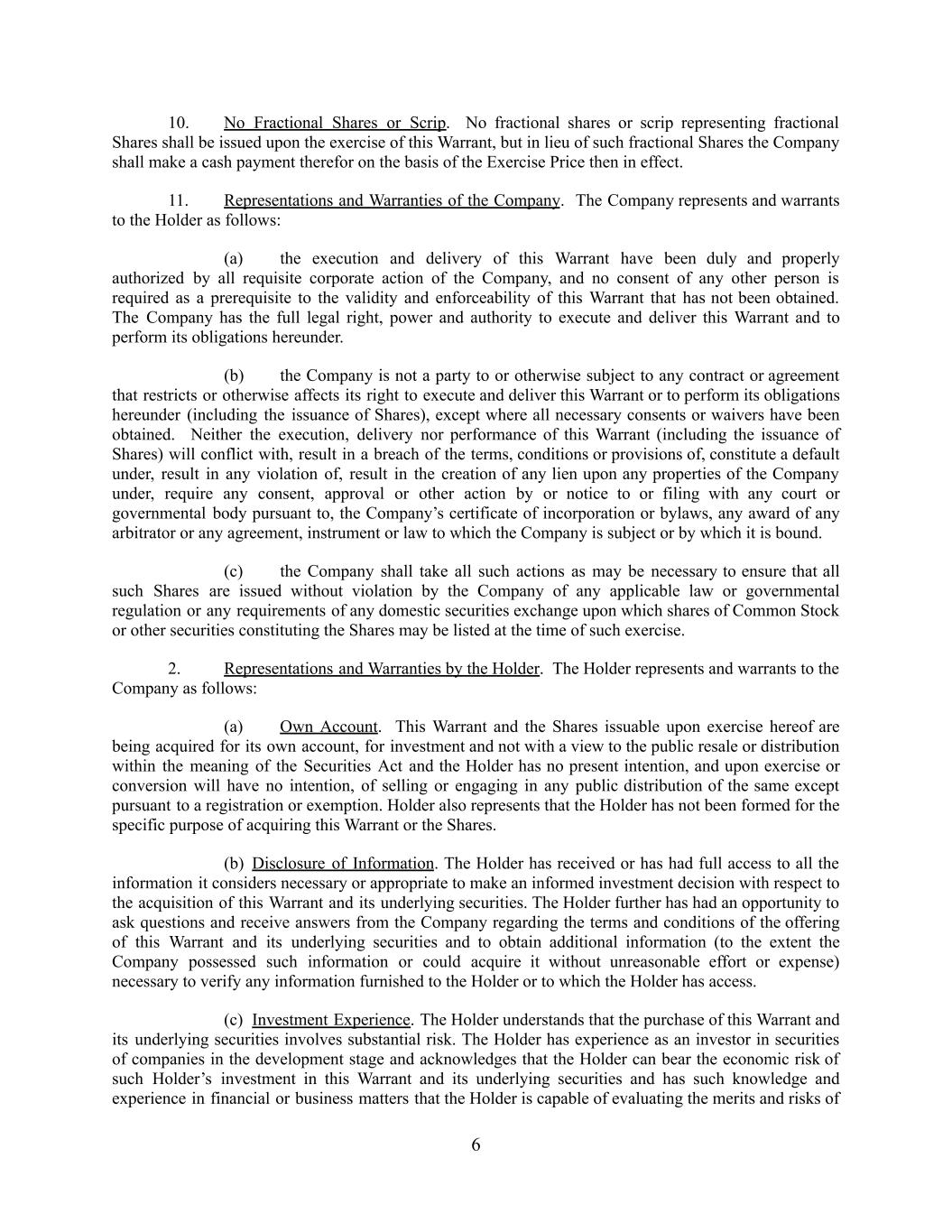 10. No Fractional Shares or Scrip. No fractional shares or scrip representing fractional Shares shall be issued upon the exercise of this Warrant, but in lieu of such fractional Shares the Company shall make a cash payment therefor on the basis of the Exercise Price then in effect. 11. Representations and Warranties of the Company. The Company represents and warrants to the Holder as follows: (a) the execution and delivery of this Warrant have been duly and properly authorized by all requisite corporate action of the Company, and no consent of any other person is required as a prerequisite to the validity and enforceability of this Warrant that has not been obtained. The Company has the full legal right, power and authority to execute and deliver this Warrant and to perform its obligations hereunder. (b) the Company is not a party to or otherwise subject to any contract or agreement that restricts or otherwise affects its right to execute and deliver this Warrant or to perform its obligations hereunder (including the issuance of Shares), except where all necessary consents or waivers have been obtained. Neither the execution, delivery nor performance of this Warrant (including the issuance of Shares) will conflict with, result in a breach of the terms, conditions or provisions of, constitute a default under, result in any violation of, result in the creation of any lien upon any properties of the Company under, require any consent, approval or other action by or notice to or filing with any court or governmental body pursuant to, the Company’s certificate of incorporation or bylaws, any award of any arbitrator or any agreement, instrument or law to which the Company is subject or by which it is bound. (c) the Company shall take all such actions as may be necessary to ensure that all such Shares are issued without violation by the Company of any applicable law or governmental regulation or any requirements of any domestic securities exchange upon which shares of Common Stock or other securities constituting the Shares may be listed at the time of such exercise. 2. Representations and Warranties by the Holder. The Holder represents and warrants to the Company as follows: (a) Own Account. This Warrant and the Shares issuable upon exercise hereof are being acquired for its own account, for investment and not with a view to the public resale or distribution within the meaning of the Securities Act and the Holder has no present intention, and upon exercise or conversion will have no intention, of selling or engaging in any public distribution of the same except pursuant to a registration or exemption. Holder also represents that the Holder has not been formed for the specific purpose of acquiring this Warrant or the Shares. (b) Disclosure of Information. The Holder has received or has had full access to all the information it considers necessary or appropriate to make an informed investment decision with respect to the acquisition of this Warrant and its underlying securities. The Holder further has had an opportunity to ask questions and receive answers from the Company regarding the terms and conditions of the offering of this Warrant and its underlying securities and to obtain additional information (to the extent the Company possessed such information or could acquire it without unreasonable effort or expense) necessary to verify any information furnished to the Holder or to which the Holder has access. (c) Investment Experience. The Holder understands that the purchase of this Warrant and its underlying securities involves substantial risk. The Holder has experience as an investor in securities of companies in the development stage and acknowledges that the Holder can bear the economic risk of such Holder’s investment in this Warrant and its underlying securities and has such knowledge and experience in financial or business matters that the Holder is capable of evaluating the merits and risks of 6