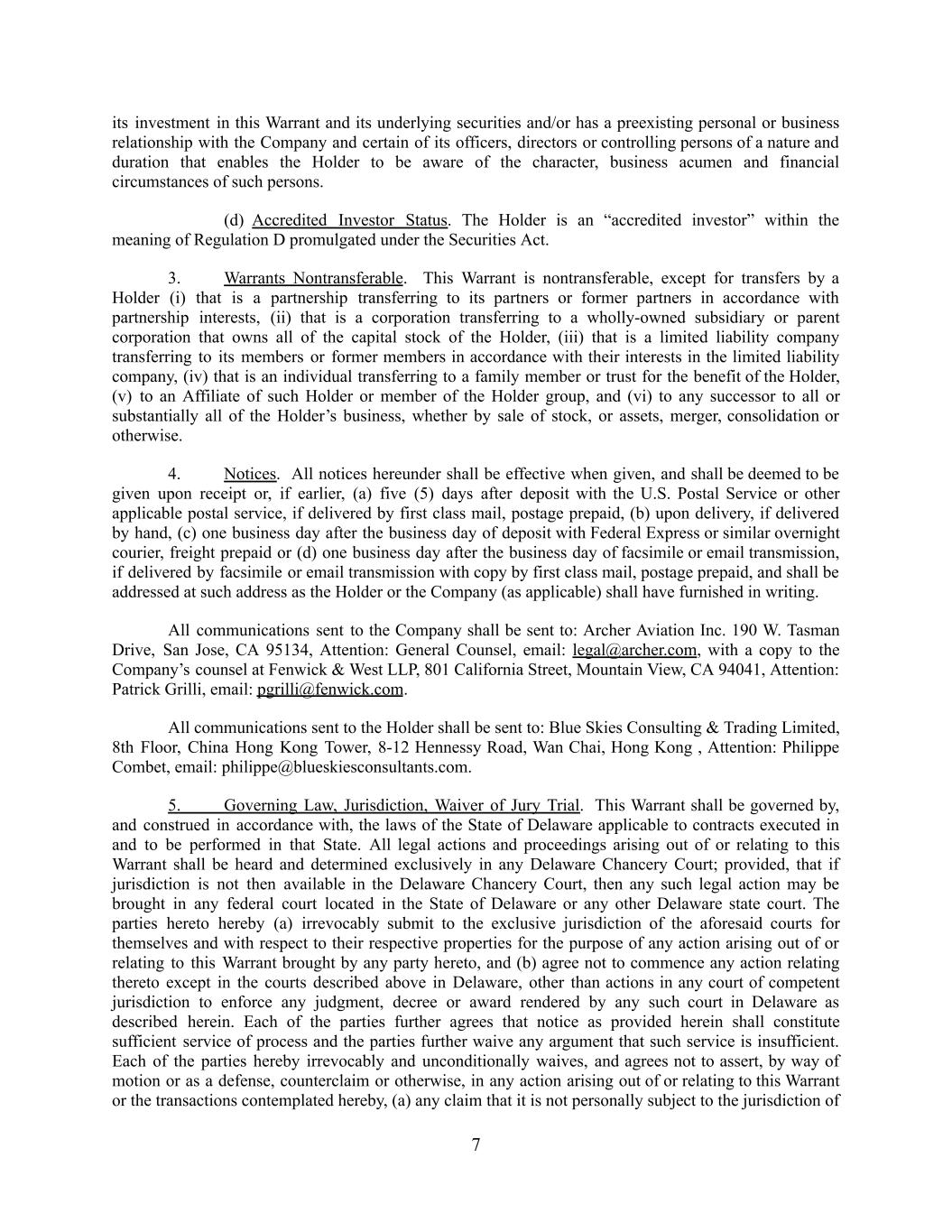 its investment in this Warrant and its underlying securities and/or has a preexisting personal or business relationship with the Company and certain of its officers, directors or controlling persons of a nature and duration that enables the Holder to be aware of the character, business acumen and financial circumstances of such persons. (d) Accredited Investor Status. The Holder is an “accredited investor” within the meaning of Regulation D promulgated under the Securities Act. 3. Warrants Nontransferable. This Warrant is nontransferable, except for transfers by a Holder (i) that is a partnership transferring to its partners or former partners in accordance with partnership interests, (ii) that is a corporation transferring to a wholly-owned subsidiary or parent corporation that owns all of the capital stock of the Holder, (iii) that is a limited liability company transferring to its members or former members in accordance with their interests in the limited liability company, (iv) that is an individual transferring to a family member or trust for the benefit of the Holder, (v) to an Affiliate of such Holder or member of the Holder group, and (vi) to any successor to all or substantially all of the Holder’s business, whether by sale of stock, or assets, merger, consolidation or otherwise. 4. Notices. All notices hereunder shall be effective when given, and shall be deemed to be given upon receipt or, if earlier, (a) five (5) days after deposit with the U.S. Postal Service or other applicable postal service, if delivered by first class mail, postage prepaid, (b) upon delivery, if delivered by hand, (c) one business day after the business day of deposit with Federal Express or similar overnight courier, freight prepaid or (d) one business day after the business day of facsimile or email transmission, if delivered by facsimile or email transmission with copy by first class mail, postage prepaid, and shall be addressed at such address as the Holder or the Company (as applicable) shall have furnished in writing. All communications sent to the Company shall be sent to: Archer Aviation Inc. 190 W. Tasman Drive, San Jose, CA 95134, Attention: General Counsel, email: legal@archer.com, with a copy to the Company’s counsel at Fenwick & West LLP, 801 California Street, Mountain View, CA 94041, Attention: Patrick Grilli, email: pgrilli@fenwick.com. All communications sent to the Holder shall be sent to: Blue Skies Consulting & Trading Limited, 8th Floor, China Hong Kong Tower, 8-12 Hennessy Road, Wan Chai, Hong Kong , Attention: Philippe Combet, email: philippe@blueskiesconsultants.com. 5. Governing Law, Jurisdiction, Waiver of Jury Trial. This Warrant shall be governed by, and construed in accordance with, the laws of the State of Delaware applicable to contracts executed in and to be performed in that State. All legal actions and proceedings arising out of or relating to this Warrant shall be heard and determined exclusively in any Delaware Chancery Court; provided, that if jurisdiction is not then available in the Delaware Chancery Court, then any such legal action may be brought in any federal court located in the State of Delaware or any other Delaware state court. The parties hereto hereby (a) irrevocably submit to the exclusive jurisdiction of the aforesaid courts for themselves and with respect to their respective properties for the purpose of any action arising out of or relating to this Warrant brought by any party hereto, and (b) agree not to commence any action relating thereto except in the courts described above in Delaware, other than actions in any court of competent jurisdiction to enforce any judgment, decree or award rendered by any such court in Delaware as described herein. Each of the parties further agrees that notice as provided herein shall constitute sufficient service of process and the parties further waive any argument that such service is insufficient. Each of the parties hereby irrevocably and unconditionally waives, and agrees not to assert, by way of motion or as a defense, counterclaim or otherwise, in any action arising out of or relating to this Warrant or the transactions contemplated hereby, (a) any claim that it is not personally subject to the jurisdiction of 7