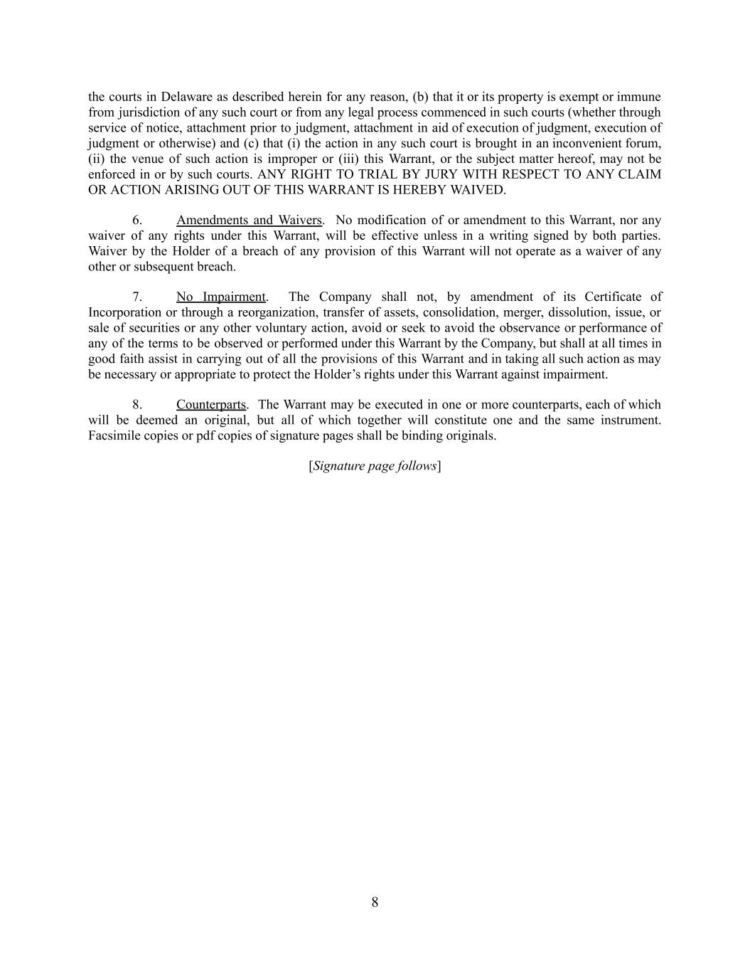 the courts in Delaware as described herein for any reason, (b) that it or its property is exempt or immune from jurisdiction of any such court or from any legal process commenced in such courts (whether through service of notice, attachment prior to judgment, attachment in aid of execution of judgment, execution of judgment or otherwise) and (c) that (i) the action in any such court is brought in an inconvenient forum, (ii) the venue of such action is improper or (iii) this Warrant, or the subject matter hereof, may not be enforced in or by such courts. ANY RIGHT TO TRIAL BY JURY WITH RESPECT TO ANY CLAIM OR ACTION ARISING OUT OF THIS WARRANT IS HEREBY WAIVED. 6. Amendments and Waivers. No modification of or amendment to this Warrant, nor any waiver of any rights under this Warrant, will be effective unless in a writing signed by both parties. Waiver by the Holder of a breach of any provision of this Warrant will not operate as a waiver of any other or subsequent breach. 7. No Impairment. The Company shall not, by amendment of its Certificate of Incorporation or through a reorganization, transfer of assets, consolidation, merger, dissolution, issue, or sale of securities or any other voluntary action, avoid or seek to avoid the observance or performance of any of the terms to be observed or performed under this Warrant by the Company, but shall at all times in good faith assist in carrying out of all the provisions of this Warrant and in taking all such action as may be necessary or appropriate to protect the Holder’s rights under this Warrant against impairment. 8. Counterparts. The Warrant may be executed in one or more counterparts, each of which will be deemed an original, but all of which together will constitute one and the same instrument. Facsimile copies or pdf copies of signature pages shall be binding originals. [Signature page follows] 8