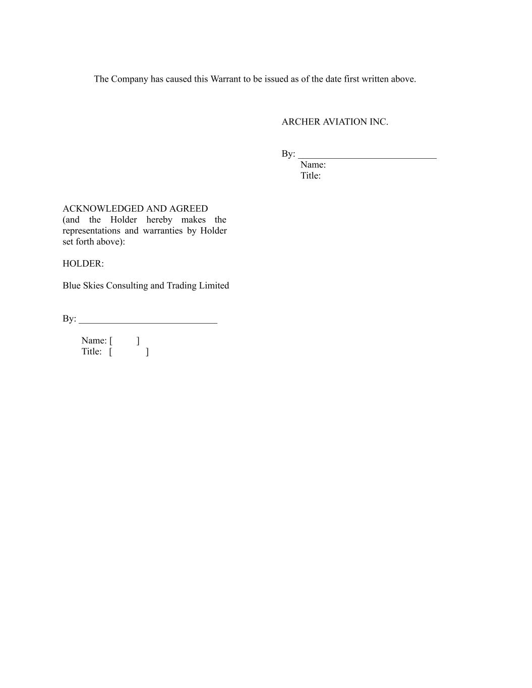 The Company has caused this Warrant to be issued as of the date first written above. ARCHER AVIATION INC. By: _____________________________ Name: Title: ACKNOWLEDGED AND AGREED (and the Holder hereby makes the representations and warranties by Holder set forth above): HOLDER: Blue Skies Consulting and Trading Limited By: _____________________________ Name: [ ] Title: [ ]
