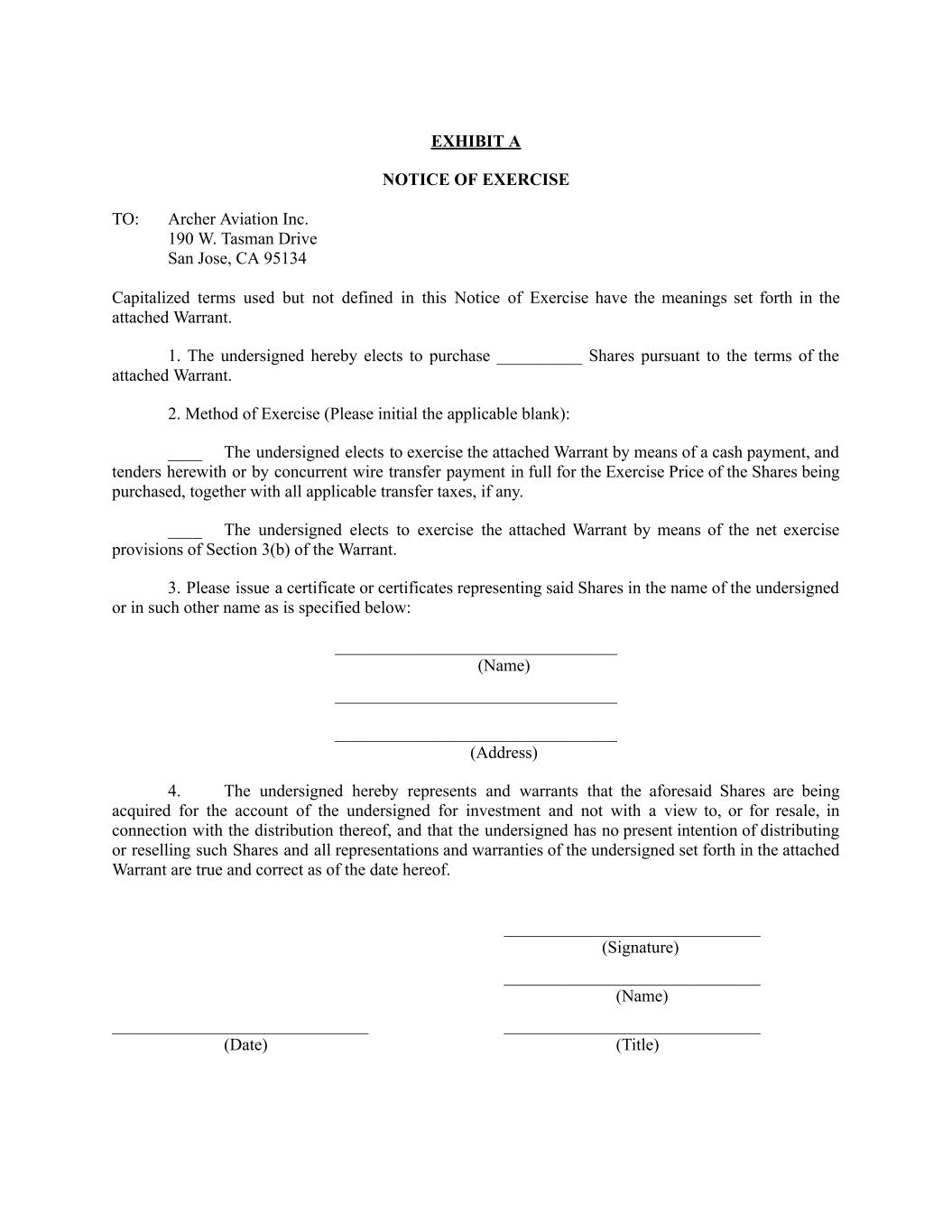 EXHIBIT A NOTICE OF EXERCISE TO: Archer Aviation Inc. 190 W. Tasman Drive San Jose, CA 95134 Capitalized terms used but not defined in this Notice of Exercise have the meanings set forth in the attached Warrant. 1. The undersigned hereby elects to purchase __________ Shares pursuant to the terms of the attached Warrant. 2. Method of Exercise (Please initial the applicable blank): ____ The undersigned elects to exercise the attached Warrant by means of a cash payment, and tenders herewith or by concurrent wire transfer payment in full for the Exercise Price of the Shares being purchased, together with all applicable transfer taxes, if any. ____ The undersigned elects to exercise the attached Warrant by means of the net exercise provisions of Section 3(b) of the Warrant. 3. Please issue a certificate or certificates representing said Shares in the name of the undersigned or in such other name as is specified below: _________________________________ (Name) _________________________________ _________________________________ (Address) 4. The undersigned hereby represents and warrants that the aforesaid Shares are being acquired for the account of the undersigned for investment and not with a view to, or for resale, in connection with the distribution thereof, and that the undersigned has no present intention of distributing or reselling such Shares and all representations and warranties of the undersigned set forth in the attached Warrant are true and correct as of the date hereof. ______________________________ (Signature) ______________________________ (Name) ______________________________ ______________________________ (Date) (Title)