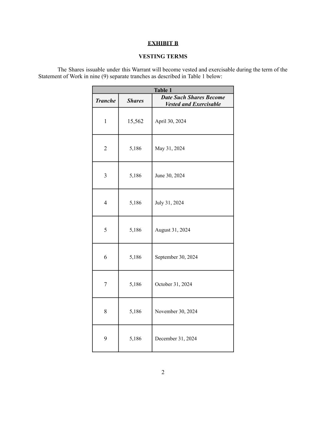 EXHIBIT B VESTING TERMS The Shares issuable under this Warrant will become vested and exercisable during the term of the Statement of Work in nine (9) separate tranches as described in Table 1 below: Table 1 Tranche Shares Date Such Shares Become Vested and Exercisable 1 15,562 April 30, 2024 2 5,186 May 31, 2024 3 5,186 June 30, 2024 4 5,186 July 31, 2024 5 5,186 August 31, 2024 6 5,186 September 30, 2024 7 5,186 October 31, 2024 8 5,186 November 30, 2024 9 5,186 December 31, 2024 2