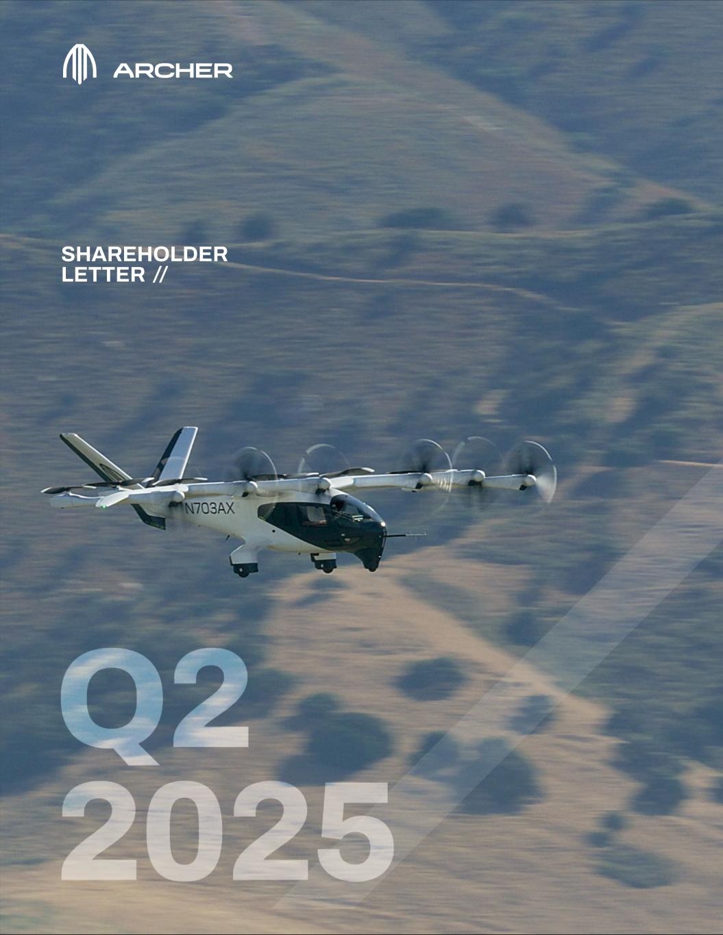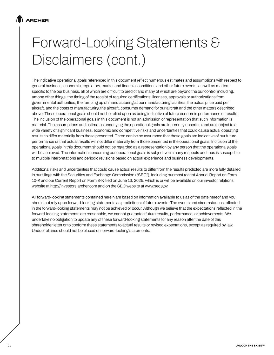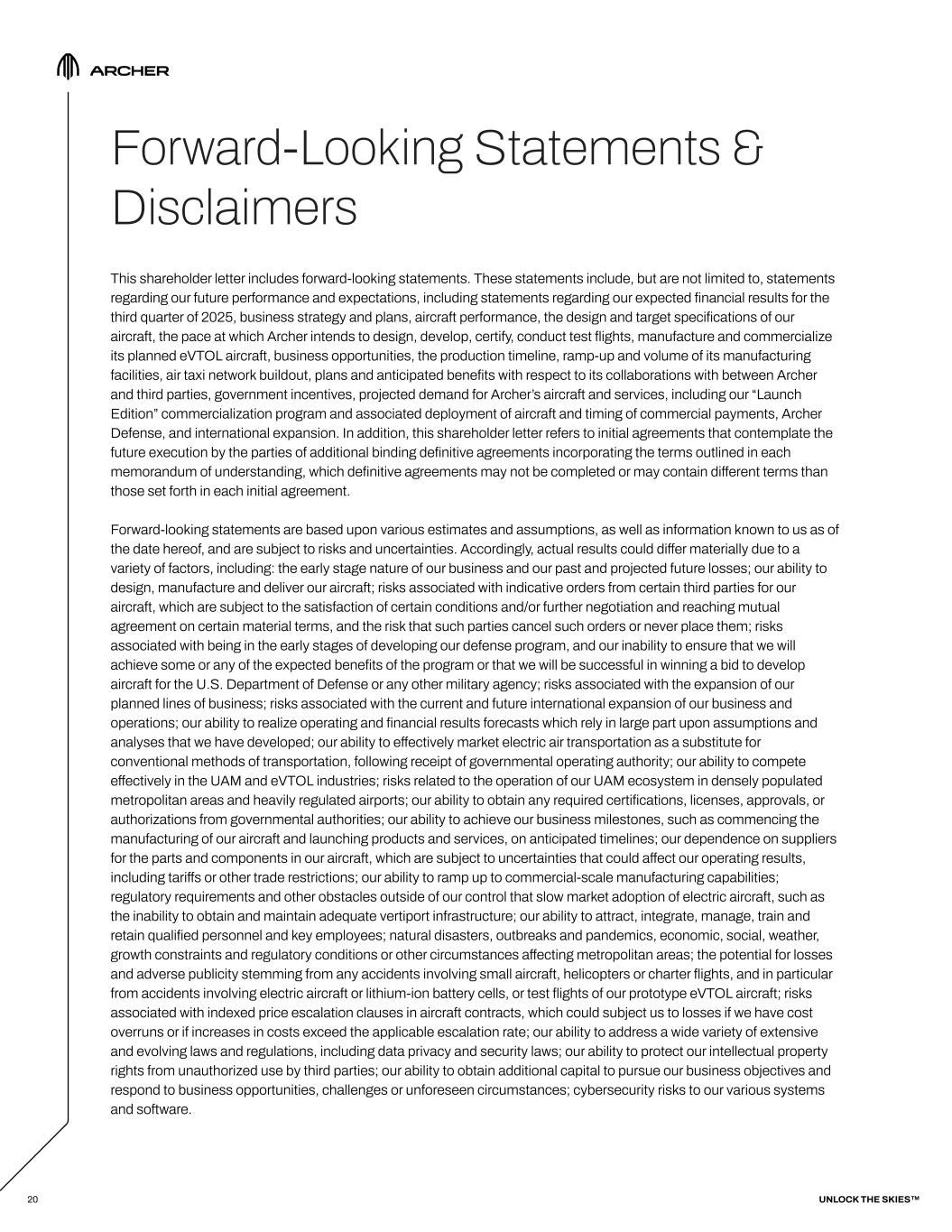 20 Forward-Looking Statements & Disclaimers This shareholder letter includes forward-looking statements. These statements include, but are not limited to, statements regarding our future performance and expectations, including statements regarding our expected financial results for the third quarter of 2025, business strategy and plans, aircraft performance, the design and target specifications of our aircraft, the pace at which Archer intends to design, develop, certify, conduct test flights, manufacture and commercialize its planned eVTOL aircraft, business opportunities, the production timeline, ramp-up and volume of its manufacturing facilities, air taxi network buildout, plans and anticipated benefits with respect to its collaborations with between Archer and third parties, government incentives, projected demand for Archer’s aircraft and services, including our “Launch Edition” commercialization program and associated deployment of aircraft and timing of commercial payments, Archer Defense, and international expansion. In addition, this shareholder letter refers to initial agreements that contemplate the future execution by the parties of additional binding definitive agreements incorporating the terms outlined in each memorandum of understanding, which definitive agreements may not be completed or may contain different terms than those set forth in each initial agreement. Forward-looking statements are based upon various estimates and assumptions, as well as information known to us as of the date hereof, and are subject to risks and uncertainties. Accordingly, actual results could differ materially due to a variety of factors, including: the early stage nature of our business and our past and projected future losses; our ability to design, manufacture and deliver our aircraft; risks associated with indicative orders from certain third parties for our aircraft, which are subject to the satisfaction of certain conditions and/or further negotiation and reaching mutual agreement on certain material terms, and the risk that such parties cancel such orders or never place them; risks associated with being in the early stages of developing our defense program, and our inability to ensure that we will achieve some or any of the expected benefits of the program or that we will be successful in winning a bid to develop aircraft for the U.S. Department of Defense or any other military agency; risks associated with the expansion of our planned lines of business; risks associated with the current and future international expansion of our business and operations; our ability to realize operating and financial results forecasts which rely in large part upon assumptions and analyses that we have developed; our ability to effectively market electric air transportation as a substitute for conventional methods of transportation, following receipt of governmental operating authority; our ability to compete effectively in the UAM and eVTOL industries; risks related to the operation of our UAM ecosystem in densely populated metropolitan areas and heavily regulated airports; our ability to obtain any required certifications, licenses, approvals, or authorizations from governmental authorities; our ability to achieve our business milestones, such as commencing the manufacturing of our aircraft and launching products and services, on anticipated timelines; our dependence on suppliers for the parts and components in our aircraft, which are subject to uncertainties that could affect our operating results, including tariffs or other trade restrictions; our ability to ramp up to commercial-scale manufacturing capabilities; regulatory requirements and other obstacles outside of our control that slow market adoption of electric aircraft, such as the inability to obtain and maintain adequate vertiport infrastructure; our ability to attract, integrate, manage, train and retain qualified personnel and key employees; natural disasters, outbreaks and pandemics, economic, social, weather, growth constraints and regulatory conditions or other circumstances affecting metropolitan areas; the potential for losses and adverse publicity stemming from any accidents involving small aircraft, helicopters or charter flights, and in particular from accidents involving electric aircraft or lithium-ion battery cells, or test flights of our prototype eVTOL aircraft; risks associated with indexed price escalation clauses in aircraft contracts, which could subject us to losses if we have cost overruns or if increases in costs exceed the applicable escalation rate; our ability to address a wide variety of extensive and evolving laws and regulations, including data privacy and security laws; our ability to protect our intellectual property rights from unauthorized use by third parties; our ability to obtain additional capital to pursue our business objectives and respond to business opportunities, challenges or unforeseen circumstances; cybersecurity risks to our various systems and software. UNLOCK THE SKIES™