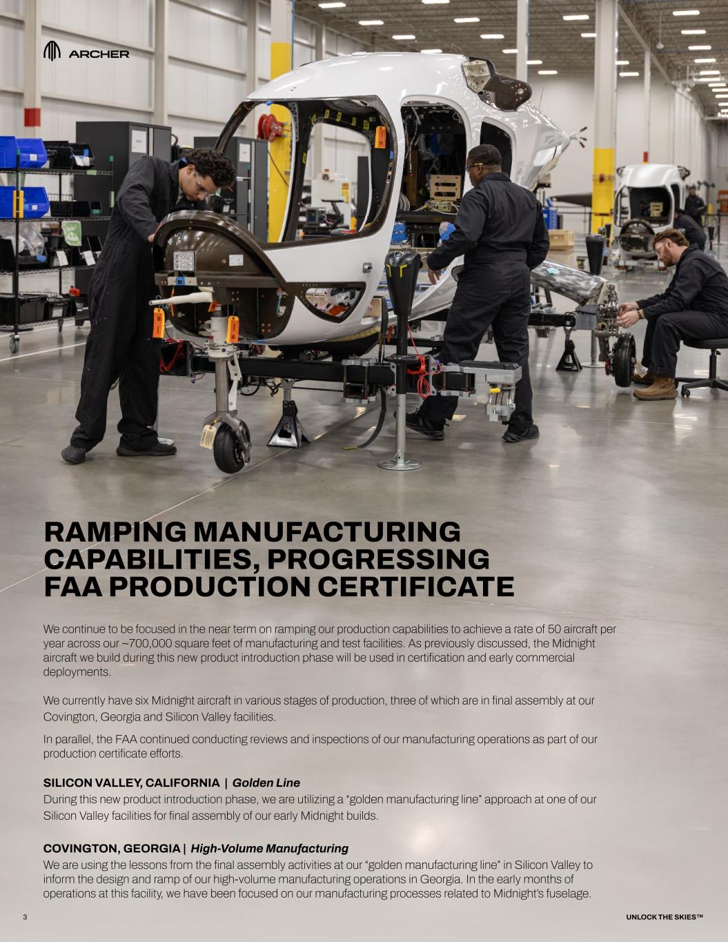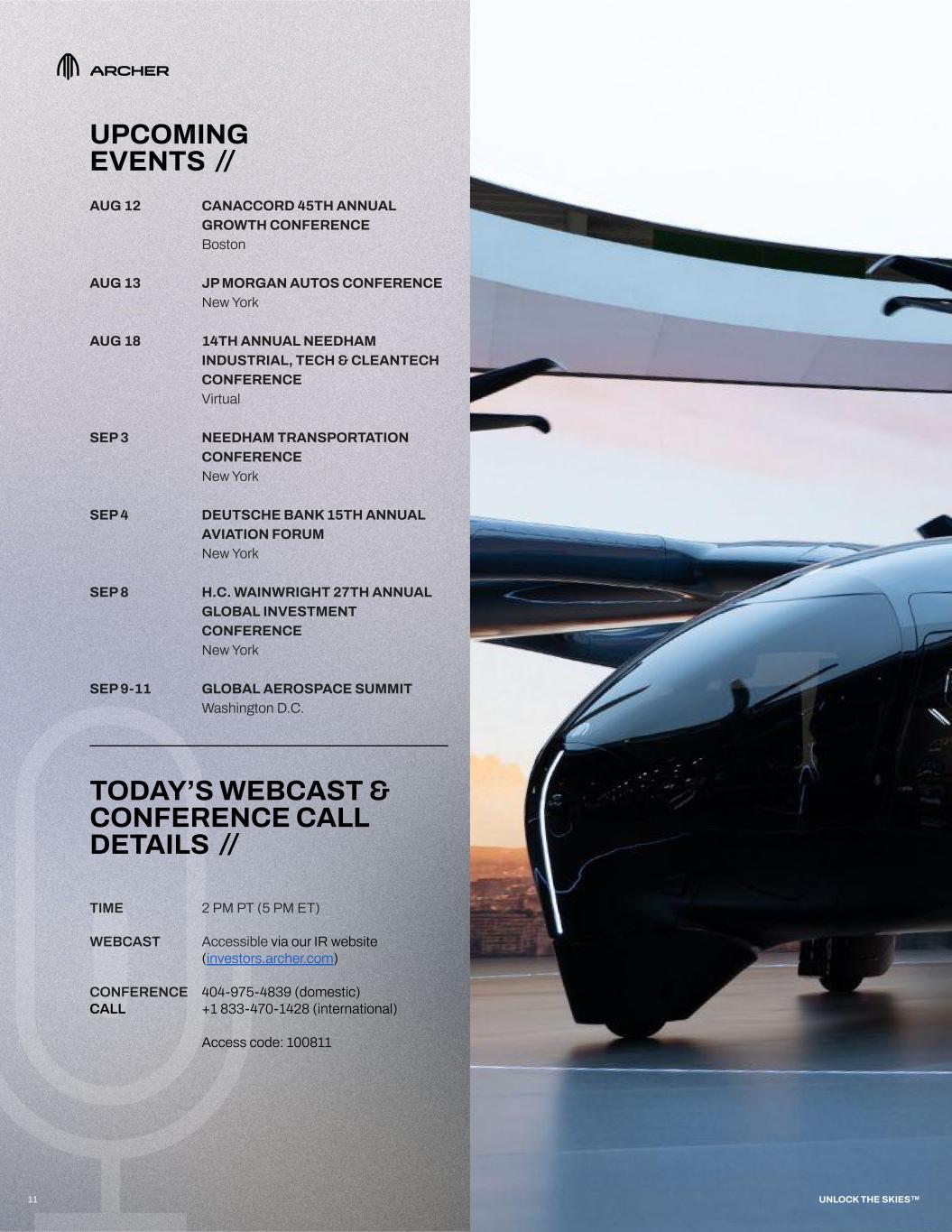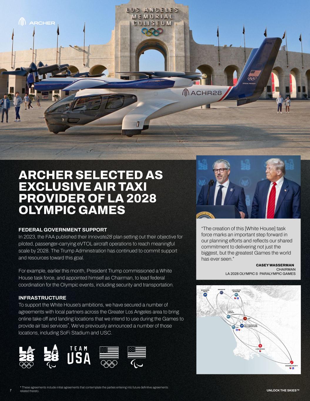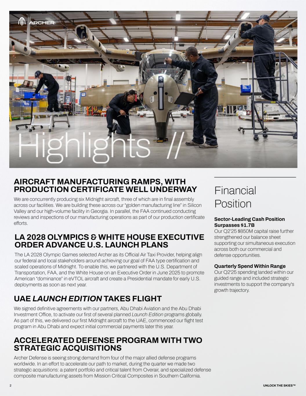 Financial Position Sector-Leading Cash Position Surpasses $1.7B Our Q2’25 $850M capital raise further strengthened our balance sheet supporting our simultaneous execution across both our commercial and defense opportunities. Quarterly Spend Within Range Our Q2'25 spending landed within our guided range and included strategic investments to support the company's growth trajectory. 2 LA 2028 OLYMPICS & WHITE HOUSE EXECUTIVE ORDER ADVANCE U.S. LAUNCH PLANS The LA 2028 Olympic Games selected Archer as its Official Air Taxi Provider, helping align our federal and local stakeholders around achieving our goal of FAA type certification and scaled operations of Midnight. To enable this, we partnered with the U.S. Department of Transportation, FAA, and the White House on an Executive Order in June 2025 to promote American “dominance” in eVTOL aircraft and create a Presidential mandate for early U.S. deployments as soon as next year. UNLOCK THE SKIES™ UAE LAUNCH EDITION TAKES FLIGHT We signed definitive agreements with our partners, Abu Dhabi Aviation and the Abu Dhabi Investment Office, to activate our first of several planned Launch Edition programs globally. As part of this, we delivered our first Midnight aircraft to the UAE, commenced our flight test program in Abu Dhabi and expect initial commercial payments later this year. AIRCRAFT MANUFACTURING RAMPS, WITH PRODUCTION CERTIFICATE WELL UNDERWAY We are concurrently producing six Midnight aircraft, three of which are in final assembly across our facilities. We are building these across our “golden manufacturing line” in Silicon Valley and our high-volume facility in Georgia. In parallel, the FAA continued conducting reviews and inspections of our manufacturing operations as part of our production certificate efforts. ACCELERATED DEFENSE PROGRAM WITH TWO STRATEGIC ACQUISITIONS Archer Defense is seeing strong demand from four of the major allied defense programs worldwide. In an effort to accelerate our path to market, during the quarter we made two strategic acquisitions: a patent portfolio and critical talent from Overair, and specialized defense composite manufacturing assets from Mission Critical Composites in Southern California.