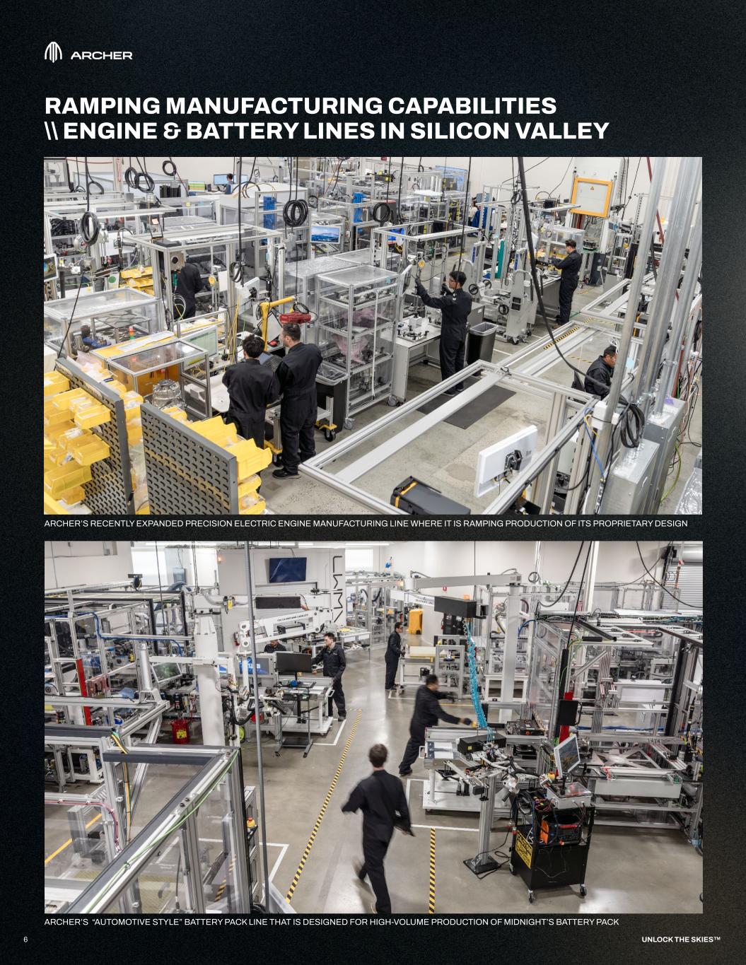 6 UNLOCK THE SKIES™ RAMPING MANUFACTURING CAPABILITIES \\ ENGINE & BATTERY LINES IN SILICON VALLEY ARCHER’S RECENTLY EXPANDED PRECISION ELECTRIC ENGINE MANUFACTURING LINE WHERE IT IS RAMPING PRODUCTION OF ITS PROPRIETARY DESIGN ARCHER’S “AUTOMOTIVE STYLE” BATTERY PACK LINE THAT IS DESIGNED FOR HIGH-VOLUME PRODUCTION OF MIDNIGHT’S BATTERY PACK