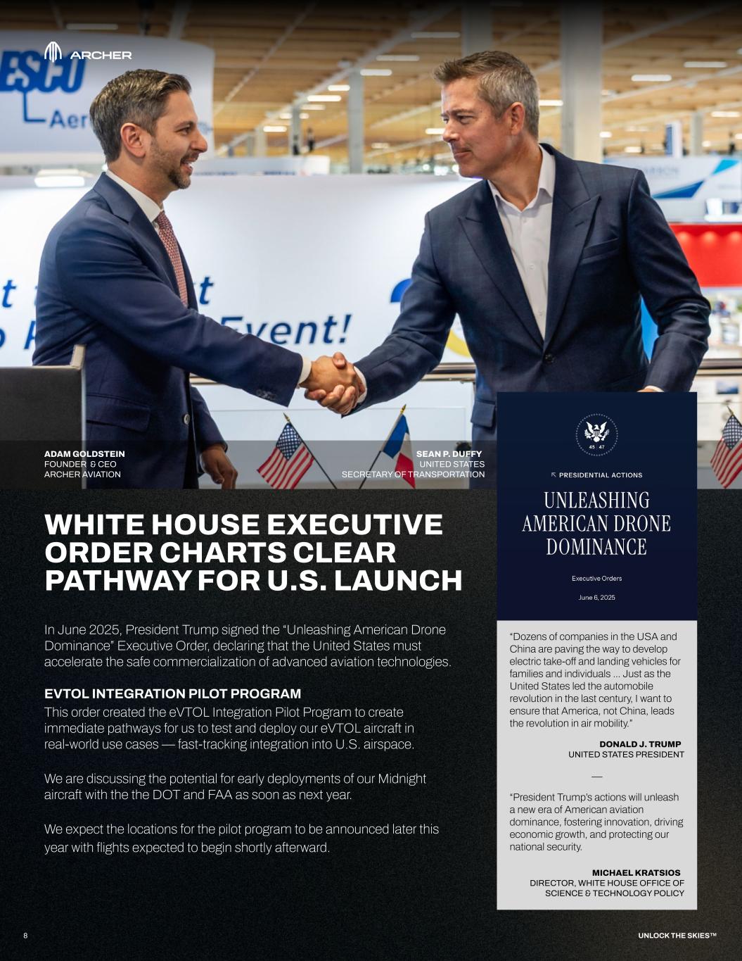 UNLOCK THE SKIES™8 UNLOCK THE SKIES™ WHITE HOUSE EXECUTIVE ORDER CHARTS CLEAR PATHWAY FOR U.S. LAUNCH ADAM GOLDSTEIN FOUNDER & CEO ARCHER AVIATION SEAN P. DUFFY UNITED STATES SECRETARY OF TRANSPORTATION “Dozens of companies in the USA and China are paving the way to develop electric take‑off and landing vehicles for families and individuals … Just as the United States led the automobile revolution in the last century, I want to ensure that America, not China, leads the revolution in air mobility.” DONALD J. TRUMP UNITED STATES PRESIDENT “President Trump’s actions will unleash a new era of American aviation dominance, fostering innovation, driving economic growth, and protecting our national security. MICHAEL KRATSIOS DIRECTOR, WHITE HOUSE OFFICE OF SCIENCE & TECHNOLOGY POLICY — In June 2025, President Trump signed the “Unleashing American Drone Dominance” Executive Order, declaring that the United States must accelerate the safe commercialization of advanced aviation technologies. EVTOL INTEGRATION PILOT PROGRAM This order created the eVTOL Integration Pilot Program to create immediate pathways for us to test and deploy our eVTOL aircraft in real-world use cases — fast-tracking integration into U.S. airspace. We are discussing the potential for early deployments of our Midnight aircraft with the the DOT and FAA as soon as next year. We expect the locations for the pilot program to be announced later this year with flights expected to begin shortly afterward.