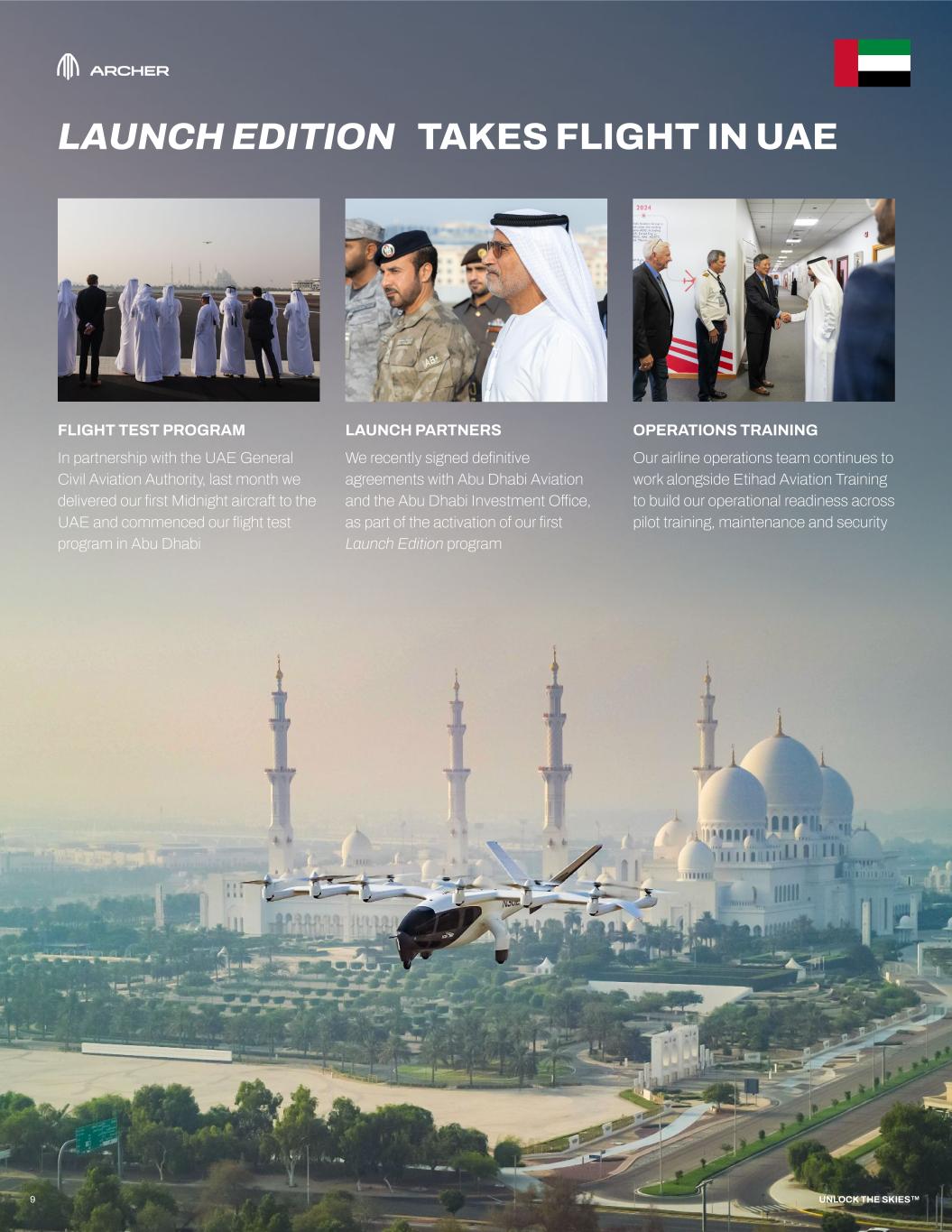 9 UNLOCK THE SKIES™ LAUNCH EDITION TAKES FLIGHT IN UAE LAUNCH PARTNERS We recently signed definitive agreements with Abu Dhabi Aviation and the Abu Dhabi Investment Office, as part of the activation of our first Launch Edition program FLIGHT TEST PROGRAM In partnership with the UAE General Civil Aviation Authority, last month we delivered our first Midnight aircraft to the UAE and commenced our flight test program in Abu Dhabi OPERATIONS TRAINING Our airline operations team continues to work alongside Etihad Aviation Training to build our operational readiness across pilot training, maintenance and security