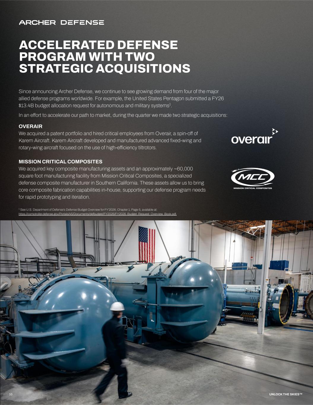 10 Since announcing Archer Defense, we continue to see growing demand from four of the major allied defense programs worldwide. For example, the United States Pentagon submitted a FY26 $13.4B budget allocation request for autonomous and military systems1. In an effort to accelerate our path to market, during the quarter we made two strategic acquisitions: UNLOCK THE SKIES™ ACCELERATED DEFENSE PROGRAM WITH TWO STRATEGIC ACQUISITIONS OVERAIR We acquired a patent portfolio and hired critical employees from Overair, a spin-off of Karem Aircraft. Karem Aircraft developed and manufactured advanced fixed-wing and rotary-wing aircraft focused on the use of high-efficiency tiltrotors. MISSION CRITICAL COMPOSITES We acquired key composite manufacturing assets and an approximately ~60,000 square foot manufacturing facility from Mission Critical Composites, a specialized defense composite manufacturer in Southern California. These assets allow us to bring core composite fabrication capabilities in-house, supporting our defense program needs for rapid prototyping and iteration. 1 See U.S. Department of Defense’s Defense Budget Overview for FY’2026, Chapter 1, Page 5, available at: https://comptroller.defense.gov/Portals/45/Documents/defbudget/FY2026/FY2026_Budget_Request_Overview_Book.pdf,