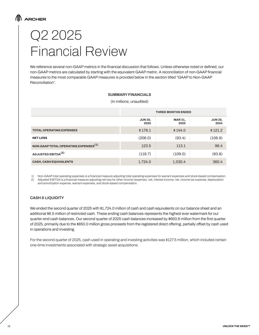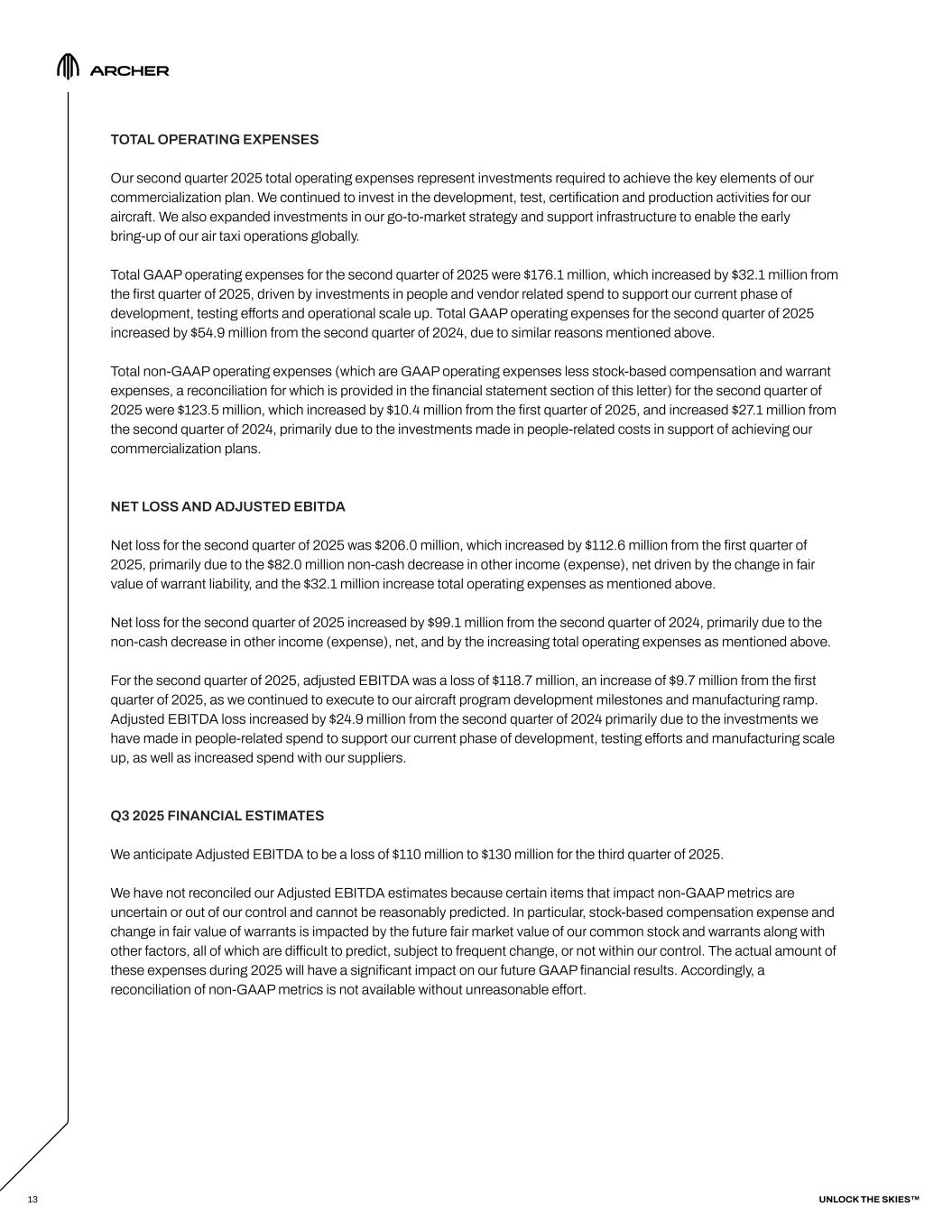 13 TOTAL OPERATING EXPENSES Our second quarter 2025 total operating expenses represent investments required to achieve the key elements of our commercialization plan. We continued to invest in the development, test, certification and production activities for our aircraft. We also expanded investments in our go-to-market strategy and support infrastructure to enable the early bring-up of our air taxi operations globally. Total GAAP operating expenses for the second quarter of 2025 were $176.1 million, which increased by $32.1 million from the first quarter of 2025, driven by investments in people and vendor related spend to support our current phase of development, testing efforts and operational scale up. Total GAAP operating expenses for the second quarter of 2025 increased by $54.9 million from the second quarter of 2024, due to similar reasons mentioned above. Total non-GAAP operating expenses (which are GAAP operating expenses less stock-based compensation and warrant expenses, a reconciliation for which is provided in the financial statement section of this letter) for the second quarter of 2025 were $123.5 million, which increased by $10.4 million from the first quarter of 2025, and increased $27.1 million from the second quarter of 2024, primarily due to the investments made in people-related costs in support of achieving our commercialization plans. NET LOSS AND ADJUSTED EBITDA Net loss for the second quarter of 2025 was $206.0 million, which increased by $112.6 million from the first quarter of 2025, primarily due to the $82.0 million non-cash decrease in other income (expense), net driven by the change in fair value of warrant liability, and the $32.1 million increase total operating expenses as mentioned above. Net loss for the second quarter of 2025 increased by $99.1 million from the second quarter of 2024, primarily due to the non-cash decrease in other income (expense), net, and by the increasing total operating expenses as mentioned above. For the second quarter of 2025, adjusted EBITDA was a loss of $118.7 million, an increase of $9.7 million from the first quarter of 2025, as we continued to execute to our aircraft program development milestones and manufacturing ramp. Adjusted EBITDA loss increased by $24.9 million from the second quarter of 2024 primarily due to the investments we have made in people-related spend to support our current phase of development, testing efforts and manufacturing scale up, as well as increased spend with our suppliers. Q3 2025 FINANCIAL ESTIMATES We anticipate Adjusted EBITDA to be a loss of $110 million to $130 million for the third quarter of 2025. We have not reconciled our Adjusted EBITDA estimates because certain items that impact non-GAAP metrics are uncertain or out of our control and cannot be reasonably predicted. In particular, stock-based compensation expense and change in fair value of warrants is impacted by the future fair market value of our common stock and warrants along with other factors, all of which are difficult to predict, subject to frequent change, or not within our control. The actual amount of these expenses during 2025 will have a significant impact on our future GAAP financial results. Accordingly, a reconciliation of non-GAAP metrics is not available without unreasonable effort. UNLOCK THE SKIES™