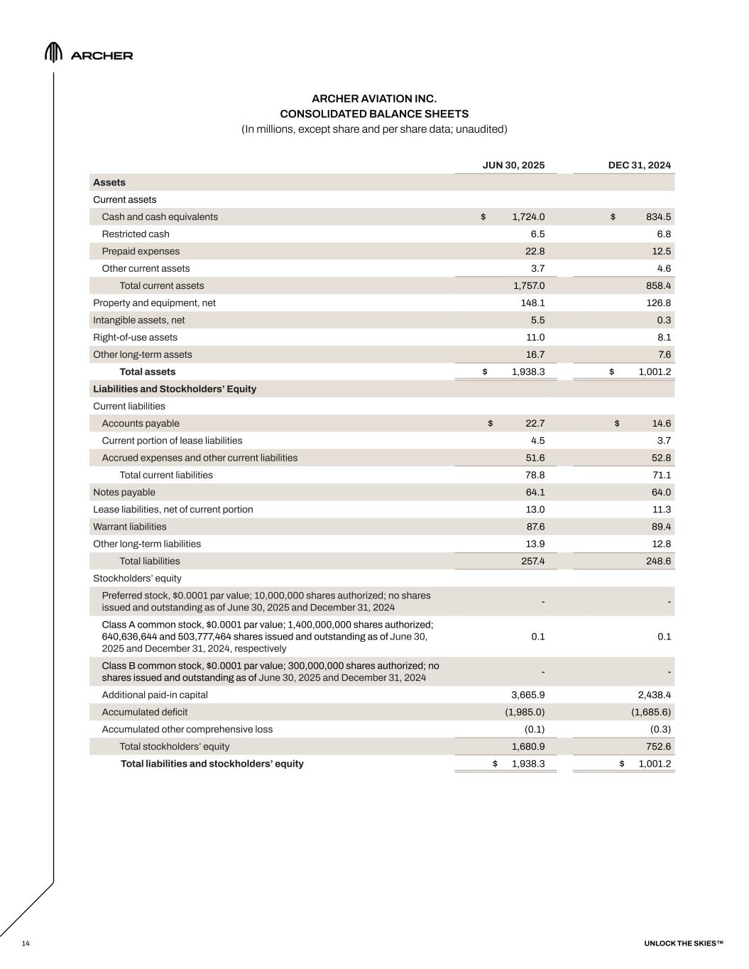 ARCHER AVIATION INC. CONSOLIDATED BALANCE SHEETS (In millions, except share and per share data; unaudited) 14 JUN 30, 2025 DEC 31, 2024 Assets Current assets Cash and cash equivalents $ 1,724.0 $ 834.5 Restricted cash 6.5 6.8 Prepaid expenses 22.8 12.5 Other current assets 3.7 4.6 Total current assets 1,757.0 858.4 Property and equipment, net 148.1 126.8 Intangible assets, net 5.5 0.3 Right-of-use assets 11.0 8.1 Other long-term assets 16.7 7.6 Total assets $ 1,938.3 $ 1,001.2 Liabilities and Stockholders’ Equity Current liabilities Accounts payable $ 22.7 $ 14.6 Current portion of lease liabilities 4.5 3.7 Accrued expenses and other current liabilities 51.6 52.8 Total current liabilities 78.8 71.1 Notes payable 64.1 64.0 Lease liabilities, net of current portion 13.0 11.3 Warrant liabilities 87.6 89.4 Other long-term liabilities 13.9 12.8 Total liabilities 257.4 248.6 Stockholders’ equity Preferred stock, $0.0001 par value; 10,000,000 shares authorized; no shares issued and outstanding as of June 30, 2025 and December 31, 2024 - - Class A common stock, $0.0001 par value; 1,400,000,000 shares authorized; 640,636,644 and 503,777,464 shares issued and outstanding as of June 30, 2025 and December 31, 2024, respectively 0.1 0.1 Class B common stock, $0.0001 par value; 300,000,000 shares authorized; no shares issued and outstanding as of June 30, 2025 and December 31, 2024 - - Additional paid-in capital 3,665.9 2,438.4 Accumulated deficit (1,985.0) (1,685.6) Accumulated other comprehensive loss (0.1) (0.3) Total stockholders’ equity 1,680.9 752.6 Total liabilities and stockholders’ equity $ 1,938.3 $ 1,001.2 UNLOCK THE SKIES™