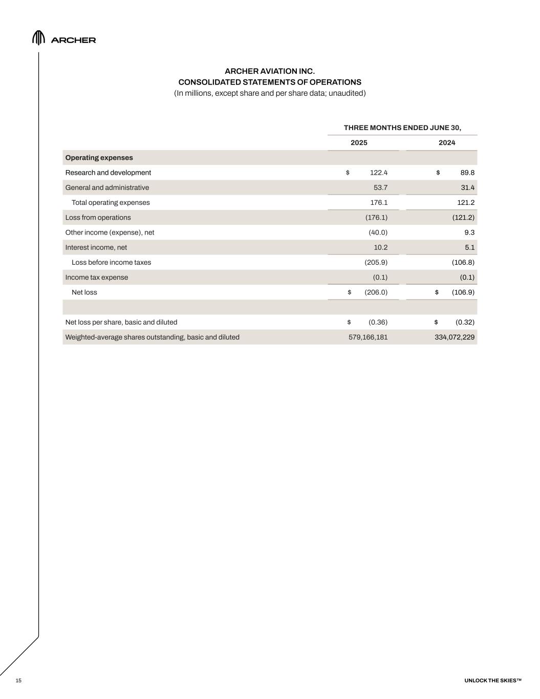 ARCHER AVIATION INC. CONSOLIDATED STATEMENTS OF OPERATIONS (In millions, except share and per share data; unaudited) 15 THREE MONTHS ENDED JUNE 30, 2025 2024 Operating expenses Research and development $ 122.4 $ 89.8 General and administrative 53.7 31.4 Total operating expenses 176.1 121.2 Loss from operations (176.1) (121.2) Other income (expense), net (40.0) 9.3 Interest income, net 10.2 5.1 Loss before income taxes (205.9) (106.8) Income tax expense (0.1) (0.1) Net loss $ (206.0) $ (106.9) Net loss per share, basic and diluted $ (0.36) $ (0.32) Weighted-average shares outstanding, basic and diluted 579,166,181 334,072,229 UNLOCK THE SKIES™