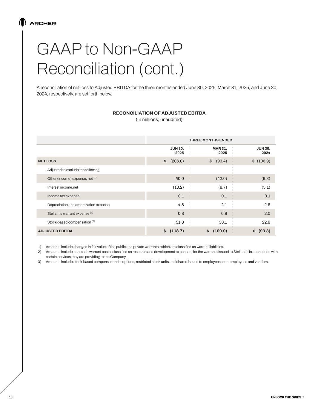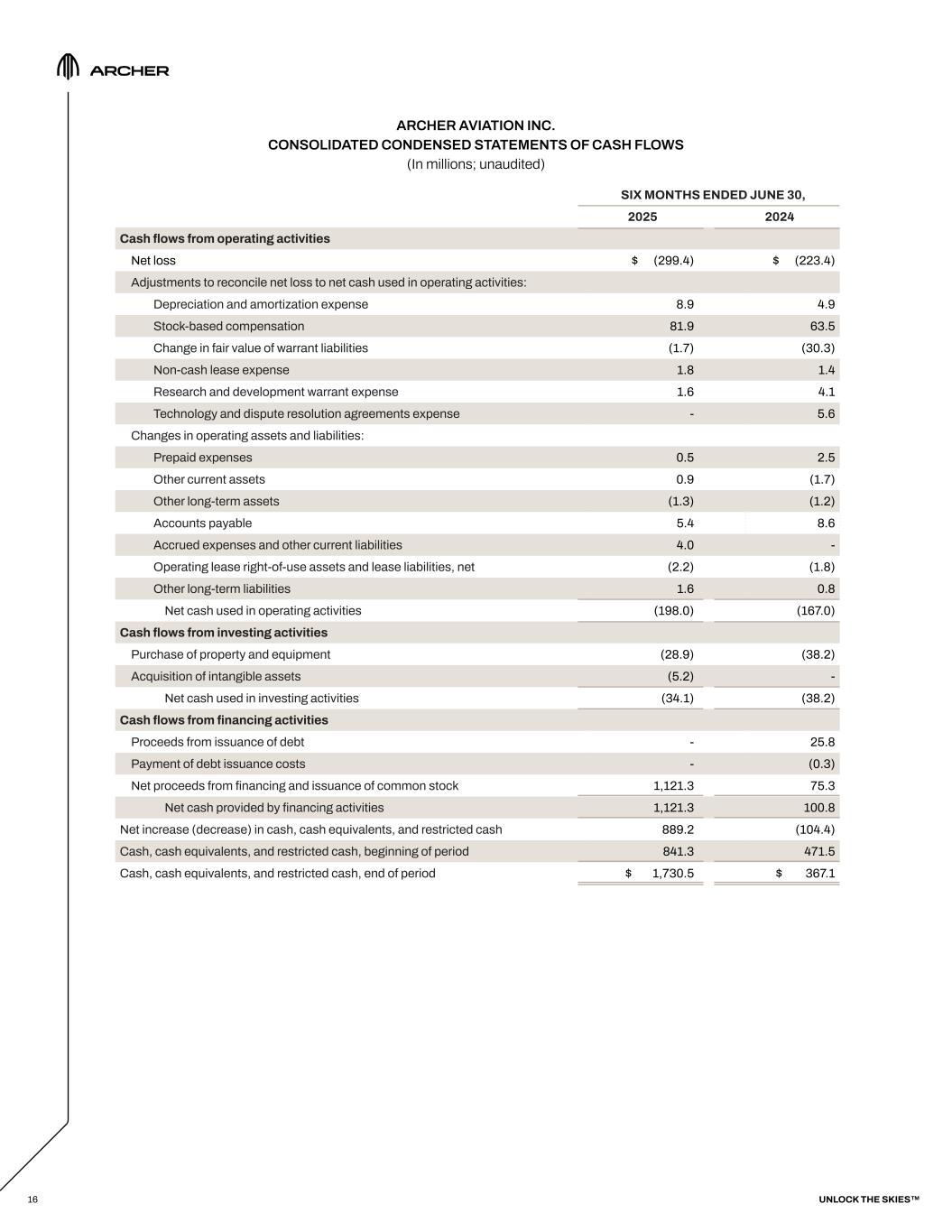 ARCHER AVIATION INC. CONSOLIDATED CONDENSED STATEMENTS OF CASH FLOWS (In millions; unaudited) 16 SIX MONTHS ENDED JUNE 30, 2025 2024 Cash flows from operating activities Net loss $ (299.4) $ (223.4) Adjustments to reconcile net loss to net cash used in operating activities: Depreciation and amortization expense 8.9 4.9 Stock-based compensation 81.9 63.5 Change in fair value of warrant liabilities (1.7) (30.3) Non-cash lease expense 1.8 1.4 Research and development warrant expense 1.6 4.1 Technology and dispute resolution agreements expense - 5.6 Changes in operating assets and liabilities: Prepaid expenses 0.5 2.5 Other current assets 0.9 (1.7) Other long-term assets (1.3) (1.2) Accounts payable 5.4 8.6 Accrued expenses and other current liabilities 4.0 - Operating lease right-of-use assets and lease liabilities, net (2.2) (1.8) Other long-term liabilities 1.6 0.8 Net cash used in operating activities (198.0) (167.0) Cash flows from investing activities Purchase of property and equipment (28.9) (38.2) Acquisition of intangible assets (5.2) - Net cash used in investing activities (34.1) (38.2) Cash flows from financing activities Proceeds from issuance of debt - 25.8 Payment of debt issuance costs - (0.3) Net proceeds from financing and issuance of common stock 1,121.3 75.3 Net cash provided by financing activities 1,121.3 100.8 Net increase (decrease) in cash, cash equivalents, and restricted cash 889.2 (104.4) Cash, cash equivalents, and restricted cash, beginning of period 841.3 471.5 Cash, cash equivalents, and restricted cash, end of period $ 1,730.5 $ 367.1 UNLOCK THE SKIES™