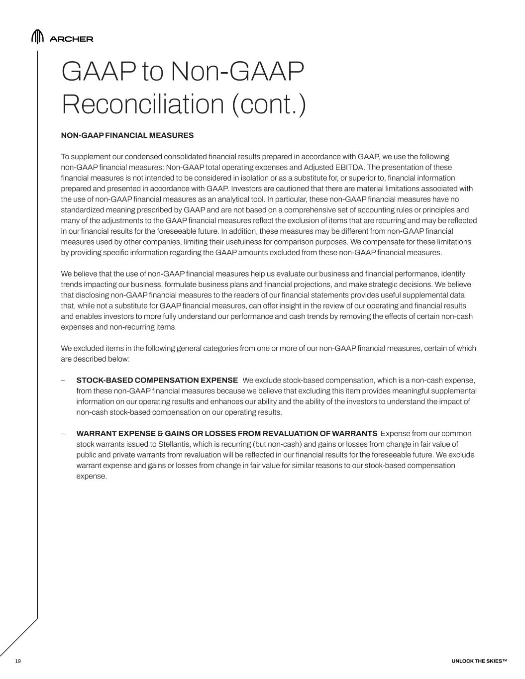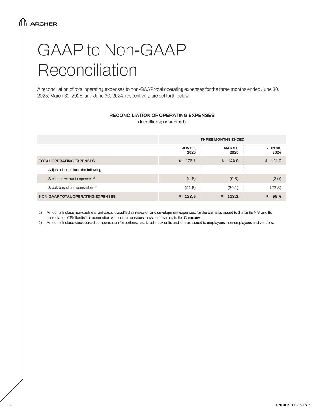 GAAP to Non-GAAP Reconciliation A reconciliation of total operating expenses to non-GAAP total operating expenses for the three months ended June 30, 2025, March 31, 2025, and June 30, 2024, respectively, are set forth below. RECONCILIATION OF OPERATING EXPENSES (In millions; unaudited) 1) Amounts include non-cash warrant costs, classified as research and development expenses, for the warrants issued to Stellantis N.V. and its subsidiaries (“Stellantis”) in connection with certain services they are providing to the Company. 2) Amounts include stock-based compensation for options, restricted stock units and shares issued to employees, non-employees and vendors. 17 THREE MONTHS ENDED JUN 30, 2025 MAR 31, 2025 JUN 30, 2024 TOTAL OPERATING EXPENSES $ 176.1 $ 144.0 $ 121.2 Adjusted to exclude the following: Stellantis warrant expense (1) (0.8) (0.8) (2.0) Stock-based compensation (2) (51.8) (30.1) (22.8) NON-GAAP TOTAL OPERATING EXPENSES $ 123.5 $ 113.1 $ 96.4 UNLOCK THE SKIES™