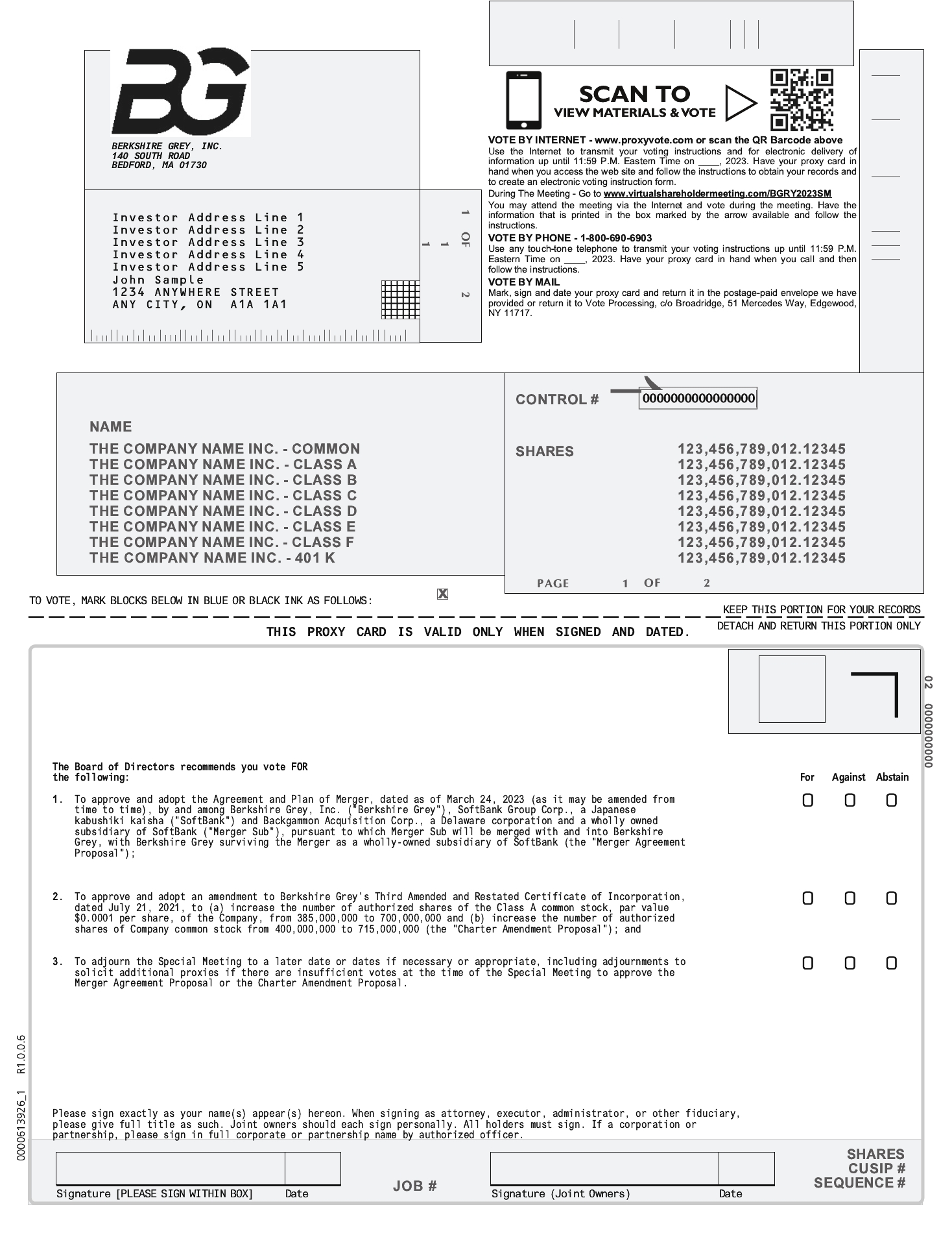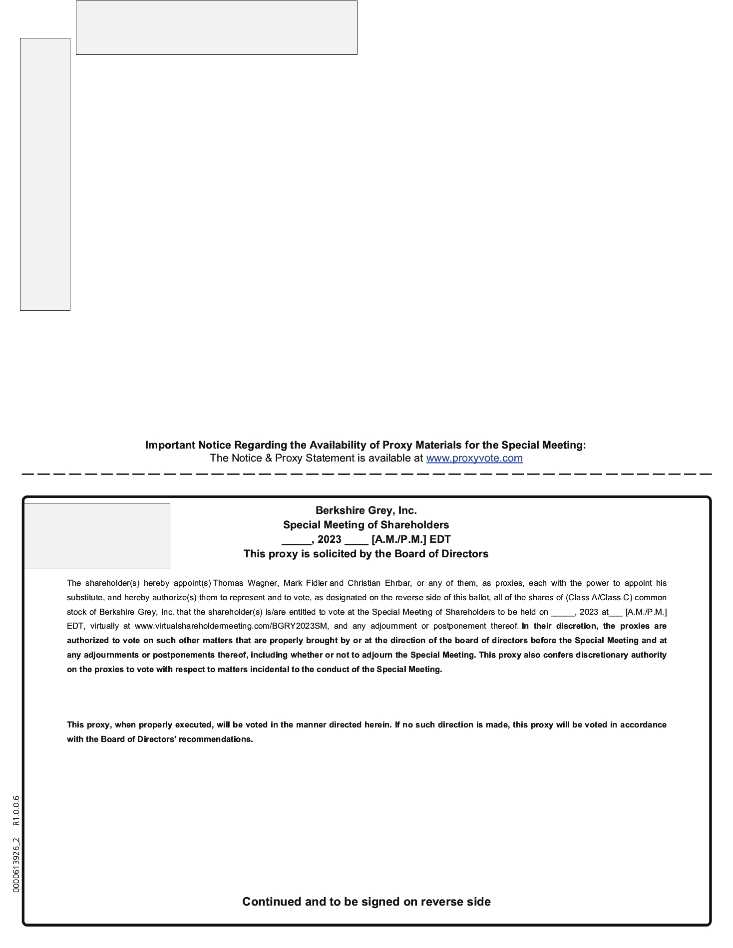You are cordially invited to attend a special meeting (we refer to such meeting, including any adjournment or postponement thereof, as the “Special Meeting”) of the stockholders of Berkshire Grey, Inc. (“Berkshire Grey,” the “Company” or “us”) to be held on   , 2023, at   [a.m./p.m.] Eastern Time via live audio webcast on the Internet at www.virtualshareholdermeeting.com/BGRY2023SM. The Special Meeting will be held for the following purposes:
