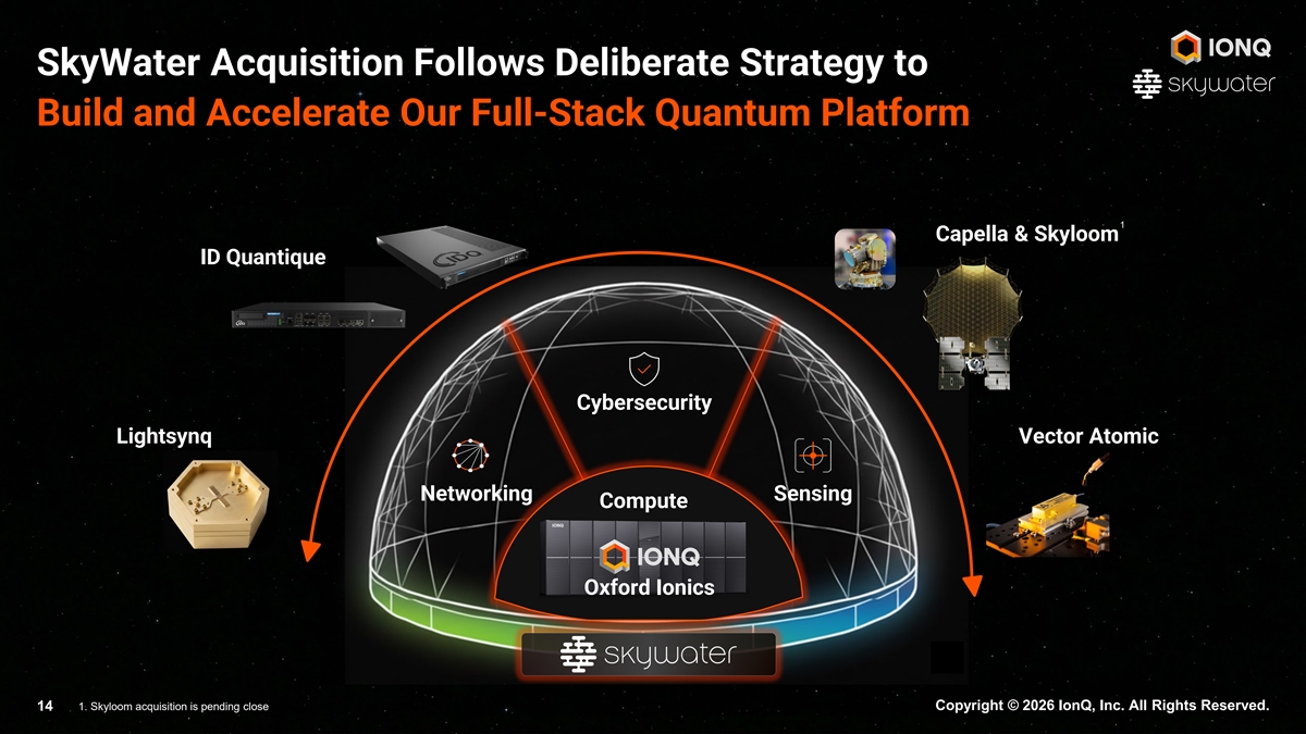 Important Information and Where to Find It In connection with the acquisition described in this presentation (the “Transaction”), IonQ, Inc. (“IonQ”) intends to file with the Securities and Exchange Commission (the “SEC”) a Registration Statement on Form S-4 (the “Registration Statement ) which will include a prospectus with respect to the shares of IonQ common stock (the “IonQ Shares”) to be issued in the Transaction and a proxy statement (the “Proxy Statement/Prospectus”) for stockholders of SkyWater Technology, Inc. (“SkyWater”) and SkyWater intends to file with the SEC the proxy statement. The definitive proxy statement (if and when available following the effectiveness of the Registration Statement) will be mailed to stockholders of SkyWater. Each of IonQ and SkyWater may also file with or furnish to the SEC other relevant documents regarding the Transaction. This presentation is not a substitute for the Registration Statement, the Proxy Statement/Prospectus or any other document that IonQ or SkyWater may file with the SEC or mail to SkyWater’s stockholders in connection with the Transaction. INVESTORS AND SECURITY HOLDERS OF IONQ AND SKYWATER ARE URGED TO READ THE REGISTRATION STATEMENT AND THE PROXY STATEMENT/PROSPECTUS INCLUDED WITHIN THE REGISTRATION STATEMENT WHEN THEY BECOME AVAILABLE, AS WELL AS ANY OTHER RELEVANT DOCUMENTS FILED WITH THE SEC IN CONNECTION WITH THE TRANSACTION OR INCORPORATED BY REFERENCE INTO THE REGISTRATION STATEMENT AND THE PROXY STATEMENT/PROSPECTUS (INCLUDING ANY AMENDMENTS OR SUPPLEMENTS THERETO), BECAUSE THEY WILL CONTAIN IMPORTANT INFORMATION REGARDING IONQ, SKYWATER, THE TRANSACTION AND RELATED MATTERS. The documents filed by IonQ with the SEC also may be obtained free of charge at IonQ’s website at investors.IonQ.com. The documents filed by SkyWater with the SEC also may be obtained free of charge at SkyWater’s website at ir.skywatertechnology.com. Participants in the Solicitation IonQ, SkyWater and certain of their respective directors and executive officers may be deemed to be participants in the solicitation of proxies from the stockholders of SkyWater in connection with the Transaction under the rules of the SEC. Information about the interests of the directors and executive officers of IonQ and SkyWater and other persons who may be deemed to be participants in the solicitation of stockholders of SkyWater in connection with the Transaction and a description of their direct and indirect interests, by security holdings or otherwise, will be included in the Proxy Statement/Prospectus, which will be filed with the SEC. Information about SkyWater’s directors and executive officers is set forth in SkyWater’s proxy statement for its 2025 Annual Meeting of Stockholders on Schedule 14A filed with the SEC on April 8, 2025, SkyWater’s Annual Report on Form 10-K for the year ended December 29, 2024 and any subsequent filings with the SEC. Information about certain of IonQ’s directors and executive officers is set forth in IonQ’s proxy statement for its 2025 Annual Meeting of Stockholders on Schedule 14A filed with the SEC on April 28, 2025 and any subsequent filings with the SEC. Additional information regarding the direct and indirect interests of those persons and other persons who may be deemed participants in the Transaction may be obtained by reading the Proxy Statement/Prospectus regarding the Transaction when it becomes available. Free copies of these documents may be obtained as described above. No Offer or Solicitation This communication is for informational purposes only and does not constitute, or form a part of, an offer to sell or the solicitation of an offer to buy any securities or a solicitation of any vote or approval, nor shall there be any sale of securities in any jurisdiction in which such offer, solicitation or sale would be unlawful prior to registration or qualification under the securities laws of any such jurisdiction. No offer of securities shall be made except by means of a prospectus meeting the requirements of Section 10 of the Securities Act of 1933, as amended, and otherwise in accordance with applicable law. Trademarks The companies depicted in the photographs herein, or in any third-party trademarks, including names, logos and brands, referenced in this presentation, are the property of their respective owners. All references to third-party trademarks are for identification purposes only and nothing herein should be considered to be an endorsement, authorization or approval by any such company. Note to Investors Regarding Forward-Looking Statements This presentation contains “forward-looking statements” within the meaning of the federal securities laws, including Section 27A of the U.S. Securities Act of 1933, as amended, and Section 21E of the Securities Exchange Act of 1934, as amended. All statements contained in this presentation other than statements of historical fact are forward-looking statements. These forward-looking statements are based on IonQ’s and SkyWater’s current expectations, estimates and projections about the expected date of closing of the Transaction and the potential benefits thereof, their respective businesses and industries, management’s beliefs and certain assumptions made by IonQ and SkyWater, all of which are subject to change. All forward-looking statements by their nature address matters that involve risks and uncertainties, many of which are beyond our control and are not guarantees of future results, such as statements about the consummation of the Transaction and the anticipated benefits thereof. These and other forward-looking statements, including the failure to consummate the Transaction or to make or take any filing or other action required to consummate the Transaction in a timely matter or at all, are not guarantees of future results and are subject to risks, uncertainties and assumptions that could cause actual results to differ ma