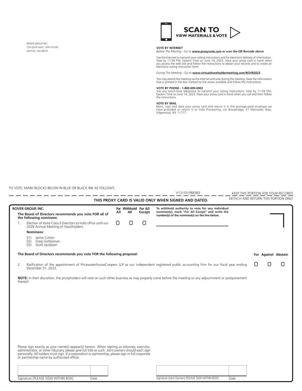 Signature [PLEASE SIGN WITHIN BOX] Date Signature (Joint Owners) [PLEASE SIGN WITHIN BOX] Date TO VOTE, MARK BLOCKS BELOW IN BLUE OR BLACK INK AS FOLLOWS: KEEP THIS PORTION FOR YOUR RECORDS DETACH AND RETURN THIS PORTION ONLYTHIS PROXY CARD IS VALID ONLY WHEN SIGNED AND DATED. V13133-P88383 ! ! ! For All Withhold All For All Except For Against Abstain ! !! To withhold authority to vote for any individual nominee(s), mark "For All Except" and write the number(s) of the nominee(s) on the line below. ROVER GROUP, INC. 720 OLIVE WAY, 19TH FLOOR SEATTLE, WA 98101 VOTE BY INTERNET Before The Meeting - Go to www.proxyvote.com or scan the QR Barcode above Use the Internet to transmit your voting instructions and for electronic delivery of information. Vote by 11:59 P.M. Eastern Time on June 14, 2023. Have your proxy card in hand when you access the web site and follow the instructions to obtain your records and to create an electronic voting instruction form. During The Meeting - Go to www.virtualshareholdermeeting.com/ROVR2023 You may attend the meeting via the Internet and vote during the meeting. Have the information that is printed in the box marked by the arrow available and follow the instructions. VOTE BY PHONE - 1-800-690-6903 Use any touch-tone telephone to transmit your voting instructions. Vote by 11:59 P.M. Eastern Time on June 14, 2023. Have your proxy card in hand when you call and then follow the instructions. VOTE BY MAIL Mark, sign and date your proxy card and return it in the postage-paid envelope we have provided or return it to Vote Processing, c/o Broadridge, 51 Mercedes Way, Edgewood, NY 11717. SCAN TO VIEW MATERIALS & VOTEw Nominees: 01) Jamie Cohen 02) Greg Gottesman 03) Scott Jacobson 1. Election of three Class II Directors to hold office until our 2026 Annual Meeting of Stockholders. Please sign exactly as your name(s) appear(s) hereon. When signing as attorney, executor, administrator, or other fiduciary, please give full title as such. Joint owners should each sign personally. All holders must sign. If a corporation or partnership, please sign in full corporate or partnership name by authorized officer. ROVER GROUP, INC. The Board of Directors recommends you vote FOR all of the following nominees: The Board of Directors recommends you vote FOR the following proposal: 2. Ratification of the appointment of PricewaterhouseCoopers LLP as our independent registered public accounting firm for our fiscal year ending December 31, 2023. NOTE: In their discretion, the proxyholders will vote on such other business as may properly come before the meeting or any adjournment or postponement thereof.