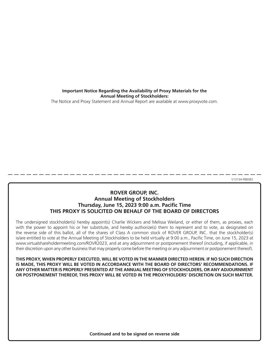 V13134-P88383 Important Notice Regarding the Availability of Proxy Materials for the Annual Meeting of Stockholders: The Notice and Proxy Statement and Annual Report are available at www.proxyvote.com. ROVER GROUP, INC. Annual Meeting of Stockholders Thursday, June 15, 2023 9:00 a.m. Pacific Time THIS PROXY IS SOLICITED ON BEHALF OF THE BOARD OF DIRECTORS The undersigned stockholder(s) hereby appoint(s) Charlie Wickers and Melissa Weiland, or either of them, as proxies, each with the power to appoint his or her substitute, and hereby authorize(s) them to represent and to vote, as designated on the reverse side of this ballot, all of the shares of Class A common stock of ROVER GROUP, INC. that the stockholder(s) is/are entitled to vote at the Annual Meeting of Stockholders to be held virtually at 9:00 a.m., Pacific Time, on June 15, 2023 at www.virtualshareholdermeeting.com/ROVR2023, and at any adjournment or postponement thereof (including, if applicable, in their discretion upon any other business that may properly come before the meeting or any adjournment or postponement thereof). THIS PROXY, WHEN PROPERLY EXECUTED, WILL BE VOTED IN THE MANNER DIRECTED HEREIN. IF NO SUCH DIRECTION IS MADE, THIS PROXY WILL BE VOTED IN ACCORDANCE WITH THE BOARD OF DIRECTORS' RECOMMENDATIONS. IF ANY OTHER MATTER IS PROPERLY PRESENTED AT THE ANNUAL MEETING OF STOCKHOLDERS, OR ANY ADJOURNMENT OR POSTPONEMENT THEREOF, THIS PROXY WILL BE VOTED IN THE PROXYHOLDERS' DISCRETION ON SUCH MATTER. Continued and to be signed on reverse side