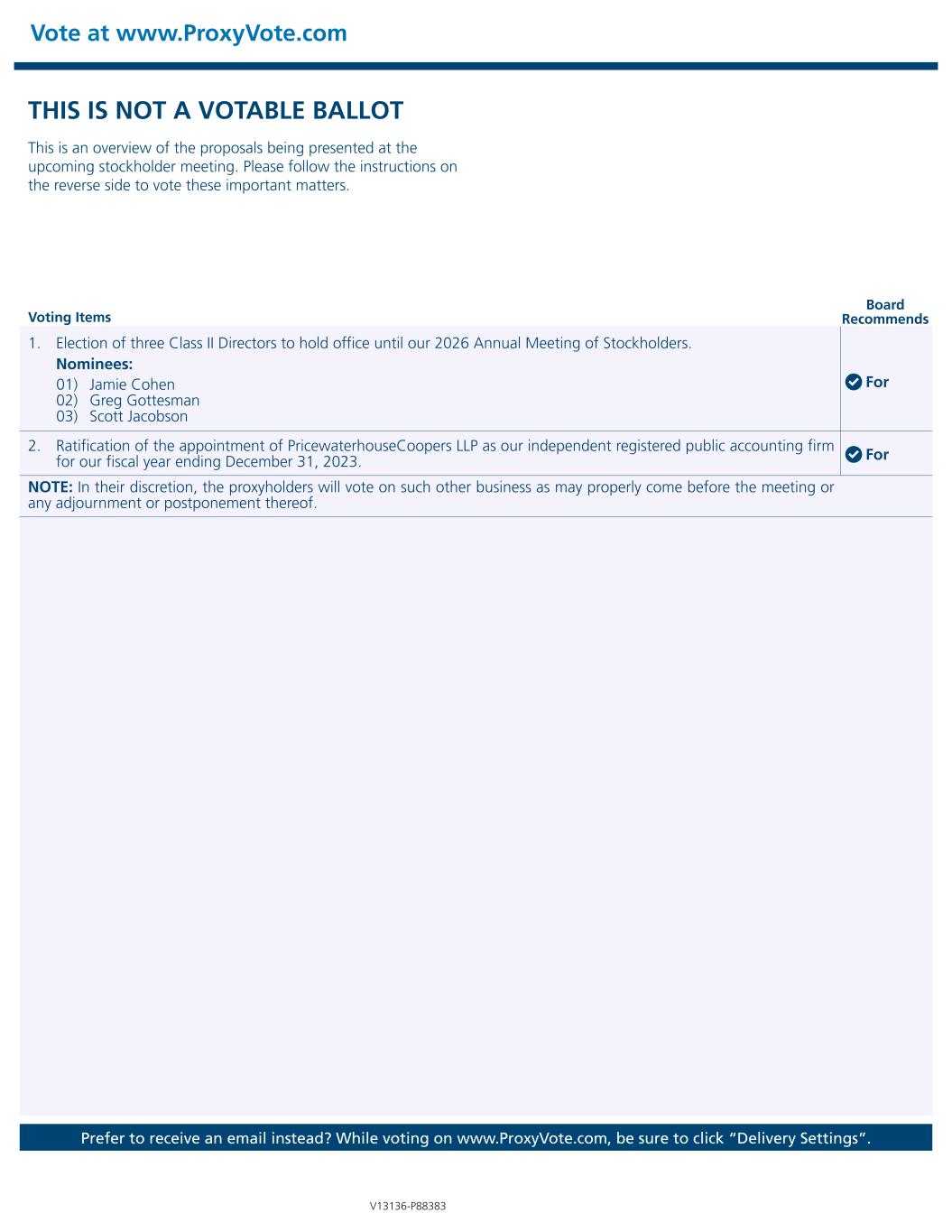THIS IS NOT A VOTABLE BALLOT This is an overview of the proposals being presented at the upcoming stockholder meeting. Please follow the instructions on the reverse side to vote these important matters. Vote at www.ProxyVote.com Voting Items Board Recommends V13136-P88383 Prefer to receive an email instead? While voting on www.ProxyVote.com, be sure to click “Delivery Settings”. 01) Jamie Cohen 02) Greg Gottesman 03) Scott Jacobson 1. Election of three Class II Directors to hold office until our 2026 Annual Meeting of Stockholders. Nominees: 2. Ratification of the appointment of PricewaterhouseCoopers LLP as our independent registered public accounting firm for our fiscal year ending December 31, 2023. NOTE: In their discretion, the proxyholders will vote on such other business as may properly come before the meeting or any adjournment or postponement thereof. For For
