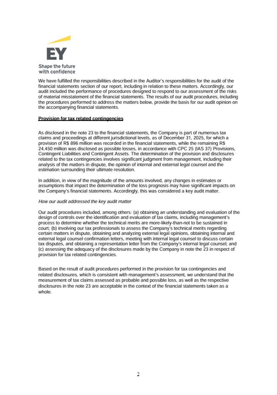 Based on our examinations, the information provided and the clarifications received and, also, considering the Company's Independent Auditors’ Report, Ernst & Young Auditores Independentes S/S (“EY”), unqualified, issued on February 10th, 2026, the Fiscal Council, unanimously, is of the opinion that: (i) the Management’s Report and the Financial Statements above mentioned, adequately reflect the information contained in them; and (ii) the Management’s Proposal for the allocation of results related to the year of 2025 and the distribution of dividends by the Company, are all in conditions to be submitted to the Annual General Shareholders Meeting.