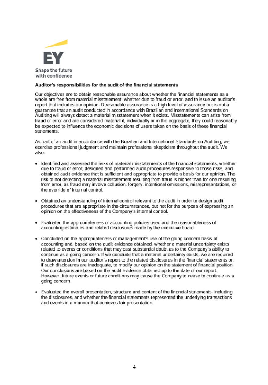 As determined by the auditing standards (ISA 260), which provide for communication with those charged with the Company's governance, the auditor must communicate, among other matters, the following: (i) their responsibilities in relation to the audit of the financial statements; (ii) overview of its Audit Plan for the fiscal year; (iii) its view on the significant qualitative aspects of the Company's accounting practices, including accounting policies and estimates, and disclosures in the financial statements; (iv) significant difficulties encountered during the audit, if any; (v) aspects of independence, including formal confirmation of its independence from the Company; (vi) written notice to the persons in charge of governance of the significant findings arising from the audit; and (vii) as determined by ISA 701, communicate which Key Audit Matters (“KAMs”) to be considered in the Independent Auditor's Report.
