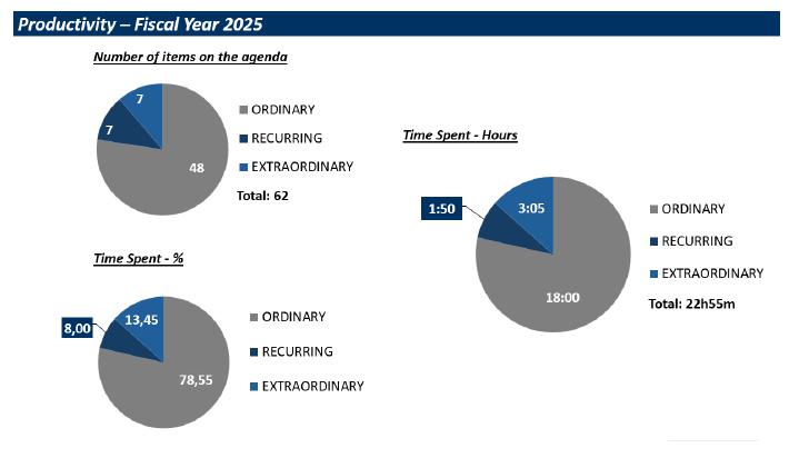 Meetings had an average duration of 1 hour and 27 minutes, and during the sessions the Chairman of the Board of Directors, the Chief Executive Officer, and the Chief Financial Officer were directly involved, as well as other members of the Board of Officers, the heads of Internal Audit and Risk & Compliance, and the Independent Auditors.