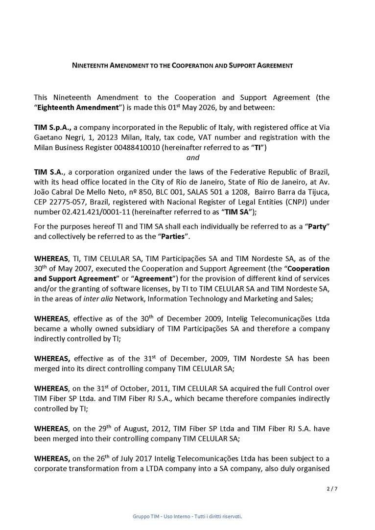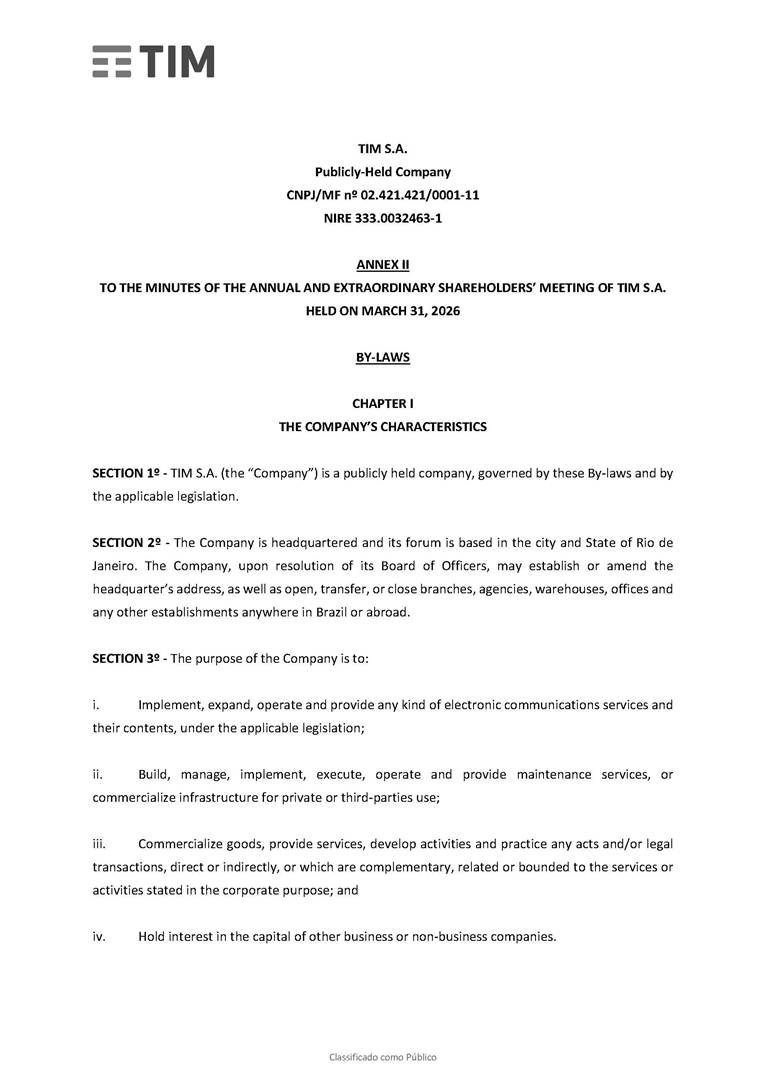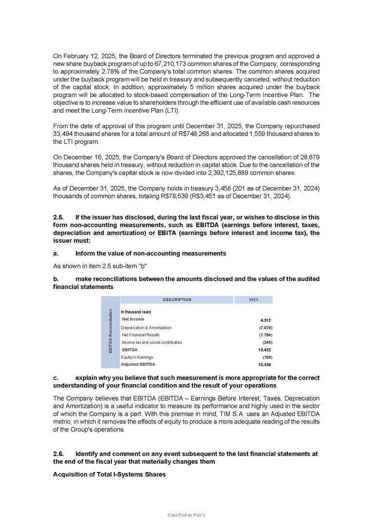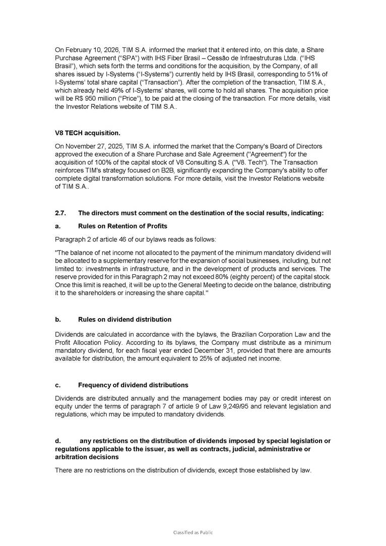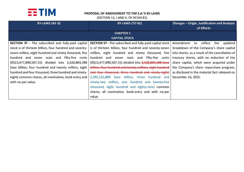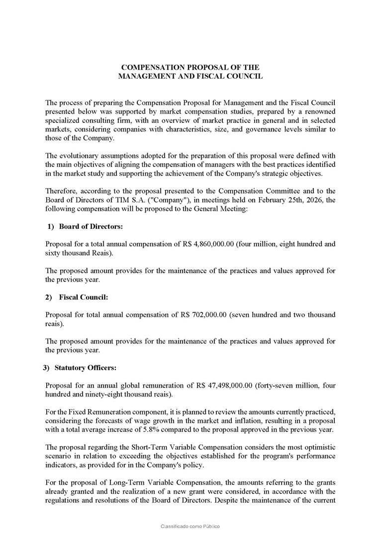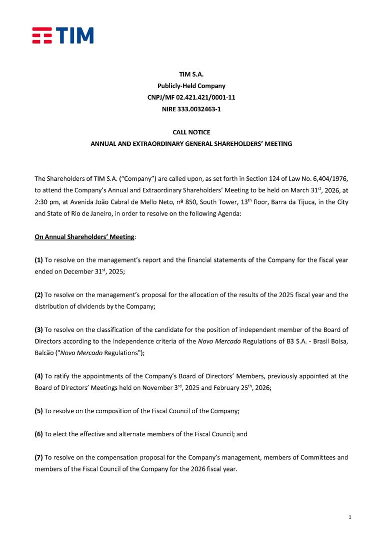 Management Proposal AGM/ EGM 2026 Annual and Extraordinary Shareholders’ Meeting March 31st, 2026 Time: 02h30 p.m. Location: Avenida João Cabral de Mello Neto, nº 850, South Tower, 13th floor, Barra da Tijuca, in the City and State of Rio de Janeiro Summary Item Subject Page 1. Call Notice 04 2. Management’s report and Consolidated Financial Statements of the Company, dated as of December 31st, 2025 09 3. Item 2 from the Reference Form 11 4. Proposal for the allocation of the results related to the fiscal year 2025 by the Company 26 5. To ratify the appointments of the Company’s Board of Directors’ Members, previously appointed at the Board of Directors’ Meetings held on November 3rd, 2025 and February 25th, 2026 6. Appointed to the positions of effective members and respective alternates of the Company's Fiscal Council 39 7. Compensation Proposal for the Company’s Administrators and Fiscal Council members for the year of 2026 49 8. Item 8 from the Reference Form 52 9. Proposal of extension of the Cooperation and Support Agreement 79 10. Fairness Evaluation of the Cooperation and Support Agreement 81 11. 19th Amendment to the Cooperation and Support Agreement 101 12. Proposal to amendment and restatement of the Company’s By-laws 109 36 01 – Call Notice 1 TIM S.A. Publicly-Held Company CNPJ/MF 02.421.421/0001-11 NIRE 333.0032463-1 CALL NOTICE ANNUAL AND EXTRAORDINARY GENERAL SHAREHOLDERS’ MEETING The Shareholders of TIM S.A. (“Company”) are called upon, as set forth in Section 124 of Law No. 6,404/1976, to attend the Company’s Annual and Extraordinary Shareholders’ Meeting to be held on March 31st, 2026, at 2:30 pm, at Avenida João Cabral de Mello Neto, nº 850, South Tower, 13th floor, Barra da Tijuca, in the City and State of Rio de Janeiro, in order to resolve on the following Agenda: On Annual Shareholders’ Meeting: (1) To resolve on the management’s report and the financial statements of the Company for the fiscal year ended on December 31st, 2025; (2) To resolve on the management’s proposal for the allocation of the results of the 2025 fiscal year and the distribution of dividends by the Company; (3) To resolve on the classification of the candidate for the position of independent member of the Board of Directors according to the independence criteria of the Novo Mercado Regulations of B3 S.A. - Brasil Bolsa, Balcão ("Novo Mercado Regulations"); (4) To ratify the appointments of the Company’s Board of Directors’ Members, previously appointed at the Board of Directors’ Meetings held on November 3rd, 2025 and February 25th, 2026; (5) To resolve on the composition of the Fiscal Council of the Company; (6) To elect the effective and alternate members of the Fiscal Council; and (7) To resolve on the compensation proposal for the Company’s management, members of Committees and members of the Fiscal Council of the Company for the 2026 fiscal year. 2 On Extraordinary Shareholders’ Meeting: (1) To resolve on the proposal for the extension of the Cooperation and Support Agreement, through the execution of its 19th amendment, to be entered into between Telecom Italia S.p.A., on the one hand, and the Company, on the other hand; and (2) To resolve on the reform and consolidation of the Company’s By-laws. General Instructions: 1. All documents and information regarding the subjects to be analyzed and resolved on at the Shareholders’ Meeting are at the Shareholders disposal at the Company’s head office, as well as on the websites www.tim.com.br/ri, www.cvm.gov.br, www.b3.com.br/pt_br/ and www.sec.gov. 2. The Ordinary and Extraordinary General Meeting will be held exclusively in person, according with the practice adopted by the Company in its meetings, with a view to ensuring full engagement, transparency and effectiveness in the resolutions. In this context, shareholders may participate in person or represented by a duly constituted proxy, according to the provisions of Section 126 of Law No. 6,404/1976 and of §§ 1 and 2 of Section 12 of the Company's By-laws, as well as by distance voting ballot, according the detailed guidelines below: a. In-person: The shareholder who chooses to participate the General Meeting in person must express your intention by sending a copy of the identity document proving your identity (ID card and CPF) by e-mail to ri@timbrasil.com.br within up to two (2) business days prior to the Shareholders' Meeting; b. By proxy: The Shareholder to be represented at the Shareholders' Meeting must send the respective supporting documentation by email to ri@timbrasil.com.br within up to two (2) business days prior to the Shareholders' Meeting: Natural person: i. A power of attorney with specific powers, signed in one's own hand, with a notarized signature, or electronically, using ICP-Brasil certification; and ii. Identity card and CPF number of the proxy. 3 Legal Entity: (i) Power of attorney with specific powers, signed by the individual, with a notarized signature, or electronically, using ICP-Brasil certification; (ii) Last bylaws or consolidated articles of association and corporate documents proving the legal representation of the legal entity shareholder or, if an investment fund, the bylaws or consolidated articles of association of its administrator or manager, as the case may be, the corporate documents proving the administrator's or manager's powers of representation and the investment fund's current regulations; and (iii) Identity card and CPF number of the proxy. Representative of Corporate Shareholder/Investment Fund: (i) Last bylaws or consolidated articles of association and corporate documents proving the legal representation of the legal entity shareholder or, if an investment fund, the bylaws or consolidated articles of association of its administrator or manager, as the case may be, the corporate documents proving the administrator's or manager's powers of representation and the current regulations of the inv