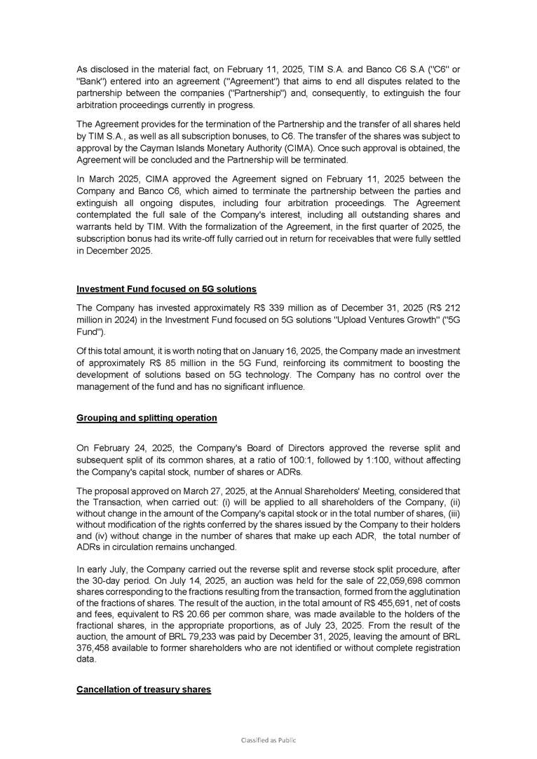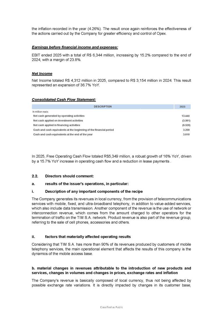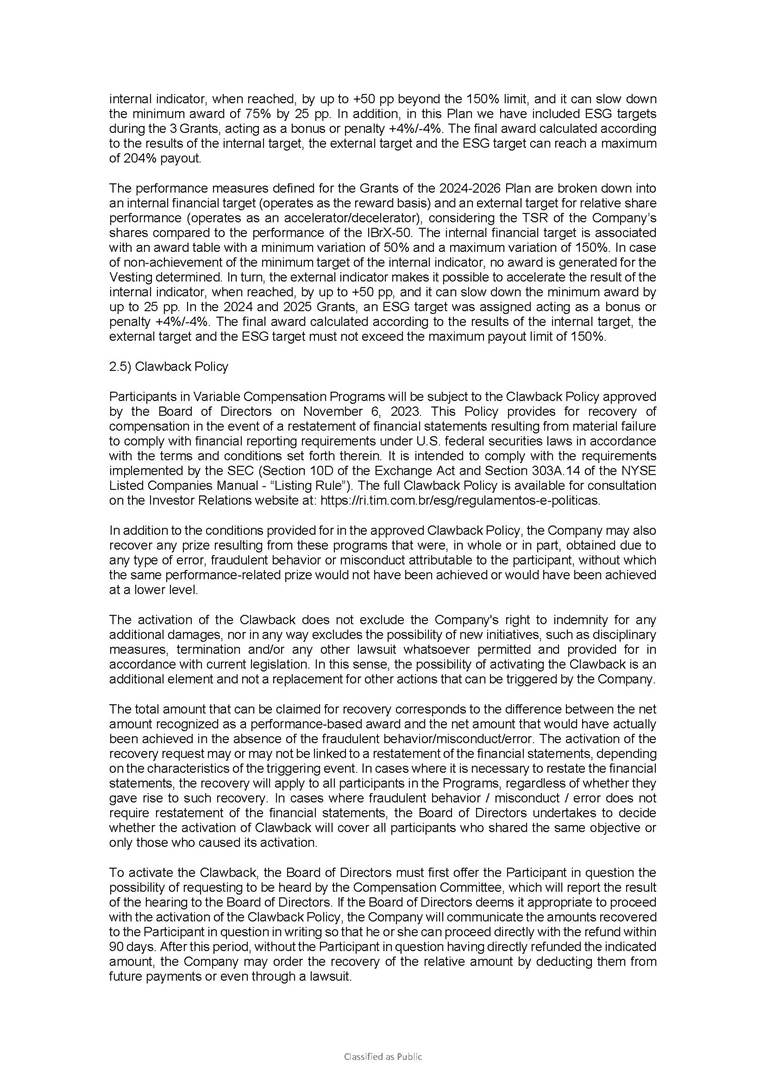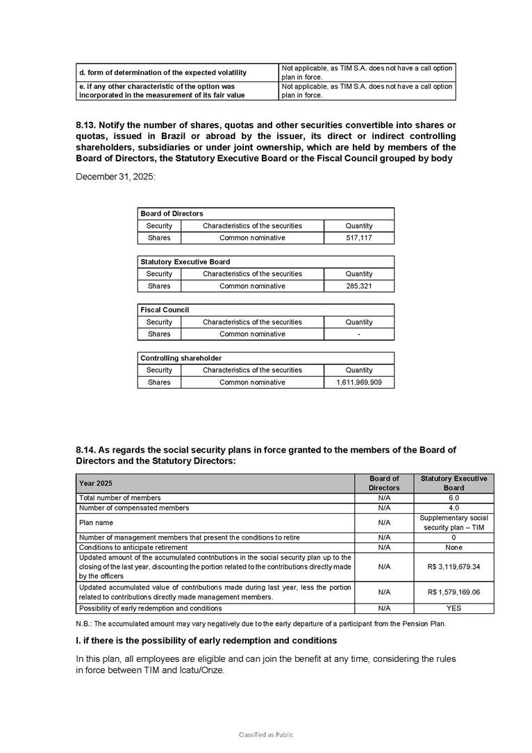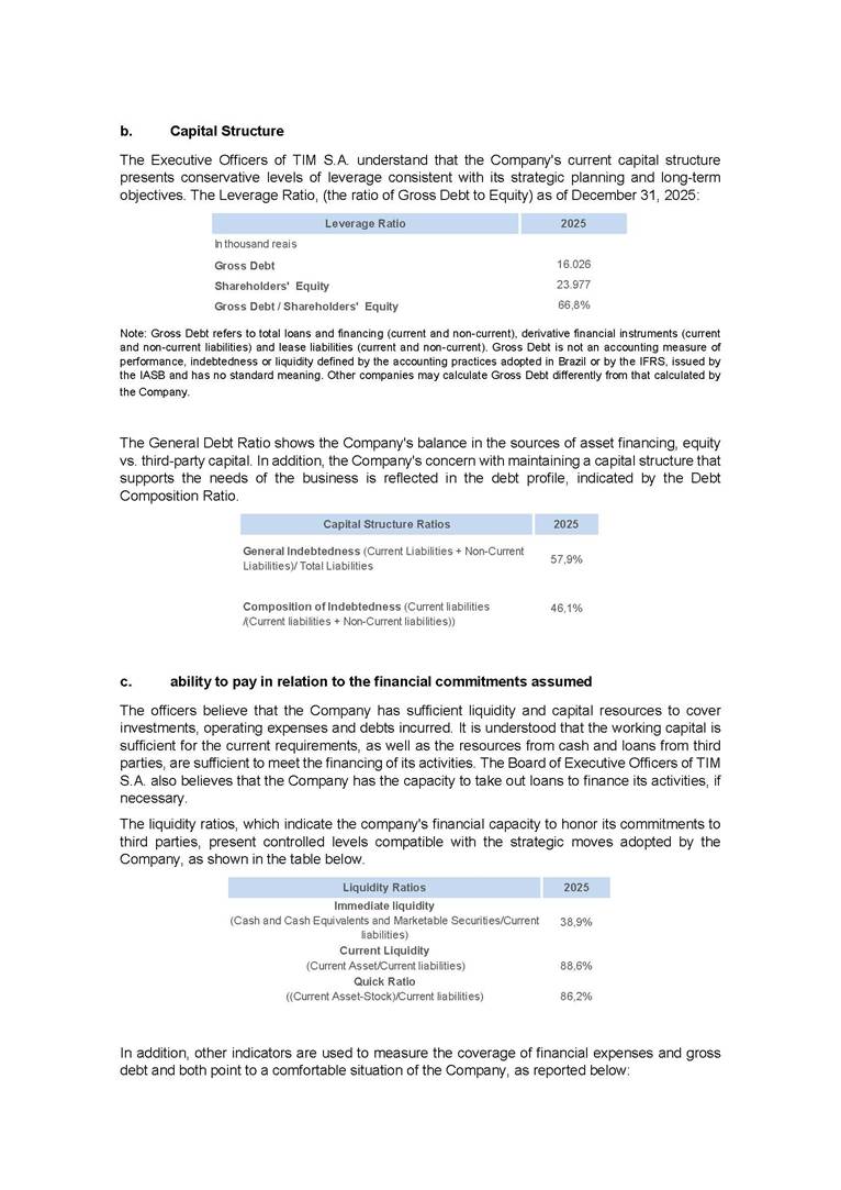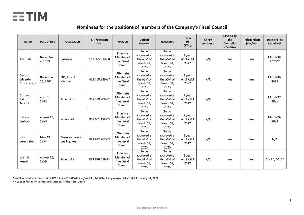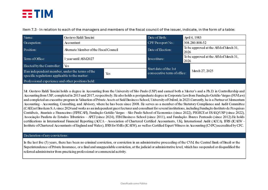 Management Proposal AGM/ EGM 2026 Annual and Extraordinary Shareholders’ Meeting March 31st, 2026 Time: 02h30 p.m. Location: Avenida João Cabral de Mello Neto, nº 850, South Tower, 13th floor, Barra da Tijuca, in the City and State of Rio de Janeiro Summary Item Subject Page 1. Call Notice 04 2. Management’s report and Consolidated Financial Statements of the Company, dated as of December 31st, 2025 09 3. Item 2 from the Reference Form 11 4. Proposal for the allocation of the results related to the fiscal year 2025 by the Company 26 5. To ratify the appointments of the Company’s Board of Directors’ Members, previously appointed at the Board of Directors’ Meetings held on November 3rd, 2025 and February 25th, 2026 6. Appointed to the positions of effective members and respective alternates of the Company's Fiscal Council 39 7. Compensation Proposal for the Company’s Administrators and Fiscal Council members for the year of 2026 49 8. Item 8 from the Reference Form 52 9. Proposal of extension of the Cooperation and Support Agreement 79 10. Fairness Evaluation of the Cooperation and Support Agreement 81 11. 19th Amendment to the Cooperation and Support Agreement 101 12. Proposal to amendment and restatement of the Company’s By-laws 109 36 01 – Call Notice 1 TIM S.A. Publicly-Held Company CNPJ/MF 02.421.421/0001-11 NIRE 333.0032463-1 CALL NOTICE ANNUAL AND EXTRAORDINARY GENERAL SHAREHOLDERS’ MEETING The Shareholders of TIM S.A. (“Company”) are called upon, as set forth in Section 124 of Law No. 6,404/1976, to attend the Company’s Annual and Extraordinary Shareholders’ Meeting to be held on March 31st, 2026, at 2:30 pm, at Avenida João Cabral de Mello Neto, nº 850, South Tower, 13th floor, Barra da Tijuca, in the City and State of Rio de Janeiro, in order to resolve on the following Agenda: On Annual Shareholders’ Meeting: (1) To resolve on the management’s report and the financial statements of the Company for the fiscal year ended on December 31st, 2025; (2) To resolve on the management’s proposal for the allocation of the results of the 2025 fiscal year and the distribution of dividends by the Company; (3) To resolve on the classification of the candidate for the position of independent member of the Board of Directors according to the independence criteria of the Novo Mercado Regulations of B3 S.A. - Brasil Bolsa, Balcão ("Novo Mercado Regulations"); (4) To ratify the appointments of the Company’s Board of Directors’ Members, previously appointed at the Board of Directors’ Meetings held on November 3rd, 2025 and February 25th, 2026; (5) To resolve on the composition of the Fiscal Council of the Company; (6) To elect the effective and alternate members of the Fiscal Council; and (7) To resolve on the compensation proposal for the Company’s management, members of Committees and members of the Fiscal Council of the Company for the 2026 fiscal year. 2 On Extraordinary Shareholders’ Meeting: (1) To resolve on the proposal for the extension of the Cooperation and Support Agreement, through the execution of its 19th amendment, to be entered into between Telecom Italia S.p.A., on the one hand, and the Company, on the other hand; and (2) To resolve on the reform and consolidation of the Company’s By-laws. General Instructions: 1. All documents and information regarding the subjects to be analyzed and resolved on at the Shareholders’ Meeting are at the Shareholders disposal at the Company’s head office, as well as on the websites www.tim.com.br/ri, www.cvm.gov.br, www.b3.com.br/pt_br/ and www.sec.gov. 2. The Ordinary and Extraordinary General Meeting will be held exclusively in person, according with the practice adopted by the Company in its meetings, with a view to ensuring full engagement, transparency and effectiveness in the resolutions. In this context, shareholders may participate in person or represented by a duly constituted proxy, according to the provisions of Section 126 of Law No. 6,404/1976 and of §§ 1 and 2 of Section 12 of the Company's By-laws, as well as by distance voting ballot, according the detailed guidelines below: a. In-person: The shareholder who chooses to participate the General Meeting in person must express your intention by sending a copy of the identity document proving your identity (ID card and CPF) by e-mail to ri@timbrasil.com.br within up to two (2) business days prior to the Shareholders' Meeting; b. By proxy: The Shareholder to be represented at the Shareholders' Meeting must send the respective supporting documentation by email to ri@timbrasil.com.br within up to two (2) business days prior to the Shareholders' Meeting: Natural person: i. A power of attorney with specific powers, signed in one's own hand, with a notarized signature, or electronically, using ICP-Brasil certification; and ii. Identity card and CPF number of the proxy. 3 Legal Entity: (i) Power of attorney with specific powers, signed by the individual, with a notarized signature, or electronically, using ICP-Brasil certification; (ii) Last bylaws or consolidated articles of association and corporate documents proving the legal representation of the legal entity shareholder or, if an investment fund, the bylaws or consolidated articles of association of its administrator or manager, as the case may be, the corporate documents proving the administrator's or manager's powers of representation and the investment fund's current regulations; and (iii) Identity card and CPF number of the proxy. Representative of Corporate Shareholder/Investment Fund: (i) Last bylaws or consolidated articles of association and corporate documents proving the legal representation of the legal entity shareholder or, if an investment fund, the bylaws or consolidated articles of association of its administrator or manager, as the case may be, the corporate documents proving the administrator's or manager's powers of representation and the current regulations of the inv