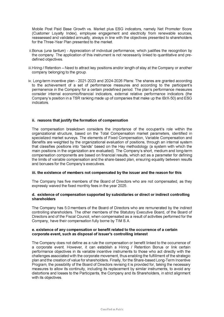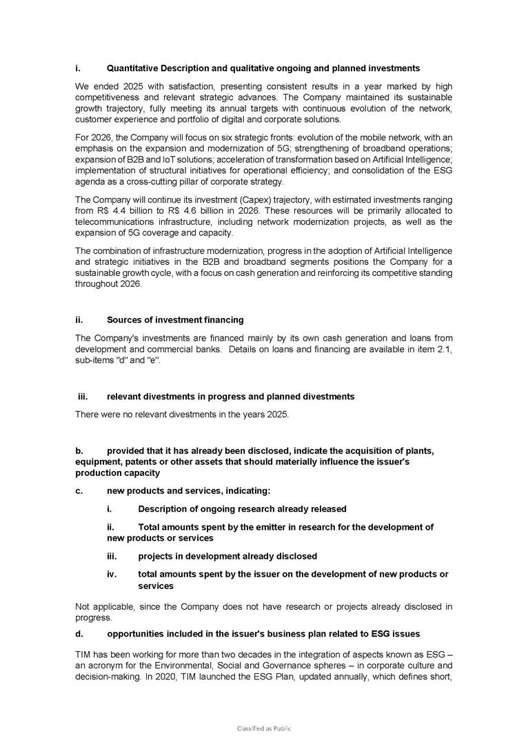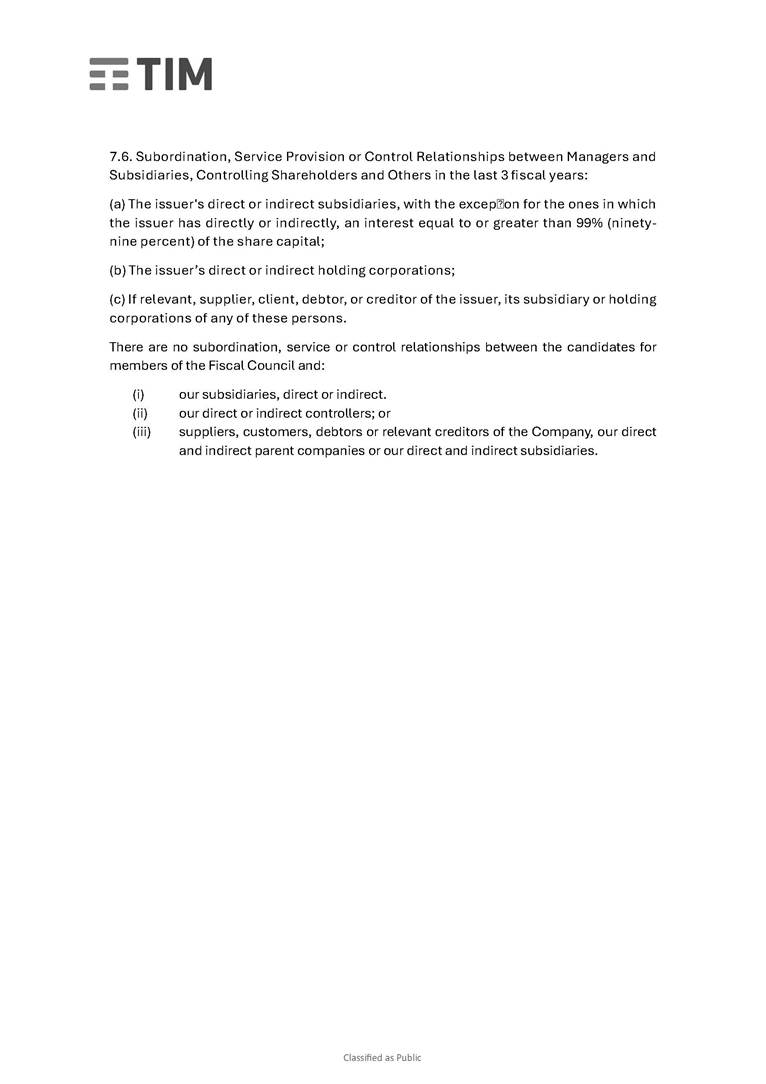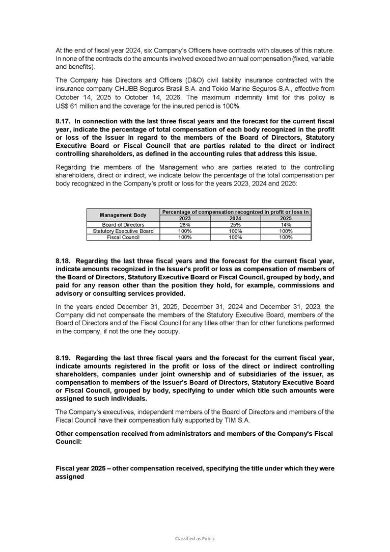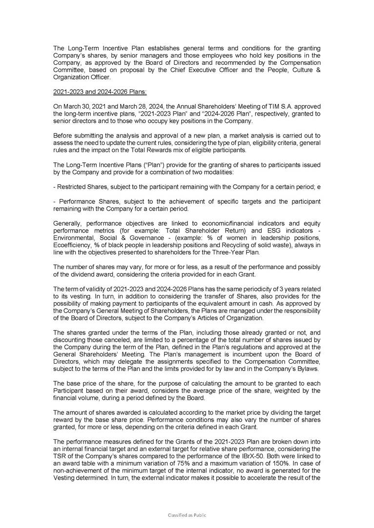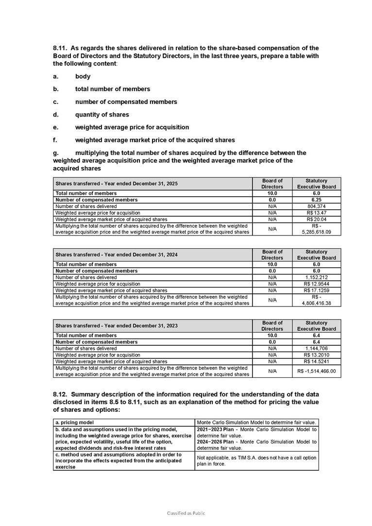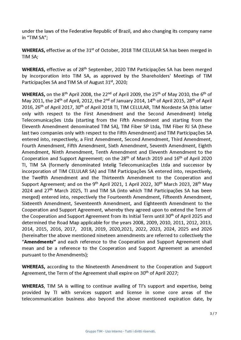 Management Proposal AGM/ EGM 2026 Annual and Extraordinary Shareholders’ Meeting March 31st, 2026 Time: 02h30 p.m. Location: Avenida João Cabral de Mello Neto, nº 850, South Tower, 13th floor, Barra da Tijuca, in the City and State of Rio de Janeiro Summary Item Subject Page 1. Call Notice 04 2. Management’s report and Consolidated Financial Statements of the Company, dated as of December 31st, 2025 09 3. Item 2 from the Reference Form 11 4. Proposal for the allocation of the results related to the fiscal year 2025 by the Company 26 5. To ratify the appointments of the Company’s Board of Directors’ Members, previously appointed at the Board of Directors’ Meetings held on November 3rd, 2025 and February 25th, 2026 6. Appointed to the positions of effective members and respective alternates of the Company's Fiscal Council 39 7. Compensation Proposal for the Company’s Administrators and Fiscal Council members for the year of 2026 49 8. Item 8 from the Reference Form 52 9. Proposal of extension of the Cooperation and Support Agreement 79 10. Fairness Evaluation of the Cooperation and Support Agreement 81 11. 19th Amendment to the Cooperation and Support Agreement 101 12. Proposal to amendment and restatement of the Company’s By-laws 109 36 01 – Call Notice 1 TIM S.A. Publicly-Held Company CNPJ/MF 02.421.421/0001-11 NIRE 333.0032463-1 CALL NOTICE ANNUAL AND EXTRAORDINARY GENERAL SHAREHOLDERS’ MEETING The Shareholders of TIM S.A. (“Company”) are called upon, as set forth in Section 124 of Law No. 6,404/1976, to attend the Company’s Annual and Extraordinary Shareholders’ Meeting to be held on March 31st, 2026, at 2:30 pm, at Avenida João Cabral de Mello Neto, nº 850, South Tower, 13th floor, Barra da Tijuca, in the City and State of Rio de Janeiro, in order to resolve on the following Agenda: On Annual Shareholders’ Meeting: (1) To resolve on the management’s report and the financial statements of the Company for the fiscal year ended on December 31st, 2025; (2) To resolve on the management’s proposal for the allocation of the results of the 2025 fiscal year and the distribution of dividends by the Company; (3) To resolve on the classification of the candidate for the position of independent member of the Board of Directors according to the independence criteria of the Novo Mercado Regulations of B3 S.A. - Brasil Bolsa, Balcão ("Novo Mercado Regulations"); (4) To ratify the appointments of the Company’s Board of Directors’ Members, previously appointed at the Board of Directors’ Meetings held on November 3rd, 2025 and February 25th, 2026; (5) To resolve on the composition of the Fiscal Council of the Company; (6) To elect the effective and alternate members of the Fiscal Council; and (7) To resolve on the compensation proposal for the Company’s management, members of Committees and members of the Fiscal Council of the Company for the 2026 fiscal year. 2 On Extraordinary Shareholders’ Meeting: (1) To resolve on the proposal for the extension of the Cooperation and Support Agreement, through the execution of its 19th amendment, to be entered into between Telecom Italia S.p.A., on the one hand, and the Company, on the other hand; and (2) To resolve on the reform and consolidation of the Company’s By-laws. General Instructions: 1. All documents and information regarding the subjects to be analyzed and resolved on at the Shareholders’ Meeting are at the Shareholders disposal at the Company’s head office, as well as on the websites www.tim.com.br/ri, www.cvm.gov.br, www.b3.com.br/pt_br/ and www.sec.gov. 2. The Ordinary and Extraordinary General Meeting will be held exclusively in person, according with the practice adopted by the Company in its meetings, with a view to ensuring full engagement, transparency and effectiveness in the resolutions. In this context, shareholders may participate in person or represented by a duly constituted proxy, according to the provisions of Section 126 of Law No. 6,404/1976 and of §§ 1 and 2 of Section 12 of the Company's By-laws, as well as by distance voting ballot, according the detailed guidelines below: a. In-person: The shareholder who chooses to participate the General Meeting in person must express your intention by sending a copy of the identity document proving your identity (ID card and CPF) by e-mail to ri@timbrasil.com.br within up to two (2) business days prior to the Shareholders' Meeting; b. By proxy: The Shareholder to be represented at the Shareholders' Meeting must send the respective supporting documentation by email to ri@timbrasil.com.br within up to two (2) business days prior to the Shareholders' Meeting: Natural person: i. A power of attorney with specific powers, signed in one's own hand, with a notarized signature, or electronically, using ICP-Brasil certification; and ii. Identity card and CPF number of the proxy. 3 Legal Entity: (i) Power of attorney with specific powers, signed by the individual, with a notarized signature, or electronically, using ICP-Brasil certification; (ii) Last bylaws or consolidated articles of association and corporate documents proving the legal representation of the legal entity shareholder or, if an investment fund, the bylaws or consolidated articles of association of its administrator or manager, as the case may be, the corporate documents proving the administrator's or manager's powers of representation and the investment fund's current regulations; and (iii) Identity card and CPF number of the proxy. Representative of Corporate Shareholder/Investment Fund: (i) Last bylaws or consolidated articles of association and corporate documents proving the legal representation of the legal entity shareholder or, if an investment fund, the bylaws or consolidated articles of association of its administrator or manager, as the case may be, the corporate documents proving the administrator's or manager's powers of representation and the current regulations of the inv