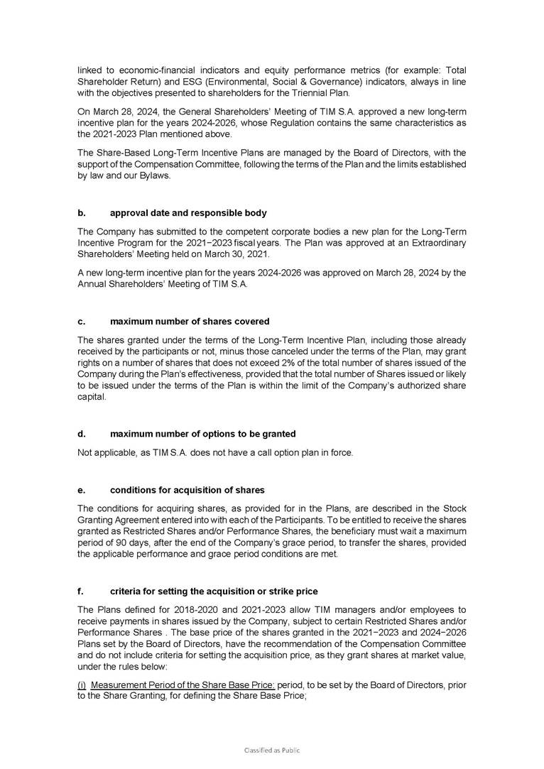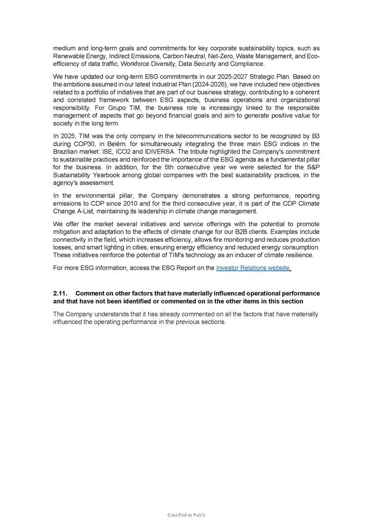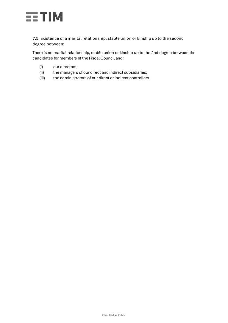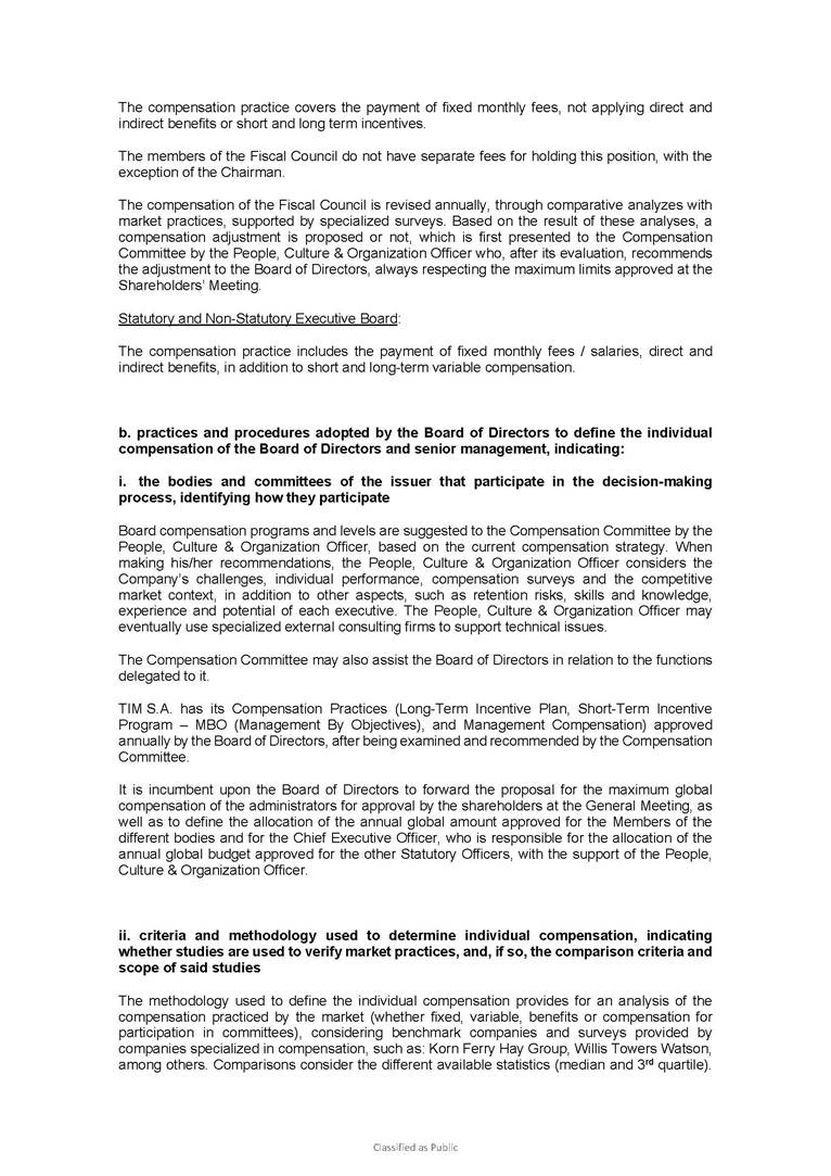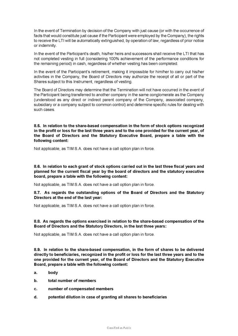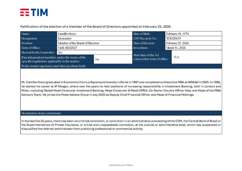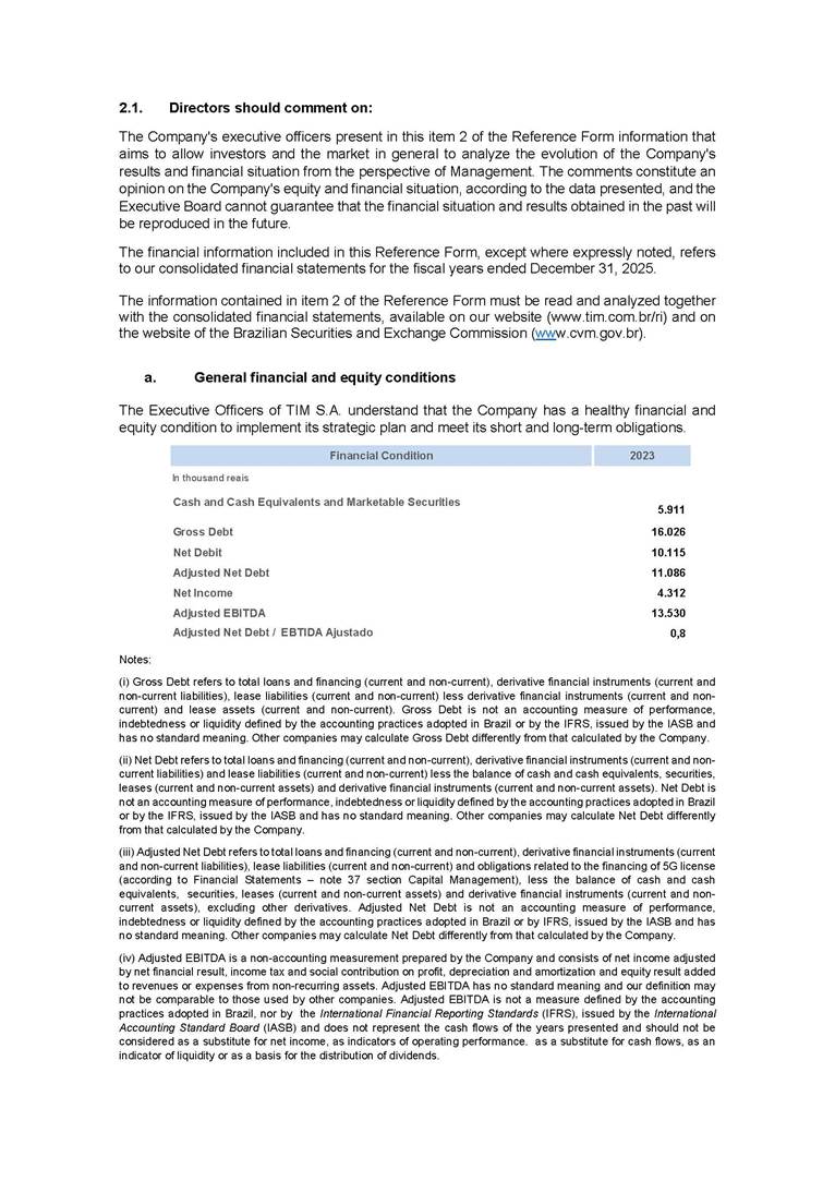 Management Proposal AGM/ EGM 2026 Annual and Extraordinary Shareholders’ Meeting March 31st, 2026 Time: 02h30 p.m. Location: Avenida João Cabral de Mello Neto, nº 850, South Tower, 13th floor, Barra da Tijuca, in the City and State of Rio de Janeiro Summary Item Subject Page 1. Call Notice 04 2. Management’s report and Consolidated Financial Statements of the Company, dated as of December 31st, 2025 09 3. Item 2 from the Reference Form 11 4. Proposal for the allocation of the results related to the fiscal year 2025 by the Company 26 5. To ratify the appointments of the Company’s Board of Directors’ Members, previously appointed at the Board of Directors’ Meetings held on November 3rd, 2025 and February 25th, 2026 6. Appointed to the positions of effective members and respective alternates of the Company's Fiscal Council 39 7. Compensation Proposal for the Company’s Administrators and Fiscal Council members for the year of 2026 49 8. Item 8 from the Reference Form 52 9. Proposal of extension of the Cooperation and Support Agreement 79 10. Fairness Evaluation of the Cooperation and Support Agreement 81 11. 19th Amendment to the Cooperation and Support Agreement 101 12. Proposal to amendment and restatement of the Company’s By-laws 109 36 01 – Call Notice 1 TIM S.A. Publicly-Held Company CNPJ/MF 02.421.421/0001-11 NIRE 333.0032463-1 CALL NOTICE ANNUAL AND EXTRAORDINARY GENERAL SHAREHOLDERS’ MEETING The Shareholders of TIM S.A. (“Company”) are called upon, as set forth in Section 124 of Law No. 6,404/1976, to attend the Company’s Annual and Extraordinary Shareholders’ Meeting to be held on March 31st, 2026, at 2:30 pm, at Avenida João Cabral de Mello Neto, nº 850, South Tower, 13th floor, Barra da Tijuca, in the City and State of Rio de Janeiro, in order to resolve on the following Agenda: On Annual Shareholders’ Meeting: (1) To resolve on the management’s report and the financial statements of the Company for the fiscal year ended on December 31st, 2025; (2) To resolve on the management’s proposal for the allocation of the results of the 2025 fiscal year and the distribution of dividends by the Company; (3) To resolve on the classification of the candidate for the position of independent member of the Board of Directors according to the independence criteria of the Novo Mercado Regulations of B3 S.A. - Brasil Bolsa, Balcão ("Novo Mercado Regulations"); (4) To ratify the appointments of the Company’s Board of Directors’ Members, previously appointed at the Board of Directors’ Meetings held on November 3rd, 2025 and February 25th, 2026; (5) To resolve on the composition of the Fiscal Council of the Company; (6) To elect the effective and alternate members of the Fiscal Council; and (7) To resolve on the compensation proposal for the Company’s management, members of Committees and members of the Fiscal Council of the Company for the 2026 fiscal year. 2 On Extraordinary Shareholders’ Meeting: (1) To resolve on the proposal for the extension of the Cooperation and Support Agreement, through the execution of its 19th amendment, to be entered into between Telecom Italia S.p.A., on the one hand, and the Company, on the other hand; and (2) To resolve on the reform and consolidation of the Company’s By-laws. General Instructions: 1. All documents and information regarding the subjects to be analyzed and resolved on at the Shareholders’ Meeting are at the Shareholders disposal at the Company’s head office, as well as on the websites www.tim.com.br/ri, www.cvm.gov.br, www.b3.com.br/pt_br/ and www.sec.gov. 2. The Ordinary and Extraordinary General Meeting will be held exclusively in person, according with the practice adopted by the Company in its meetings, with a view to ensuring full engagement, transparency and effectiveness in the resolutions. In this context, shareholders may participate in person or represented by a duly constituted proxy, according to the provisions of Section 126 of Law No. 6,404/1976 and of §§ 1 and 2 of Section 12 of the Company's By-laws, as well as by distance voting ballot, according the detailed guidelines below: a. In-person: The shareholder who chooses to participate the General Meeting in person must express your intention by sending a copy of the identity document proving your identity (ID card and CPF) by e-mail to ri@timbrasil.com.br within up to two (2) business days prior to the Shareholders' Meeting; b. By proxy: The Shareholder to be represented at the Shareholders' Meeting must send the respective supporting documentation by email to ri@timbrasil.com.br within up to two (2) business days prior to the Shareholders' Meeting: Natural person: i. A power of attorney with specific powers, signed in one's own hand, with a notarized signature, or electronically, using ICP-Brasil certification; and ii. Identity card and CPF number of the proxy. 3 Legal Entity: (i) Power of attorney with specific powers, signed by the individual, with a notarized signature, or electronically, using ICP-Brasil certification; (ii) Last bylaws or consolidated articles of association and corporate documents proving the legal representation of the legal entity shareholder or, if an investment fund, the bylaws or consolidated articles of association of its administrator or manager, as the case may be, the corporate documents proving the administrator's or manager's powers of representation and the investment fund's current regulations; and (iii) Identity card and CPF number of the proxy. Representative of Corporate Shareholder/Investment Fund: (i) Last bylaws or consolidated articles of association and corporate documents proving the legal representation of the legal entity shareholder or, if an investment fund, the bylaws or consolidated articles of association of its administrator or manager, as the case may be, the corporate documents proving the administrator's or manager's powers of representation and the current regulations of the inv