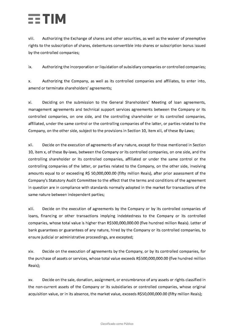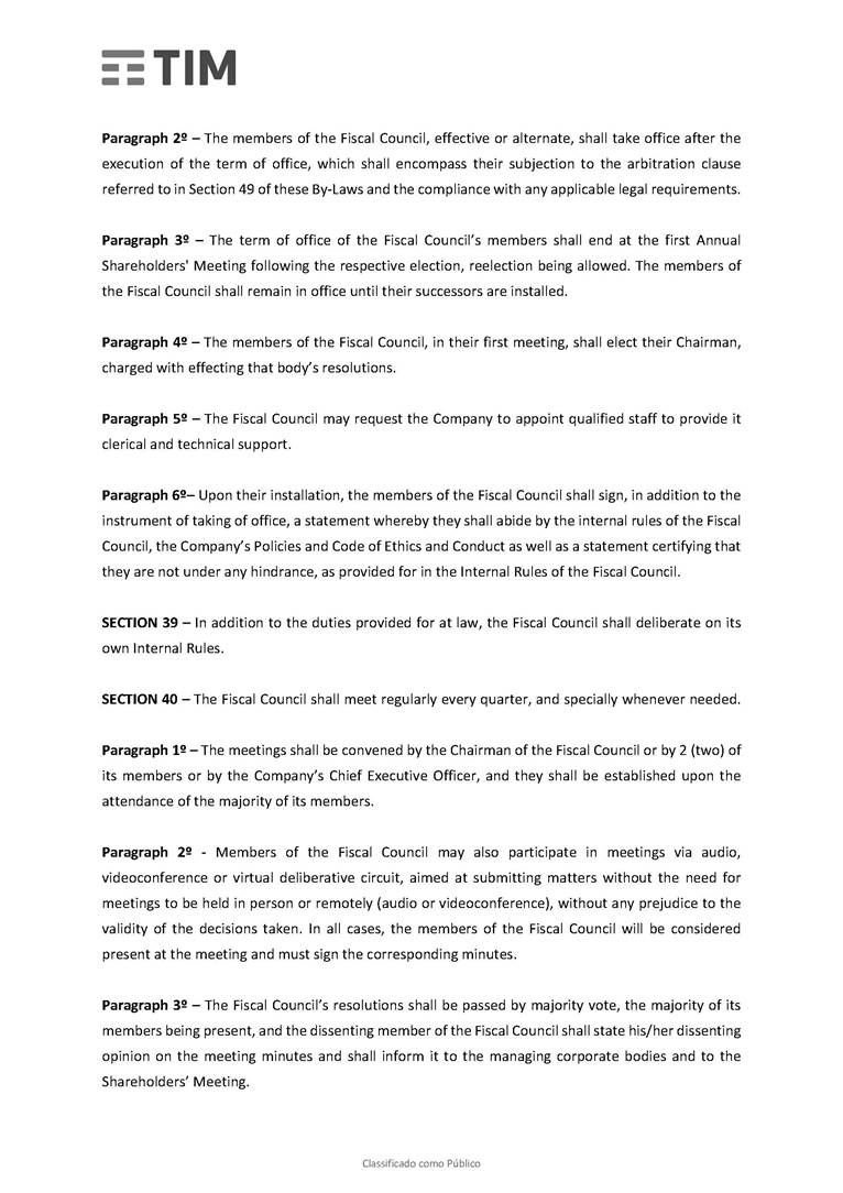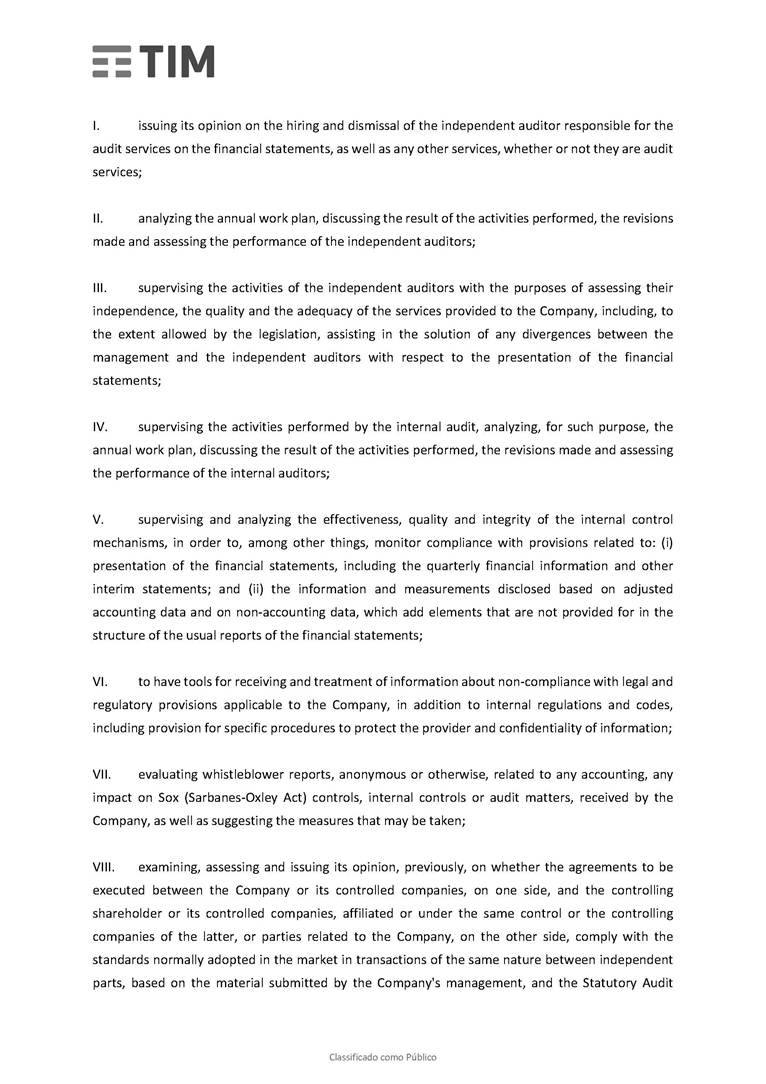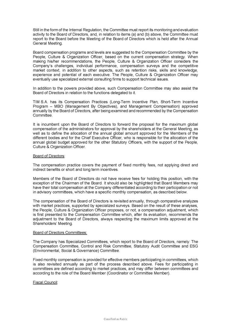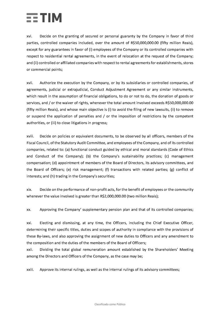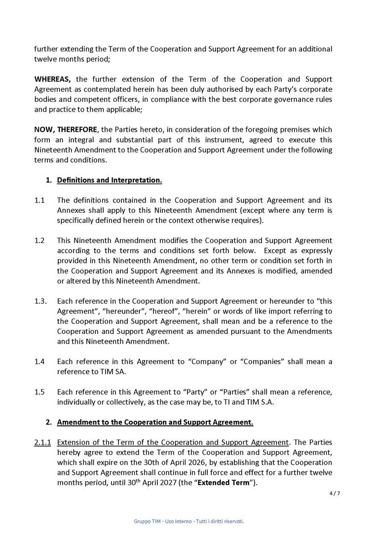 Management Proposal AGM/ EGM 2026 Annual and Extraordinary Shareholders’ Meeting March 31st, 2026 Time: 02h30 p.m. Location: Avenida João Cabral de Mello Neto, nº 850, South Tower, 13th floor, Barra da Tijuca, in the City and State of Rio de Janeiro Summary Item Subject Page 1. Call Notice 04 2. Management’s report and Consolidated Financial Statements of the Company, dated as of December 31st, 2025 09 3. Item 2 from the Reference Form 11 4. Proposal for the allocation of the results related to the fiscal year 2025 by the Company 26 5. To ratify the appointments of the Company’s Board of Directors’ Members, previously appointed at the Board of Directors’ Meetings held on November 3rd, 2025 and February 25th, 2026 6. Appointed to the positions of effective members and respective alternates of the Company's Fiscal Council 39 7. Compensation Proposal for the Company’s Administrators and Fiscal Council members for the year of 2026 49 8. Item 8 from the Reference Form 52 9. Proposal of extension of the Cooperation and Support Agreement 79 10. Fairness Evaluation of the Cooperation and Support Agreement 81 11. 19th Amendment to the Cooperation and Support Agreement 101 12. Proposal to amendment and restatement of the Company’s By-laws 109 36 01 – Call Notice 1 TIM S.A. Publicly-Held Company CNPJ/MF 02.421.421/0001-11 NIRE 333.0032463-1 CALL NOTICE ANNUAL AND EXTRAORDINARY GENERAL SHAREHOLDERS’ MEETING The Shareholders of TIM S.A. (“Company”) are called upon, as set forth in Section 124 of Law No. 6,404/1976, to attend the Company’s Annual and Extraordinary Shareholders’ Meeting to be held on March 31st, 2026, at 2:30 pm, at Avenida João Cabral de Mello Neto, nº 850, South Tower, 13th floor, Barra da Tijuca, in the City and State of Rio de Janeiro, in order to resolve on the following Agenda: On Annual Shareholders’ Meeting: (1) To resolve on the management’s report and the financial statements of the Company for the fiscal year ended on December 31st, 2025; (2) To resolve on the management’s proposal for the allocation of the results of the 2025 fiscal year and the distribution of dividends by the Company; (3) To resolve on the classification of the candidate for the position of independent member of the Board of Directors according to the independence criteria of the Novo Mercado Regulations of B3 S.A. - Brasil Bolsa, Balcão ("Novo Mercado Regulations"); (4) To ratify the appointments of the Company’s Board of Directors’ Members, previously appointed at the Board of Directors’ Meetings held on November 3rd, 2025 and February 25th, 2026; (5) To resolve on the composition of the Fiscal Council of the Company; (6) To elect the effective and alternate members of the Fiscal Council; and (7) To resolve on the compensation proposal for the Company’s management, members of Committees and members of the Fiscal Council of the Company for the 2026 fiscal year. 2 On Extraordinary Shareholders’ Meeting: (1) To resolve on the proposal for the extension of the Cooperation and Support Agreement, through the execution of its 19th amendment, to be entered into between Telecom Italia S.p.A., on the one hand, and the Company, on the other hand; and (2) To resolve on the reform and consolidation of the Company’s By-laws. General Instructions: 1. All documents and information regarding the subjects to be analyzed and resolved on at the Shareholders’ Meeting are at the Shareholders disposal at the Company’s head office, as well as on the websites www.tim.com.br/ri, www.cvm.gov.br, www.b3.com.br/pt_br/ and www.sec.gov. 2. The Ordinary and Extraordinary General Meeting will be held exclusively in person, according with the practice adopted by the Company in its meetings, with a view to ensuring full engagement, transparency and effectiveness in the resolutions. In this context, shareholders may participate in person or represented by a duly constituted proxy, according to the provisions of Section 126 of Law No. 6,404/1976 and of §§ 1 and 2 of Section 12 of the Company's By-laws, as well as by distance voting ballot, according the detailed guidelines below: a. In-person: The shareholder who chooses to participate the General Meeting in person must express your intention by sending a copy of the identity document proving your identity (ID card and CPF) by e-mail to ri@timbrasil.com.br within up to two (2) business days prior to the Shareholders' Meeting; b. By proxy: The Shareholder to be represented at the Shareholders' Meeting must send the respective supporting documentation by email to ri@timbrasil.com.br within up to two (2) business days prior to the Shareholders' Meeting: Natural person: i. A power of attorney with specific powers, signed in one's own hand, with a notarized signature, or electronically, using ICP-Brasil certification; and ii. Identity card and CPF number of the proxy. 3 Legal Entity: (i) Power of attorney with specific powers, signed by the individual, with a notarized signature, or electronically, using ICP-Brasil certification; (ii) Last bylaws or consolidated articles of association and corporate documents proving the legal representation of the legal entity shareholder or, if an investment fund, the bylaws or consolidated articles of association of its administrator or manager, as the case may be, the corporate documents proving the administrator's or manager's powers of representation and the investment fund's current regulations; and (iii) Identity card and CPF number of the proxy. Representative of Corporate Shareholder/Investment Fund: (i) Last bylaws or consolidated articles of association and corporate documents proving the legal representation of the legal entity shareholder or, if an investment fund, the bylaws or consolidated articles of association of its administrator or manager, as the case may be, the corporate documents proving the administrator's or manager's powers of representation and the current regulations of the inv