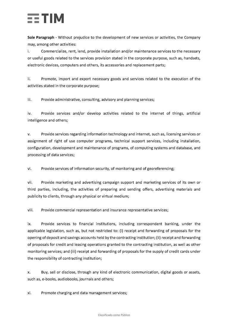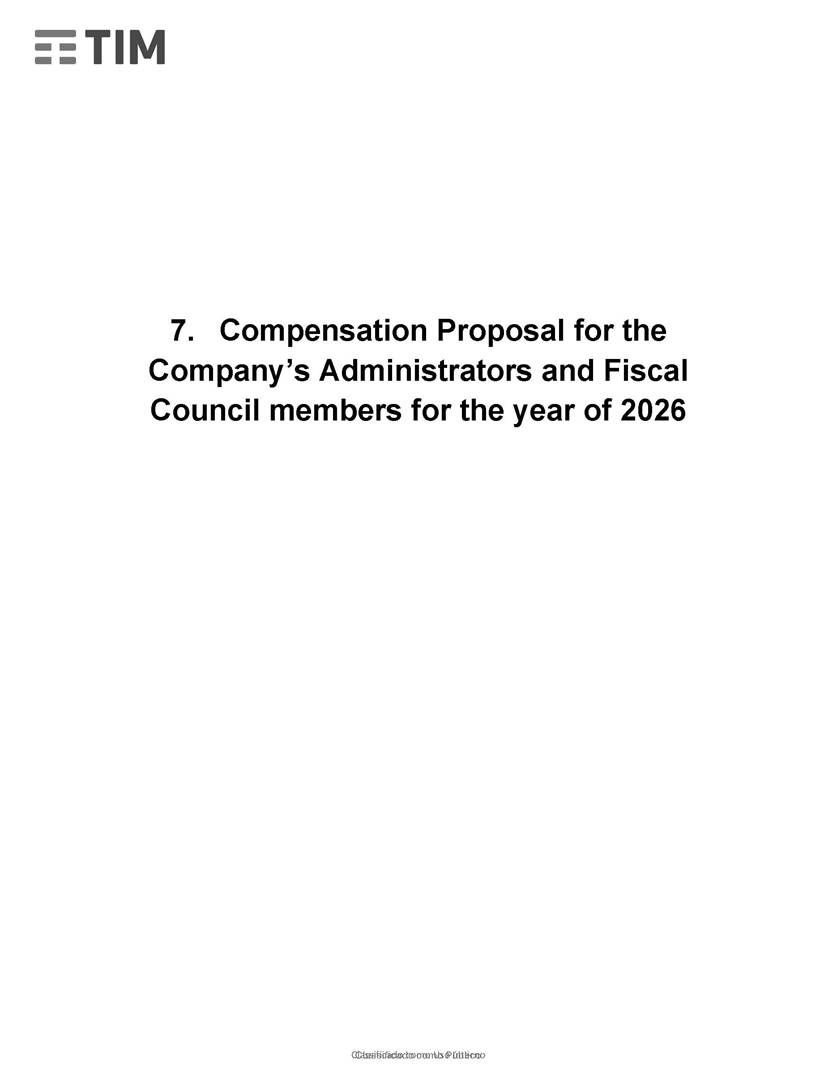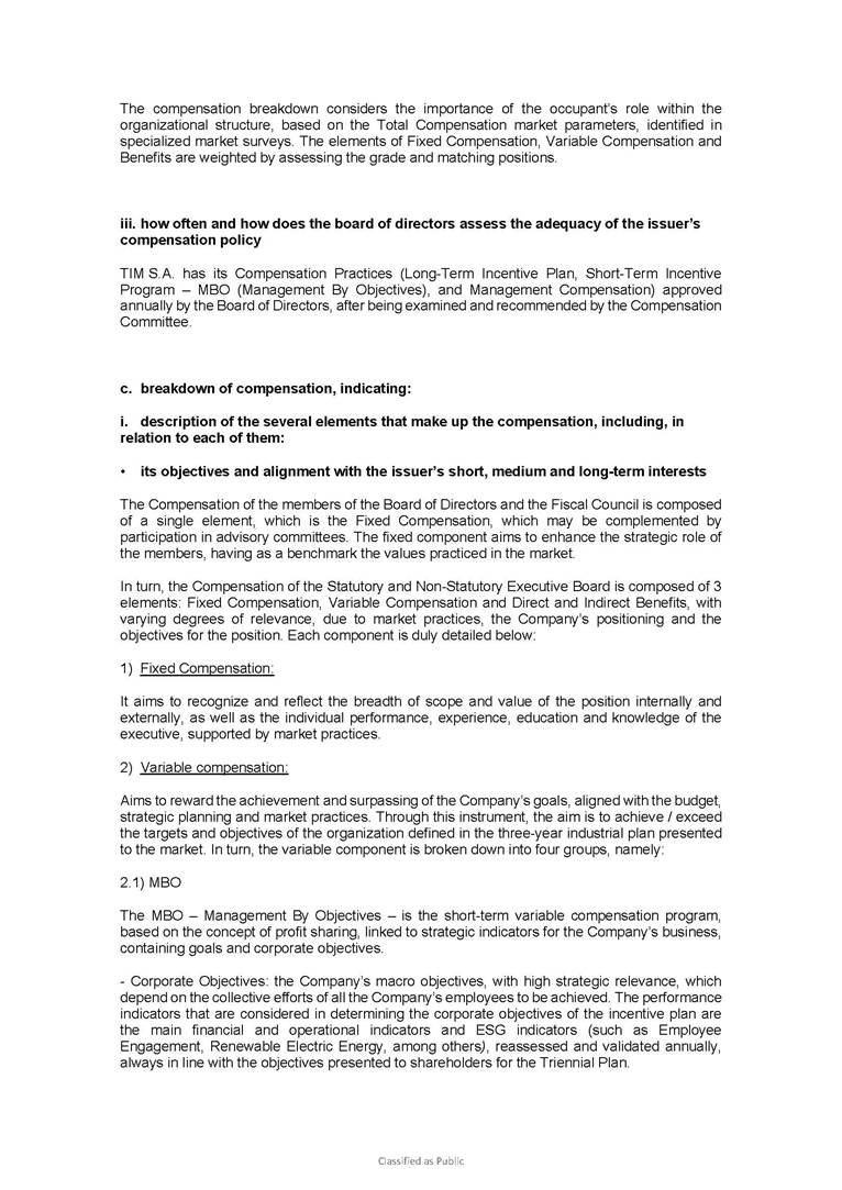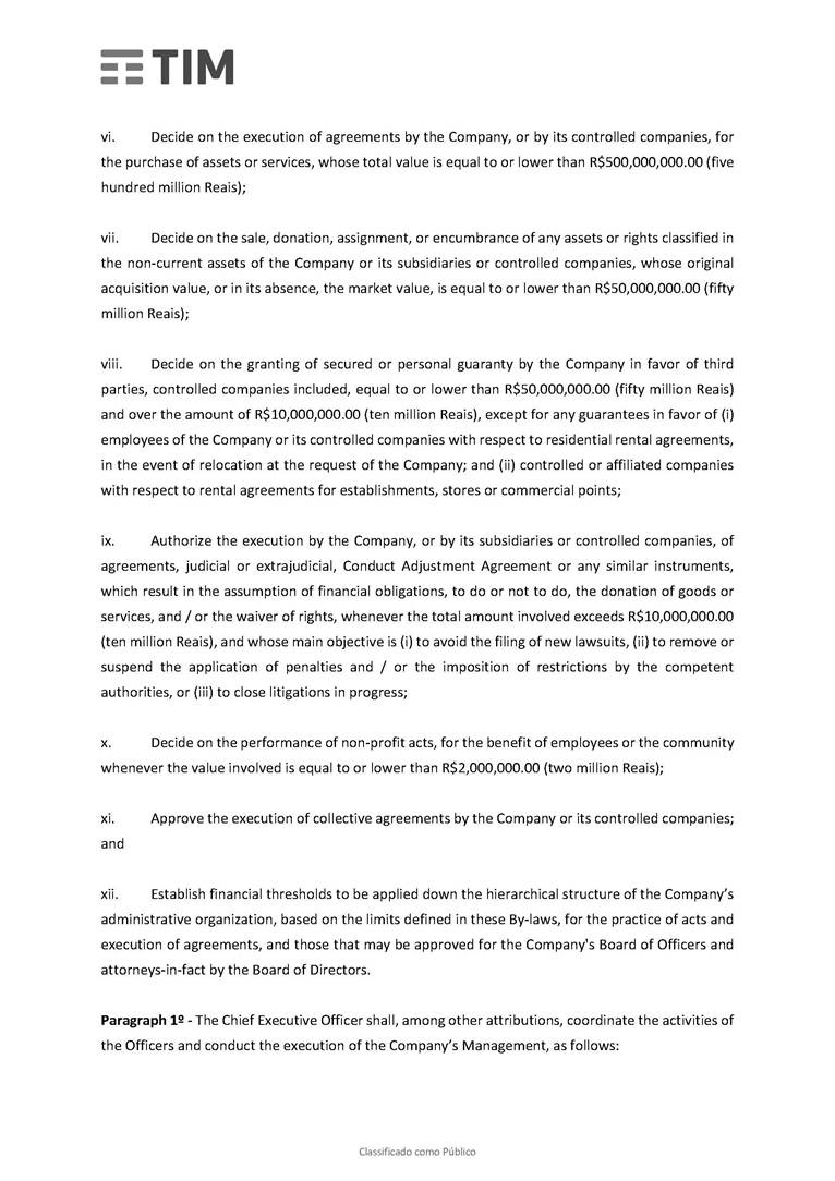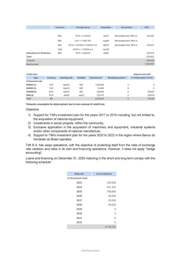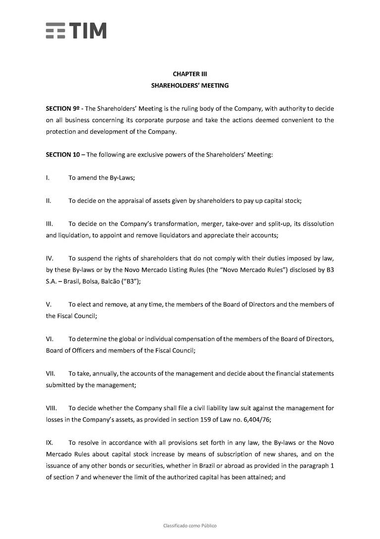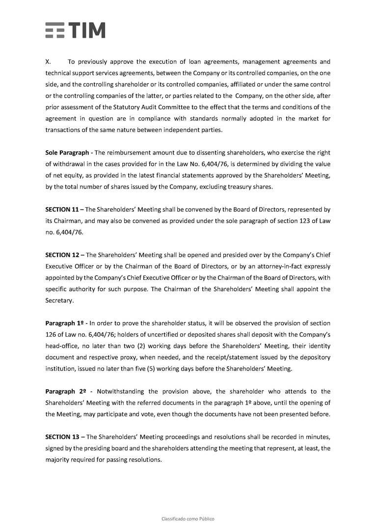 Management Proposal AGM/ EGM 2026 Annual and Extraordinary Shareholders’ Meeting March 31st, 2026 Time: 02h30 p.m. Location: Avenida João Cabral de Mello Neto, nº 850, South Tower, 13th floor, Barra da Tijuca, in the City and State of Rio de Janeiro Summary Item Subject Page 1. Call Notice 04 2. Management’s report and Consolidated Financial Statements of the Company, dated as of December 31st, 2025 09 3. Item 2 from the Reference Form 11 4. Proposal for the allocation of the results related to the fiscal year 2025 by the Company 26 5. To ratify the appointments of the Company’s Board of Directors’ Members, previously appointed at the Board of Directors’ Meetings held on November 3rd, 2025 and February 25th, 2026 6. Appointed to the positions of effective members and respective alternates of the Company's Fiscal Council 39 7. Compensation Proposal for the Company’s Administrators and Fiscal Council members for the year of 2026 49 8. Item 8 from the Reference Form 52 9. Proposal of extension of the Cooperation and Support Agreement 79 10. Fairness Evaluation of the Cooperation and Support Agreement 81 11. 19th Amendment to the Cooperation and Support Agreement 101 12. Proposal to amendment and restatement of the Company’s By-laws 109 36 01 – Call Notice 1 TIM S.A. Publicly-Held Company CNPJ/MF 02.421.421/0001-11 NIRE 333.0032463-1 CALL NOTICE ANNUAL AND EXTRAORDINARY GENERAL SHAREHOLDERS’ MEETING The Shareholders of TIM S.A. (“Company”) are called upon, as set forth in Section 124 of Law No. 6,404/1976, to attend the Company’s Annual and Extraordinary Shareholders’ Meeting to be held on March 31st, 2026, at 2:30 pm, at Avenida João Cabral de Mello Neto, nº 850, South Tower, 13th floor, Barra da Tijuca, in the City and State of Rio de Janeiro, in order to resolve on the following Agenda: On Annual Shareholders’ Meeting: (1) To resolve on the management’s report and the financial statements of the Company for the fiscal year ended on December 31st, 2025; (2) To resolve on the management’s proposal for the allocation of the results of the 2025 fiscal year and the distribution of dividends by the Company; (3) To resolve on the classification of the candidate for the position of independent member of the Board of Directors according to the independence criteria of the Novo Mercado Regulations of B3 S.A. - Brasil Bolsa, Balcão ("Novo Mercado Regulations"); (4) To ratify the appointments of the Company’s Board of Directors’ Members, previously appointed at the Board of Directors’ Meetings held on November 3rd, 2025 and February 25th, 2026; (5) To resolve on the composition of the Fiscal Council of the Company; (6) To elect the effective and alternate members of the Fiscal Council; and (7) To resolve on the compensation proposal for the Company’s management, members of Committees and members of the Fiscal Council of the Company for the 2026 fiscal year. 2 On Extraordinary Shareholders’ Meeting: (1) To resolve on the proposal for the extension of the Cooperation and Support Agreement, through the execution of its 19th amendment, to be entered into between Telecom Italia S.p.A., on the one hand, and the Company, on the other hand; and (2) To resolve on the reform and consolidation of the Company’s By-laws. General Instructions: 1. All documents and information regarding the subjects to be analyzed and resolved on at the Shareholders’ Meeting are at the Shareholders disposal at the Company’s head office, as well as on the websites www.tim.com.br/ri, www.cvm.gov.br, www.b3.com.br/pt_br/ and www.sec.gov. 2. The Ordinary and Extraordinary General Meeting will be held exclusively in person, according with the practice adopted by the Company in its meetings, with a view to ensuring full engagement, transparency and effectiveness in the resolutions. In this context, shareholders may participate in person or represented by a duly constituted proxy, according to the provisions of Section 126 of Law No. 6,404/1976 and of §§ 1 and 2 of Section 12 of the Company's By-laws, as well as by distance voting ballot, according the detailed guidelines below: a. In-person: The shareholder who chooses to participate the General Meeting in person must express your intention by sending a copy of the identity document proving your identity (ID card and CPF) by e-mail to ri@timbrasil.com.br within up to two (2) business days prior to the Shareholders' Meeting; b. By proxy: The Shareholder to be represented at the Shareholders' Meeting must send the respective supporting documentation by email to ri@timbrasil.com.br within up to two (2) business days prior to the Shareholders' Meeting: Natural person: i. A power of attorney with specific powers, signed in one's own hand, with a notarized signature, or electronically, using ICP-Brasil certification; and ii. Identity card and CPF number of the proxy. 3 Legal Entity: (i) Power of attorney with specific powers, signed by the individual, with a notarized signature, or electronically, using ICP-Brasil certification; (ii) Last bylaws or consolidated articles of association and corporate documents proving the legal representation of the legal entity shareholder or, if an investment fund, the bylaws or consolidated articles of association of its administrator or manager, as the case may be, the corporate documents proving the administrator's or manager's powers of representation and the investment fund's current regulations; and (iii) Identity card and CPF number of the proxy. Representative of Corporate Shareholder/Investment Fund: (i) Last bylaws or consolidated articles of association and corporate documents proving the legal representation of the legal entity shareholder or, if an investment fund, the bylaws or consolidated articles of association of its administrator or manager, as the case may be, the corporate documents proving the administrator's or manager's powers of representation and the current regulations of the inv
