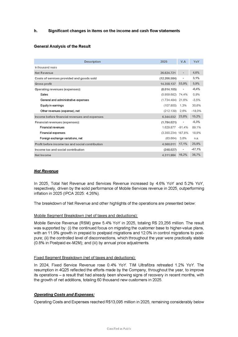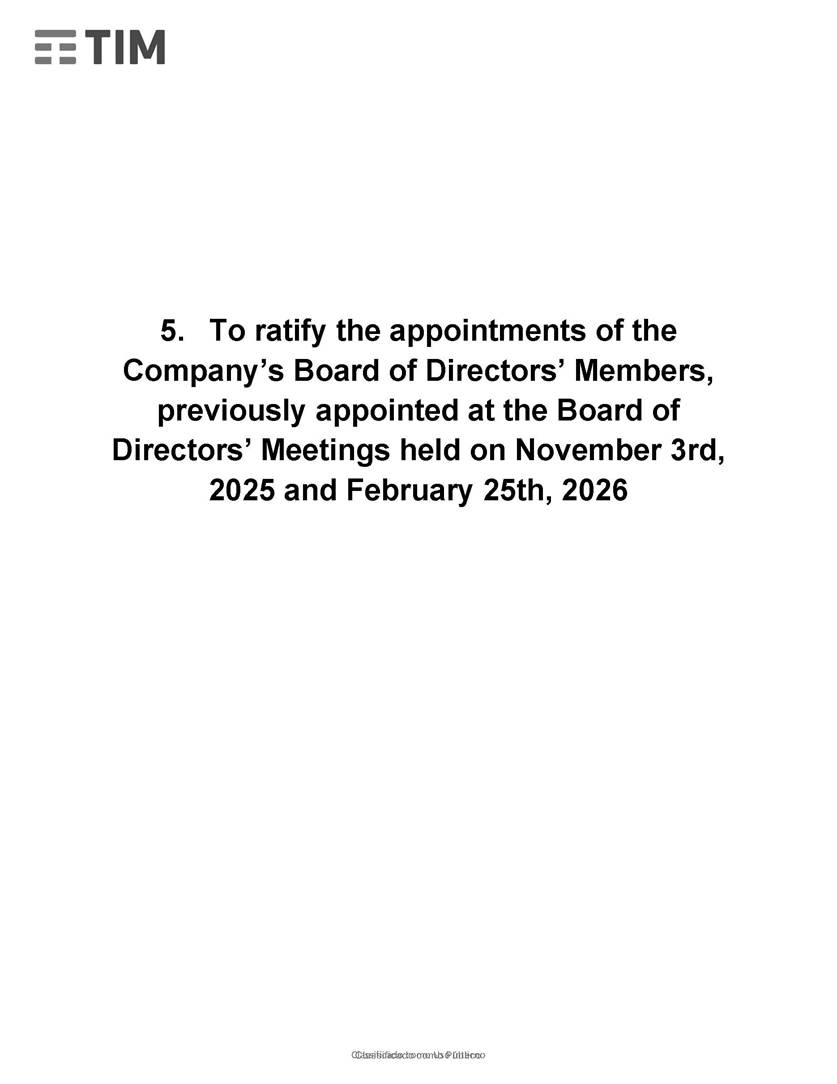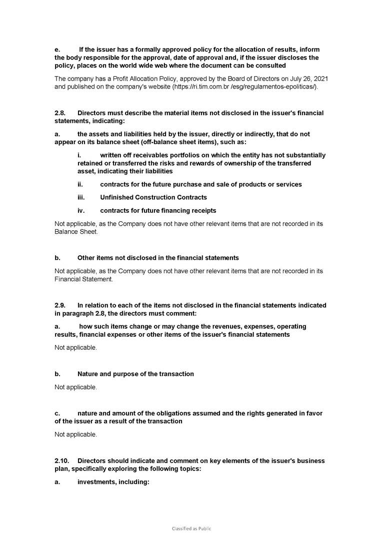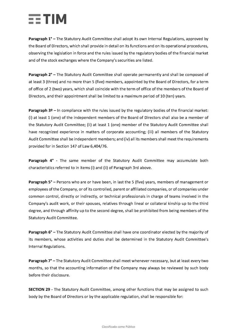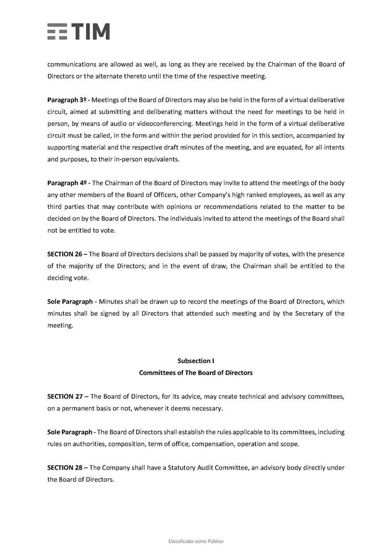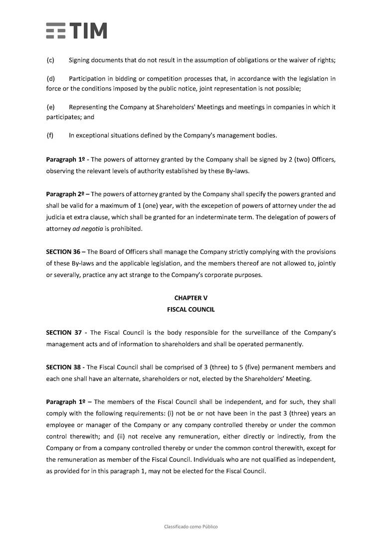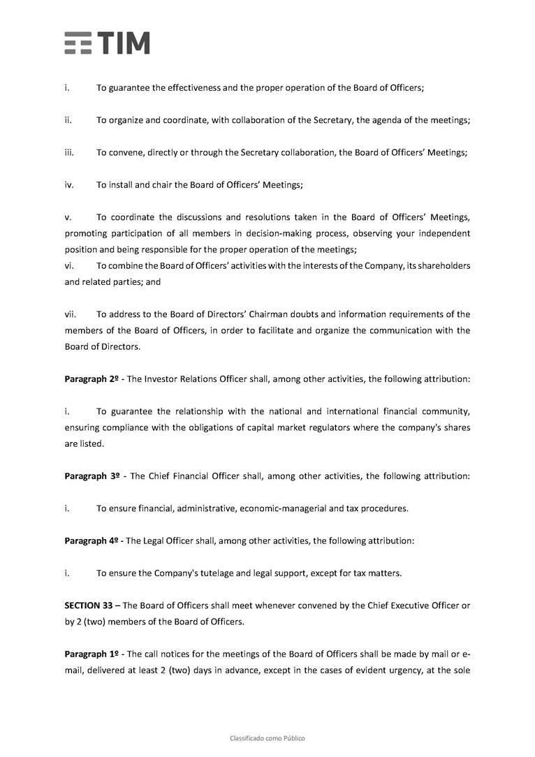 Management Proposal AGM/ EGM 2026 Annual and Extraordinary Shareholders’ Meeting March 31st, 2026 Time: 02h30 p.m. Location: Avenida João Cabral de Mello Neto, nº 850, South Tower, 13th floor, Barra da Tijuca, in the City and State of Rio de Janeiro Summary Item Subject Page 1. Call Notice 04 2. Management’s report and Consolidated Financial Statements of the Company, dated as of December 31st, 2025 09 3. Item 2 from the Reference Form 11 4. Proposal for the allocation of the results related to the fiscal year 2025 by the Company 26 5. To ratify the appointments of the Company’s Board of Directors’ Members, previously appointed at the Board of Directors’ Meetings held on November 3rd, 2025 and February 25th, 2026 6. Appointed to the positions of effective members and respective alternates of the Company's Fiscal Council 39 7. Compensation Proposal for the Company’s Administrators and Fiscal Council members for the year of 2026 49 8. Item 8 from the Reference Form 52 9. Proposal of extension of the Cooperation and Support Agreement 79 10. Fairness Evaluation of the Cooperation and Support Agreement 81 11. 19th Amendment to the Cooperation and Support Agreement 101 12. Proposal to amendment and restatement of the Company’s By-laws 109 36 01 – Call Notice 1 TIM S.A. Publicly-Held Company CNPJ/MF 02.421.421/0001-11 NIRE 333.0032463-1 CALL NOTICE ANNUAL AND EXTRAORDINARY GENERAL SHAREHOLDERS’ MEETING The Shareholders of TIM S.A. (“Company”) are called upon, as set forth in Section 124 of Law No. 6,404/1976, to attend the Company’s Annual and Extraordinary Shareholders’ Meeting to be held on March 31st, 2026, at 2:30 pm, at Avenida João Cabral de Mello Neto, nº 850, South Tower, 13th floor, Barra da Tijuca, in the City and State of Rio de Janeiro, in order to resolve on the following Agenda: On Annual Shareholders’ Meeting: (1) To resolve on the management’s report and the financial statements of the Company for the fiscal year ended on December 31st, 2025; (2) To resolve on the management’s proposal for the allocation of the results of the 2025 fiscal year and the distribution of dividends by the Company; (3) To resolve on the classification of the candidate for the position of independent member of the Board of Directors according to the independence criteria of the Novo Mercado Regulations of B3 S.A. - Brasil Bolsa, Balcão ("Novo Mercado Regulations"); (4) To ratify the appointments of the Company’s Board of Directors’ Members, previously appointed at the Board of Directors’ Meetings held on November 3rd, 2025 and February 25th, 2026; (5) To resolve on the composition of the Fiscal Council of the Company; (6) To elect the effective and alternate members of the Fiscal Council; and (7) To resolve on the compensation proposal for the Company’s management, members of Committees and members of the Fiscal Council of the Company for the 2026 fiscal year. 2 On Extraordinary Shareholders’ Meeting: (1) To resolve on the proposal for the extension of the Cooperation and Support Agreement, through the execution of its 19th amendment, to be entered into between Telecom Italia S.p.A., on the one hand, and the Company, on the other hand; and (2) To resolve on the reform and consolidation of the Company’s By-laws. General Instructions: 1. All documents and information regarding the subjects to be analyzed and resolved on at the Shareholders’ Meeting are at the Shareholders disposal at the Company’s head office, as well as on the websites www.tim.com.br/ri, www.cvm.gov.br, www.b3.com.br/pt_br/ and www.sec.gov. 2. The Ordinary and Extraordinary General Meeting will be held exclusively in person, according with the practice adopted by the Company in its meetings, with a view to ensuring full engagement, transparency and effectiveness in the resolutions. In this context, shareholders may participate in person or represented by a duly constituted proxy, according to the provisions of Section 126 of Law No. 6,404/1976 and of §§ 1 and 2 of Section 12 of the Company's By-laws, as well as by distance voting ballot, according the detailed guidelines below: a. In-person: The shareholder who chooses to participate the General Meeting in person must express your intention by sending a copy of the identity document proving your identity (ID card and CPF) by e-mail to ri@timbrasil.com.br within up to two (2) business days prior to the Shareholders' Meeting; b. By proxy: The Shareholder to be represented at the Shareholders' Meeting must send the respective supporting documentation by email to ri@timbrasil.com.br within up to two (2) business days prior to the Shareholders' Meeting: Natural person: i. A power of attorney with specific powers, signed in one's own hand, with a notarized signature, or electronically, using ICP-Brasil certification; and ii. Identity card and CPF number of the proxy. 3 Legal Entity: (i) Power of attorney with specific powers, signed by the individual, with a notarized signature, or electronically, using ICP-Brasil certification; (ii) Last bylaws or consolidated articles of association and corporate documents proving the legal representation of the legal entity shareholder or, if an investment fund, the bylaws or consolidated articles of association of its administrator or manager, as the case may be, the corporate documents proving the administrator's or manager's powers of representation and the investment fund's current regulations; and (iii) Identity card and CPF number of the proxy. Representative of Corporate Shareholder/Investment Fund: (i) Last bylaws or consolidated articles of association and corporate documents proving the legal representation of the legal entity shareholder or, if an investment fund, the bylaws or consolidated articles of association of its administrator or manager, as the case may be, the corporate documents proving the administrator's or manager's powers of representation and the current regulations of the inv