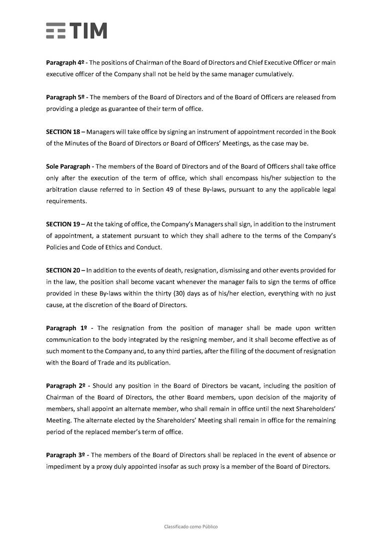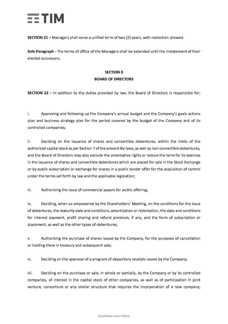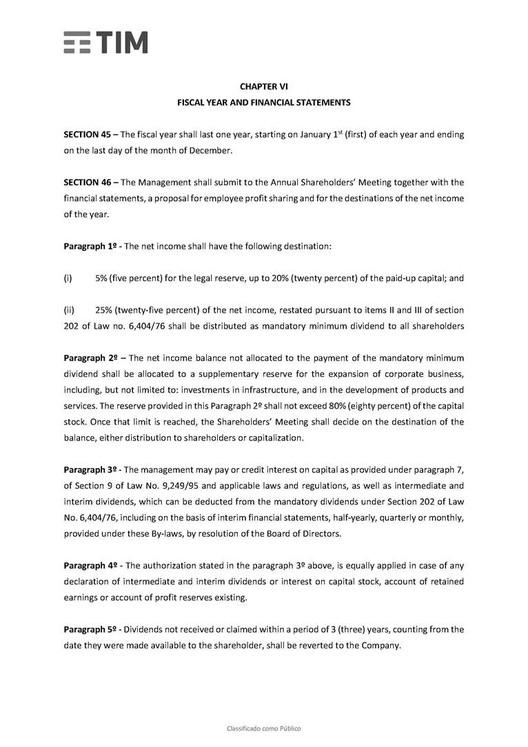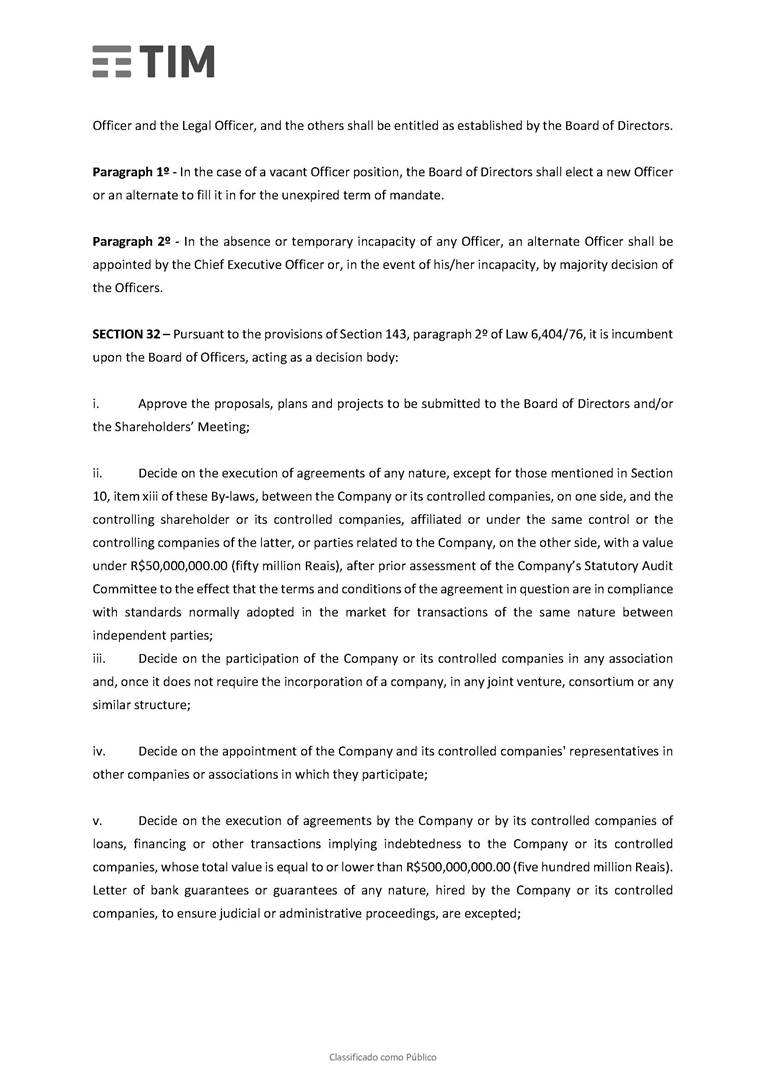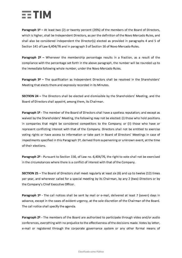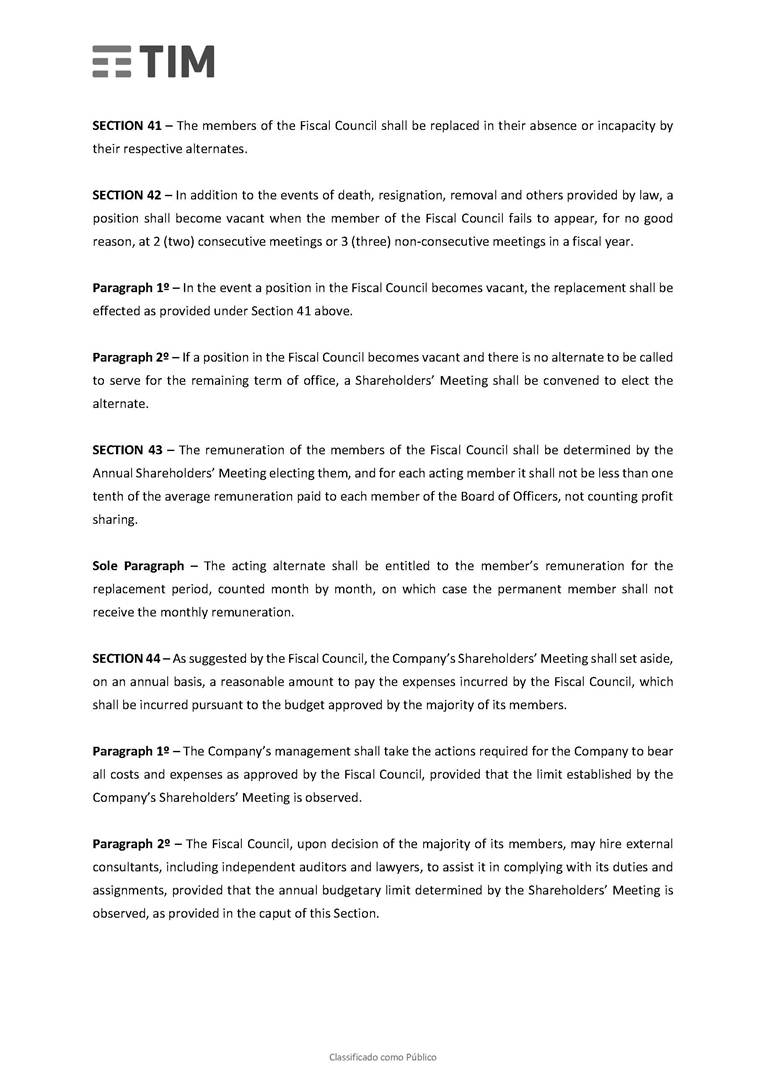 Management Proposal AGM/ EGM 2026 Annual and Extraordinary Shareholders’ Meeting March 31st, 2026 Time: 02h30 p.m. Location: Avenida João Cabral de Mello Neto, nº 850, South Tower, 13th floor, Barra da Tijuca, in the City and State of Rio de Janeiro Summary Item Subject Page 1. Call Notice 04 2. Management’s report and Consolidated Financial Statements of the Company, dated as of December 31st, 2025 09 3. Item 2 from the Reference Form 11 4. Proposal for the allocation of the results related to the fiscal year 2025 by the Company 26 5. To ratify the appointments of the Company’s Board of Directors’ Members, previously appointed at the Board of Directors’ Meetings held on November 3rd, 2025 and February 25th, 2026 6. Appointed to the positions of effective members and respective alternates of the Company's Fiscal Council 39 7. Compensation Proposal for the Company’s Administrators and Fiscal Council members for the year of 2026 49 8. Item 8 from the Reference Form 52 9. Proposal of extension of the Cooperation and Support Agreement 79 10. Fairness Evaluation of the Cooperation and Support Agreement 81 11. 19th Amendment to the Cooperation and Support Agreement 101 12. Proposal to amendment and restatement of the Company’s By-laws 109 36 01 – Call Notice 1 TIM S.A. Publicly-Held Company CNPJ/MF 02.421.421/0001-11 NIRE 333.0032463-1 CALL NOTICE ANNUAL AND EXTRAORDINARY GENERAL SHAREHOLDERS’ MEETING The Shareholders of TIM S.A. (“Company”) are called upon, as set forth in Section 124 of Law No. 6,404/1976, to attend the Company’s Annual and Extraordinary Shareholders’ Meeting to be held on March 31st, 2026, at 2:30 pm, at Avenida João Cabral de Mello Neto, nº 850, South Tower, 13th floor, Barra da Tijuca, in the City and State of Rio de Janeiro, in order to resolve on the following Agenda: On Annual Shareholders’ Meeting: (1) To resolve on the management’s report and the financial statements of the Company for the fiscal year ended on December 31st, 2025; (2) To resolve on the management’s proposal for the allocation of the results of the 2025 fiscal year and the distribution of dividends by the Company; (3) To resolve on the classification of the candidate for the position of independent member of the Board of Directors according to the independence criteria of the Novo Mercado Regulations of B3 S.A. - Brasil Bolsa, Balcão ("Novo Mercado Regulations"); (4) To ratify the appointments of the Company’s Board of Directors’ Members, previously appointed at the Board of Directors’ Meetings held on November 3rd, 2025 and February 25th, 2026; (5) To resolve on the composition of the Fiscal Council of the Company; (6) To elect the effective and alternate members of the Fiscal Council; and (7) To resolve on the compensation proposal for the Company’s management, members of Committees and members of the Fiscal Council of the Company for the 2026 fiscal year. 2 On Extraordinary Shareholders’ Meeting: (1) To resolve on the proposal for the extension of the Cooperation and Support Agreement, through the execution of its 19th amendment, to be entered into between Telecom Italia S.p.A., on the one hand, and the Company, on the other hand; and (2) To resolve on the reform and consolidation of the Company’s By-laws. General Instructions: 1. All documents and information regarding the subjects to be analyzed and resolved on at the Shareholders’ Meeting are at the Shareholders disposal at the Company’s head office, as well as on the websites www.tim.com.br/ri, www.cvm.gov.br, www.b3.com.br/pt_br/ and www.sec.gov. 2. The Ordinary and Extraordinary General Meeting will be held exclusively in person, according with the practice adopted by the Company in its meetings, with a view to ensuring full engagement, transparency and effectiveness in the resolutions. In this context, shareholders may participate in person or represented by a duly constituted proxy, according to the provisions of Section 126 of Law No. 6,404/1976 and of §§ 1 and 2 of Section 12 of the Company's By-laws, as well as by distance voting ballot, according the detailed guidelines below: a. In-person: The shareholder who chooses to participate the General Meeting in person must express your intention by sending a copy of the identity document proving your identity (ID card and CPF) by e-mail to ri@timbrasil.com.br within up to two (2) business days prior to the Shareholders' Meeting; b. By proxy: The Shareholder to be represented at the Shareholders' Meeting must send the respective supporting documentation by email to ri@timbrasil.com.br within up to two (2) business days prior to the Shareholders' Meeting: Natural person: i. A power of attorney with specific powers, signed in one's own hand, with a notarized signature, or electronically, using ICP-Brasil certification; and ii. Identity card and CPF number of the proxy. 3 Legal Entity: (i) Power of attorney with specific powers, signed by the individual, with a notarized signature, or electronically, using ICP-Brasil certification; (ii) Last bylaws or consolidated articles of association and corporate documents proving the legal representation of the legal entity shareholder or, if an investment fund, the bylaws or consolidated articles of association of its administrator or manager, as the case may be, the corporate documents proving the administrator's or manager's powers of representation and the investment fund's current regulations; and (iii) Identity card and CPF number of the proxy. Representative of Corporate Shareholder/Investment Fund: (i) Last bylaws or consolidated articles of association and corporate documents proving the legal representation of the legal entity shareholder or, if an investment fund, the bylaws or consolidated articles of association of its administrator or manager, as the case may be, the corporate documents proving the administrator's or manager's powers of representation and the current regulations of the inv